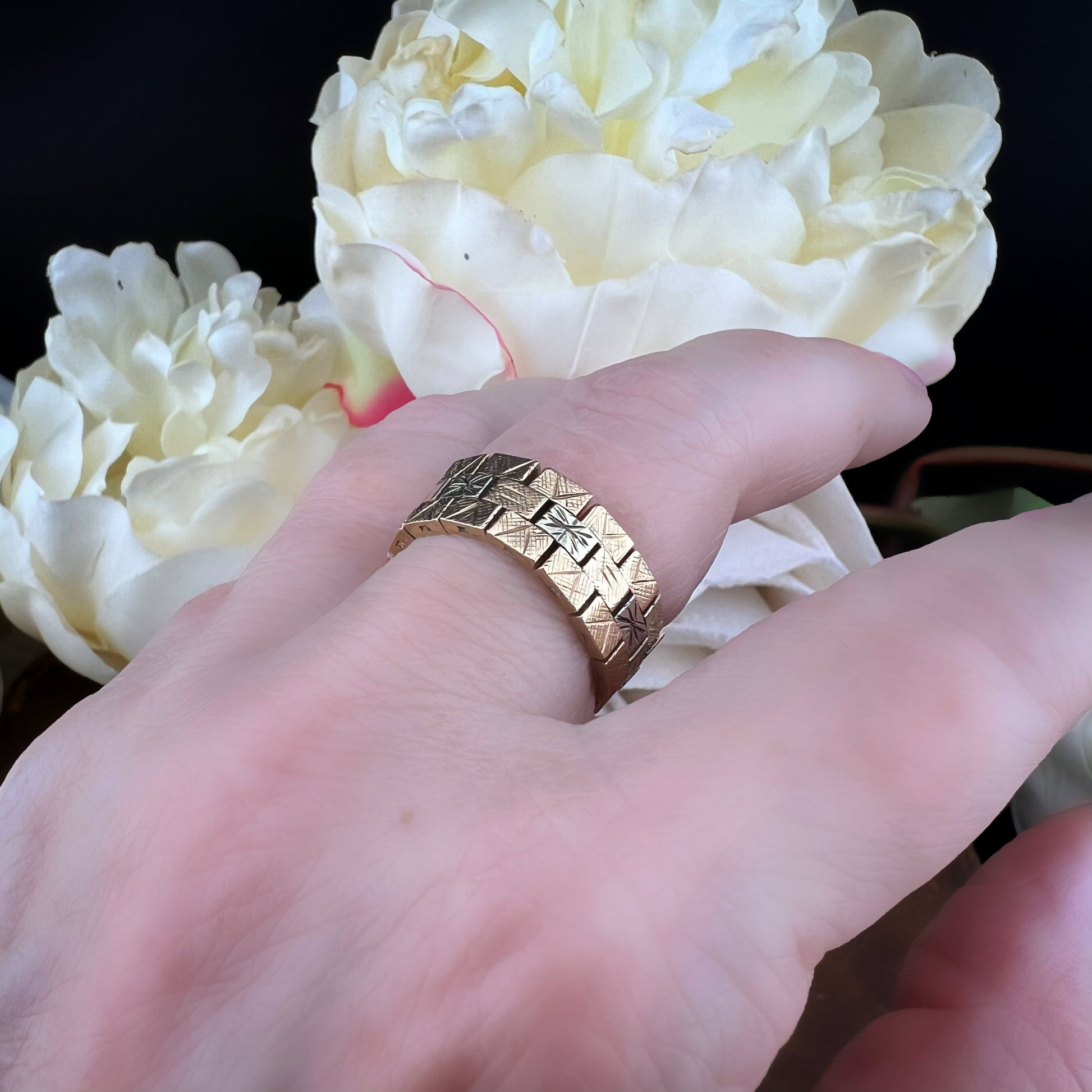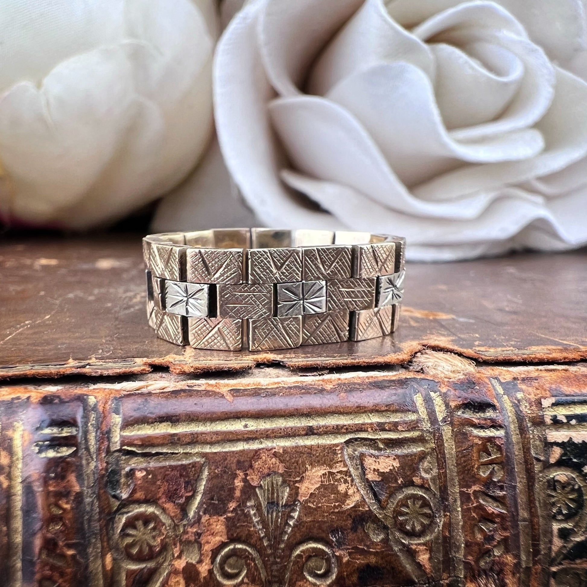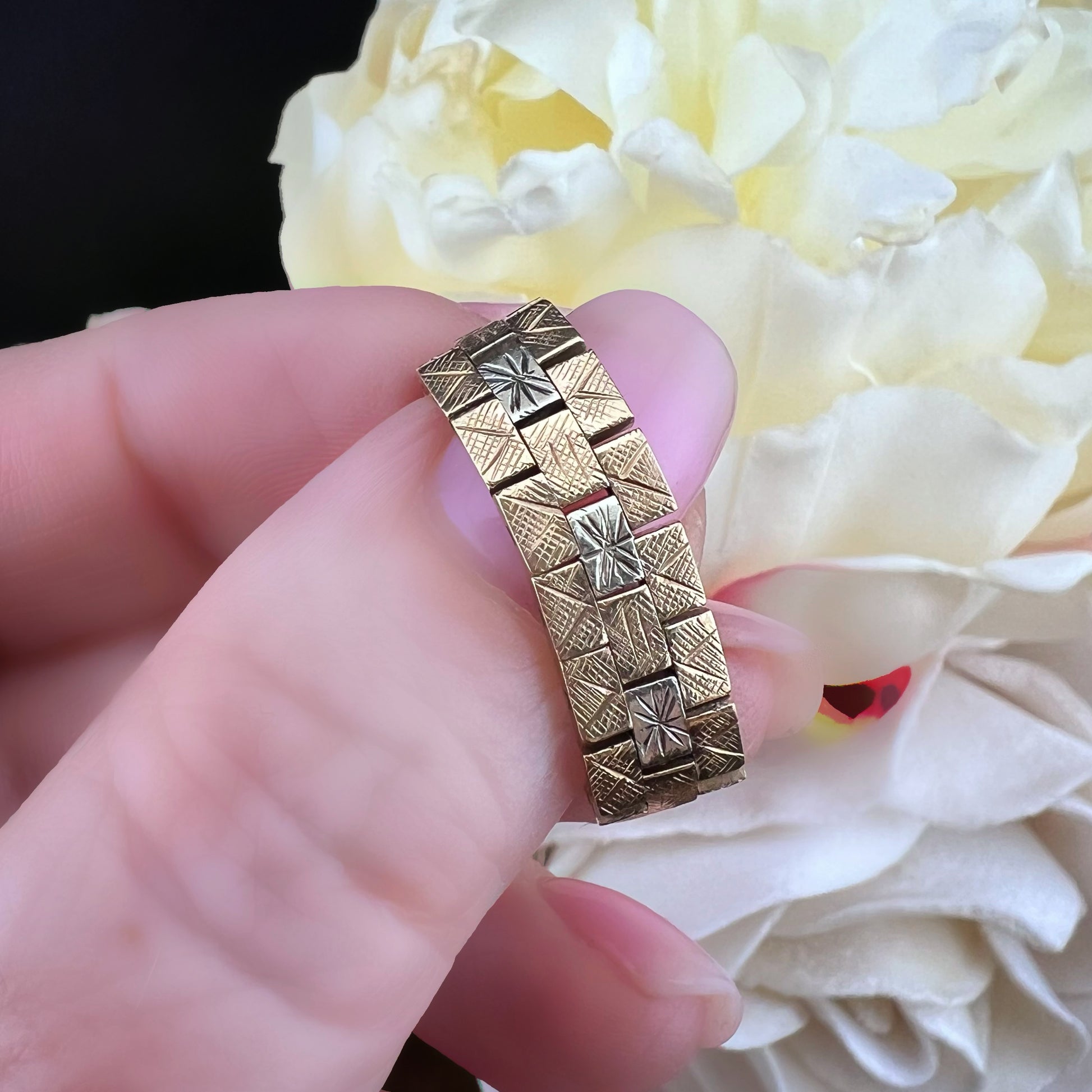 Dieser bezaubernde Vintage-Ring ist ein ikonisches Beispiel für den Retro-Stil der 1970er Jahre. Der Ring ist aus 9-karätigem Gelbgold mit teilweiser Rhodinierung gefertigt, um einen eleganten zweifarbigen Kontrast zwischen dem warmen Gelbgold und dem leuchtenden weißen Rhodium zu erzeugen. Er verfügt über rechteckige, klappbare Glieder, die mit fein eingravierten stilisierten Stern- oder Sonnenmotiven verziert sind. Dieses geometrische, gegliederte Design ruft eine kühne, moderne Ästhetik hervor, perfekt für alle, die einzigartige Stücke mit einem Hauch von Geschichte zu schätzen wissen. Der Ring ist flexibel und angenehm zu tragen, seine kompakte, strukturierte Optik macht ihn zu einem vielseitigen Accessoire, das sich ideal mit anderen Ringen kombinieren oder allein als Statement-Piece tragen lässt. Dieses aus England stammende Stück spiegelt die britische Handwerkskunst der Ära wider und vereint Haltbarkeit und Raffinesse. Ein Vintage-Schatz in ausgezeichnetem Zustand, bereit zum Weitergeben.