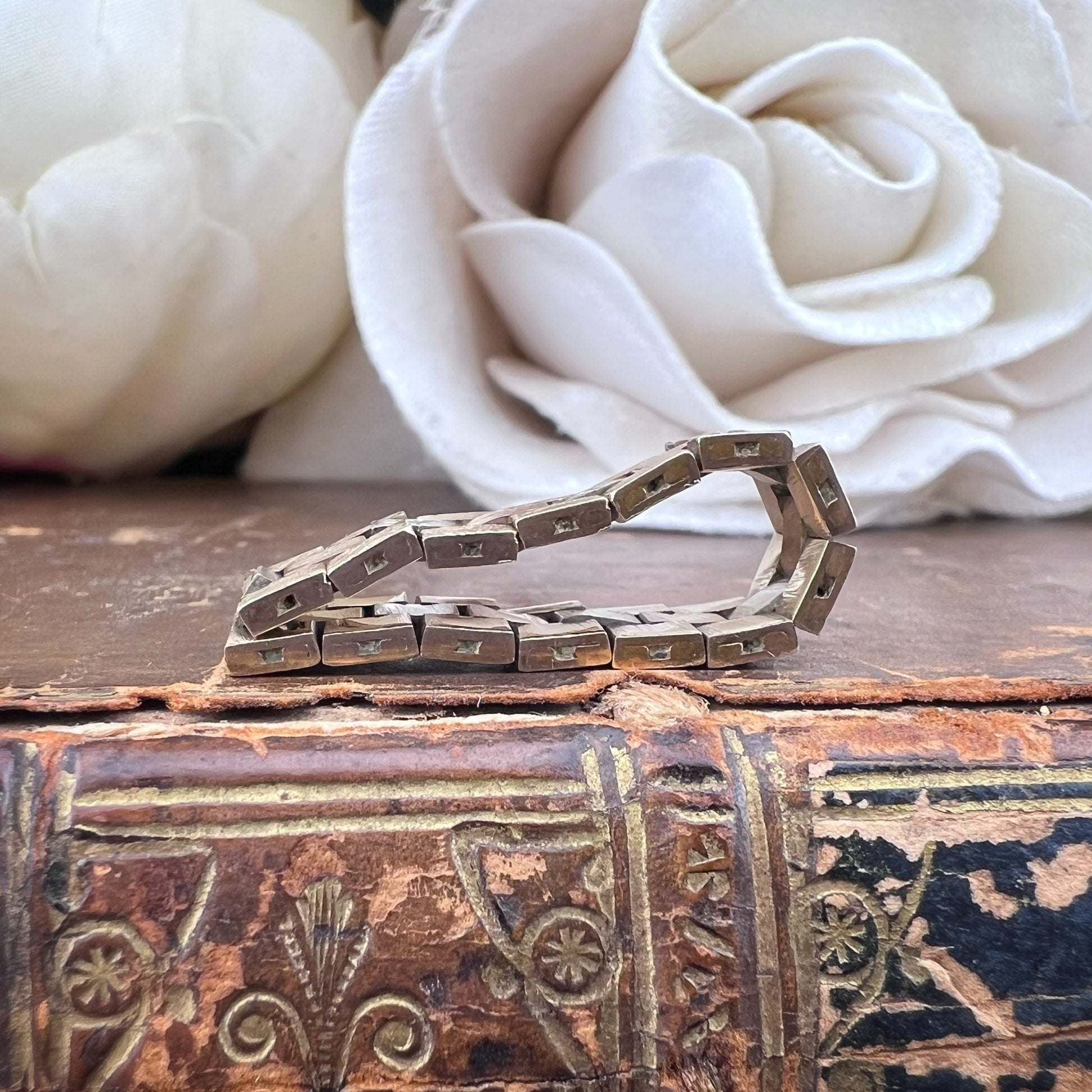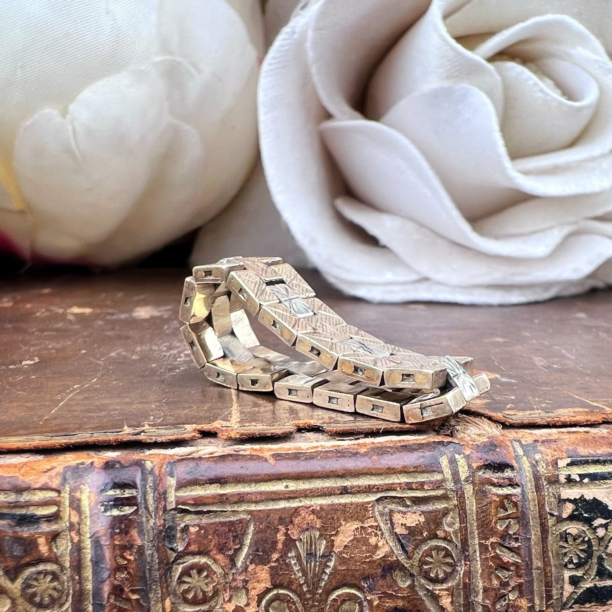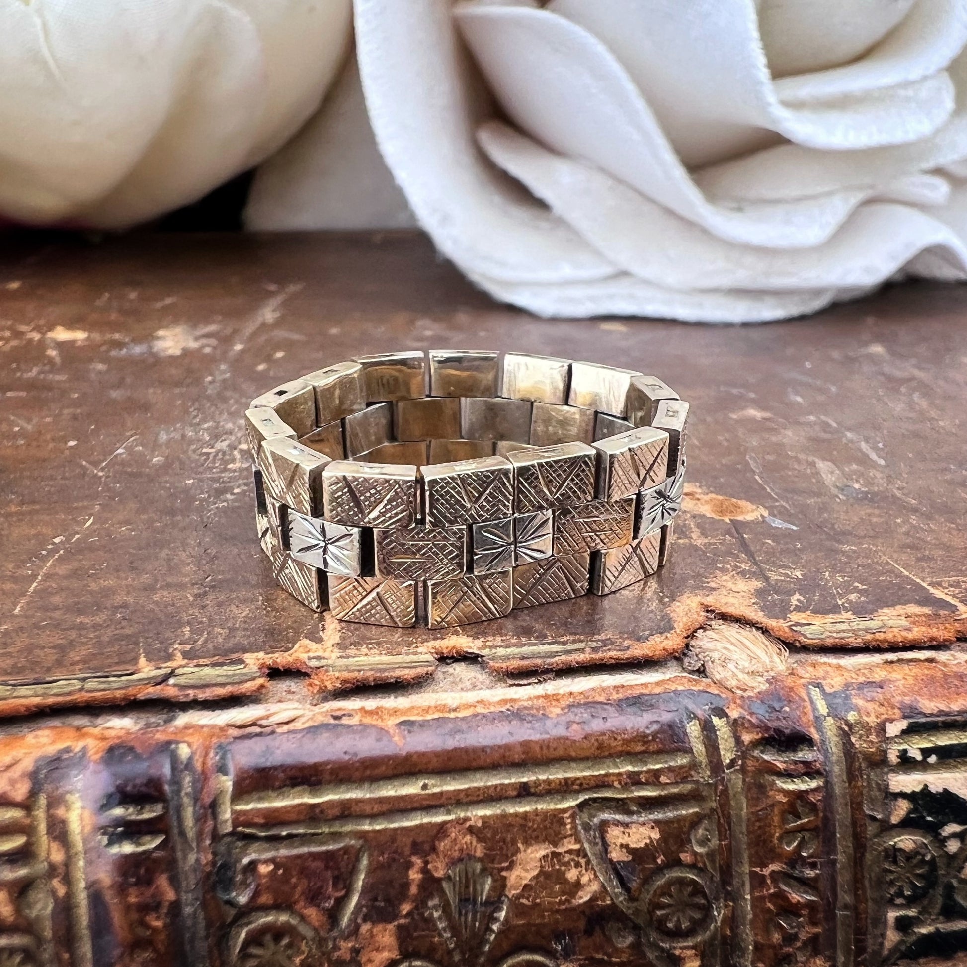 Dieser bezaubernde Vintage-Ring ist ein ikonisches Beispiel für den Retro-Stil der 1970er Jahre. Der Ring ist aus 9-karätigem Gelbgold mit teilweiser Rhodinierung gefertigt, um einen eleganten zweifarbigen Kontrast zwischen dem warmen Gelbgold und dem leuchtenden weißen Rhodium zu erzeugen. Er verfügt über rechteckige, klappbare Glieder, die mit fein eingravierten stilisierten Stern- oder Sonnenmotiven verziert sind. Dieses geometrische, gegliederte Design ruft eine kühne, moderne Ästhetik hervor, perfekt für alle, die einzigartige Stücke mit einem Hauch von Geschichte zu schätzen wissen. Der Ring ist flexibel und angenehm zu tragen, seine kompakte, strukturierte Optik macht ihn zu einem vielseitigen Accessoire, das sich ideal mit anderen Ringen kombinieren oder allein als Statement-Piece tragen lässt. Dieses aus England stammende Stück spiegelt die britische Handwerkskunst der Ära wider und vereint Haltbarkeit und Raffinesse. Ein Vintage-Schatz in ausgezeichnetem Zustand, bereit zum Weitergeben.