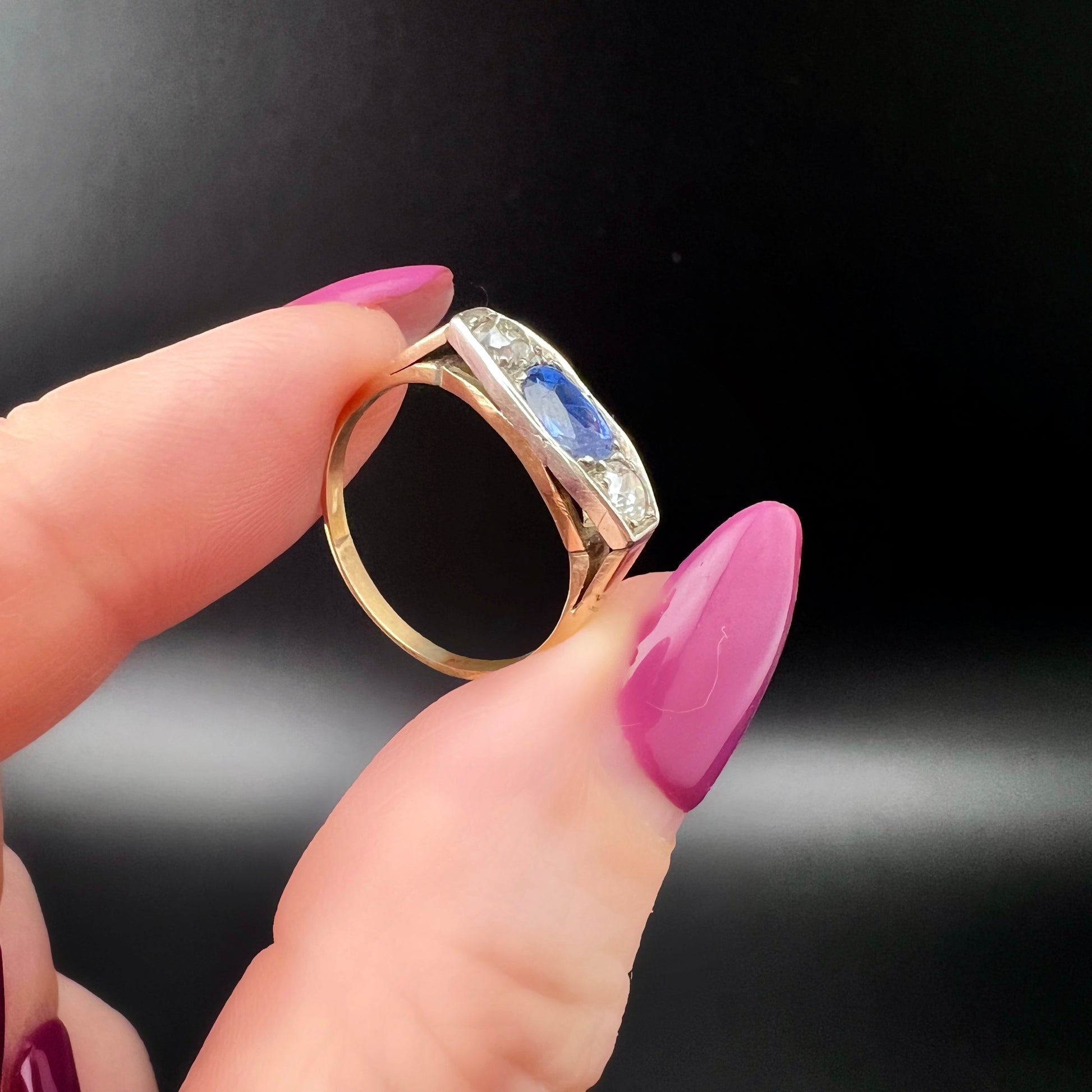 Trilogie-Ring aus 14 Karat Gold mit Saphir und alten Minendiamanten