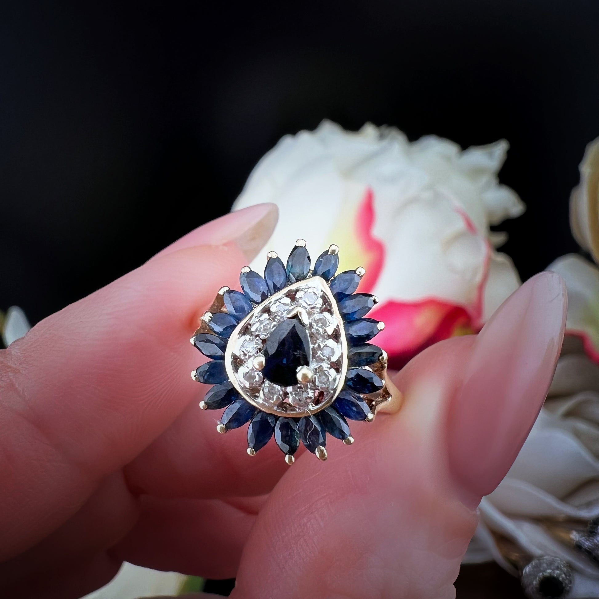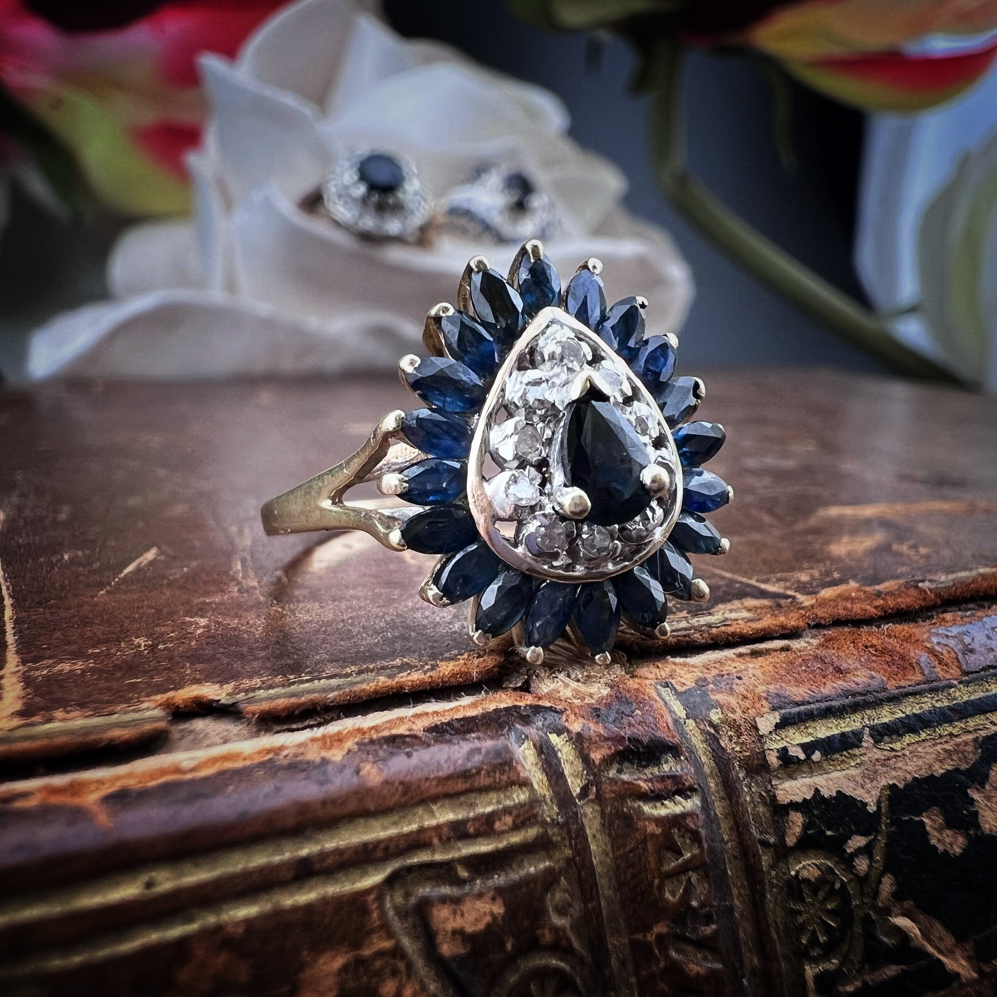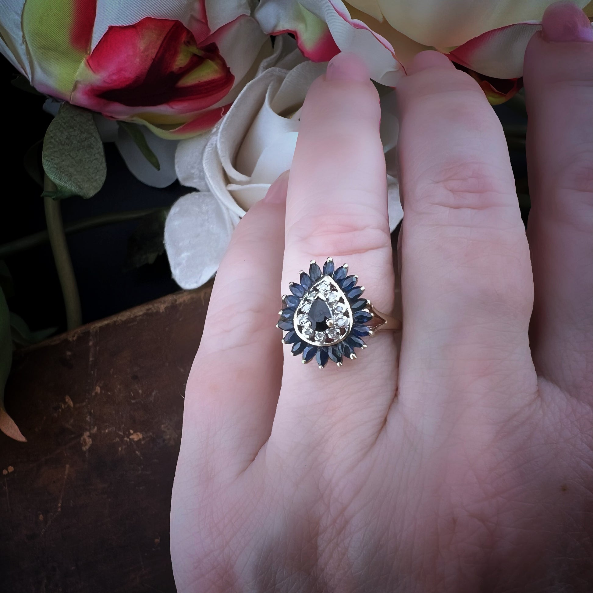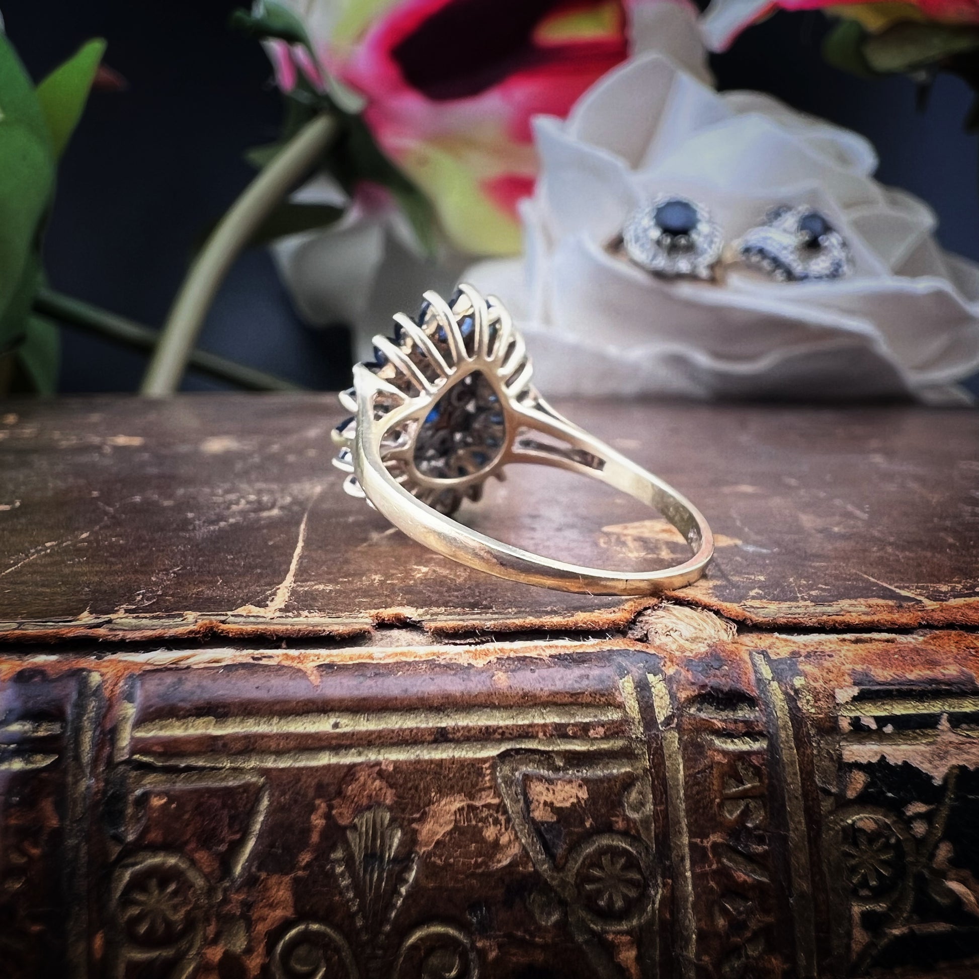 Vintage-Tropfenring mit Saphir und Diamant – London 1989