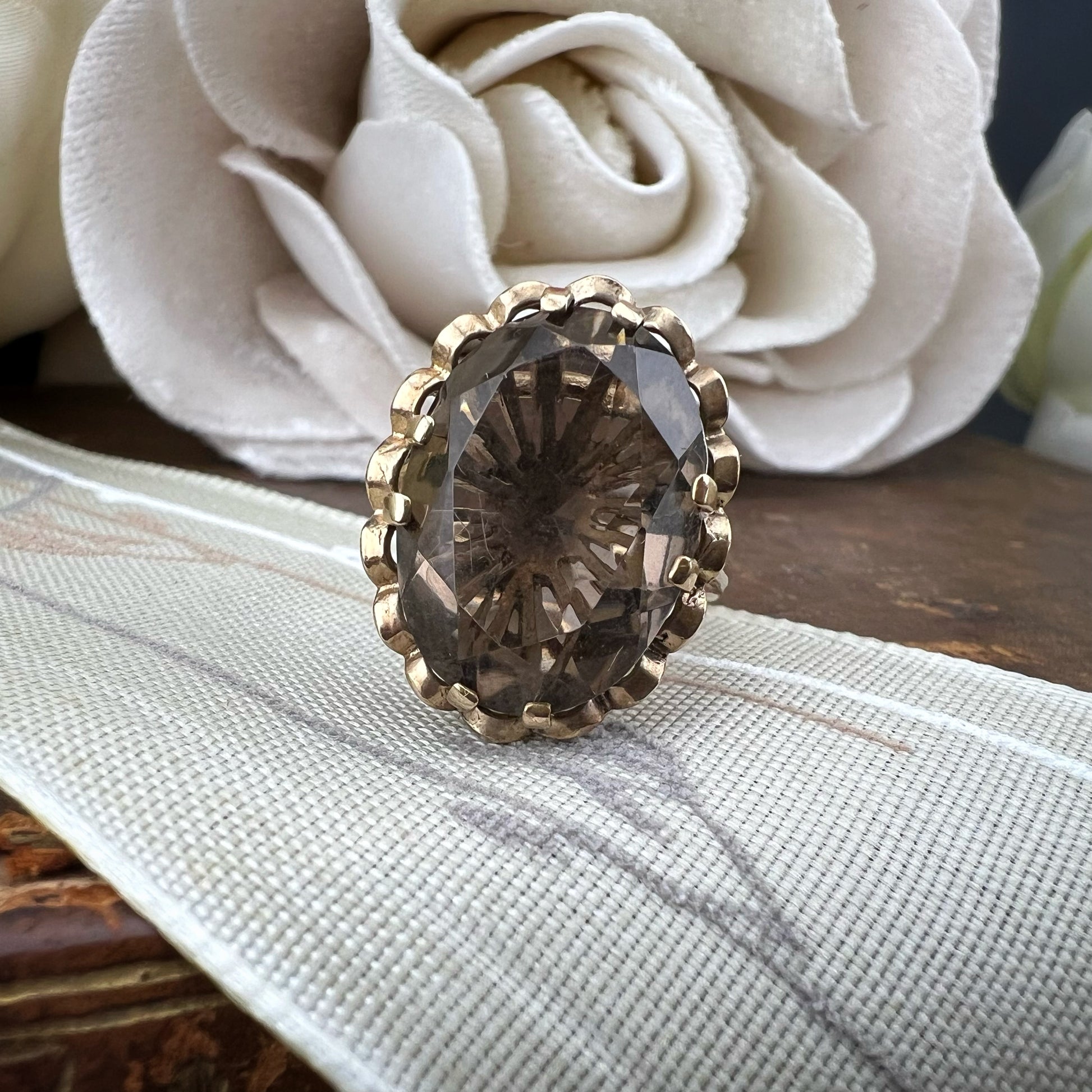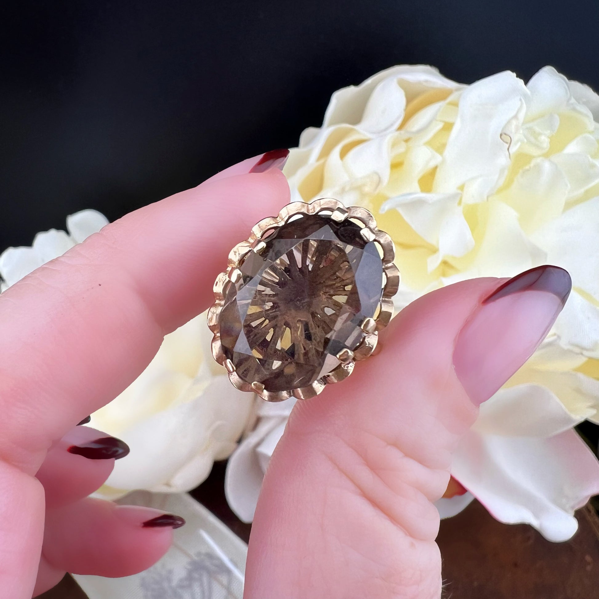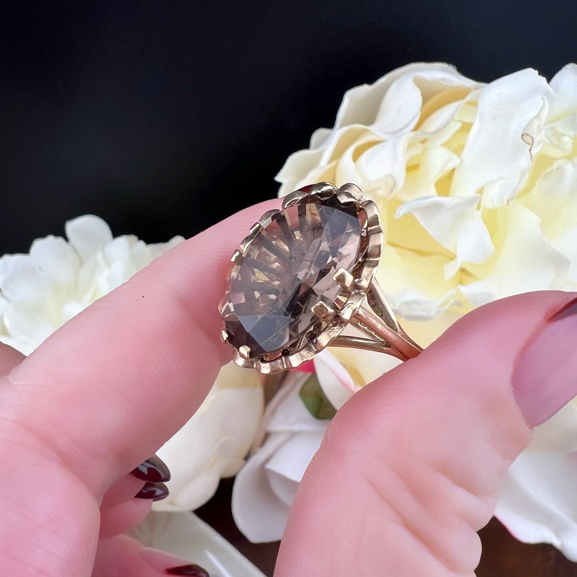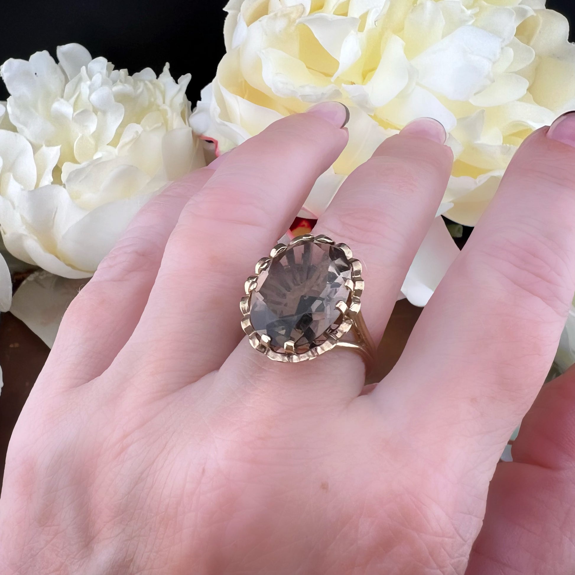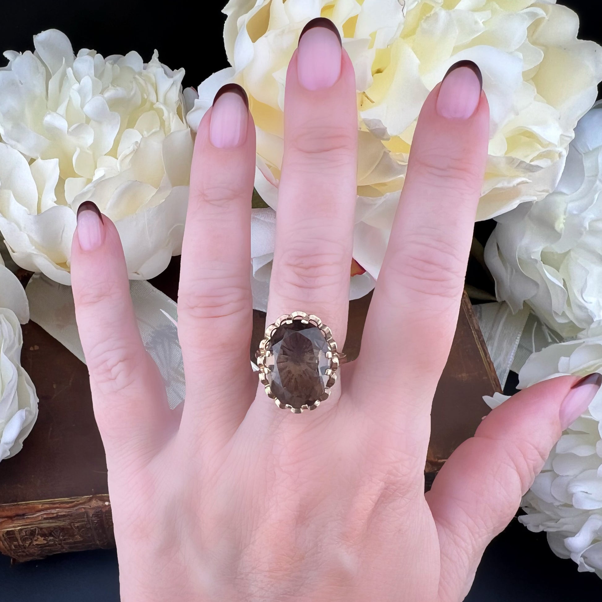 Ein bezaubernder Vintage-Cocktailring aus 9-karätigem Gelbgold, verziert mit einem prächtigen ovalen Kaffeequarz von ca. 9,45 ct.