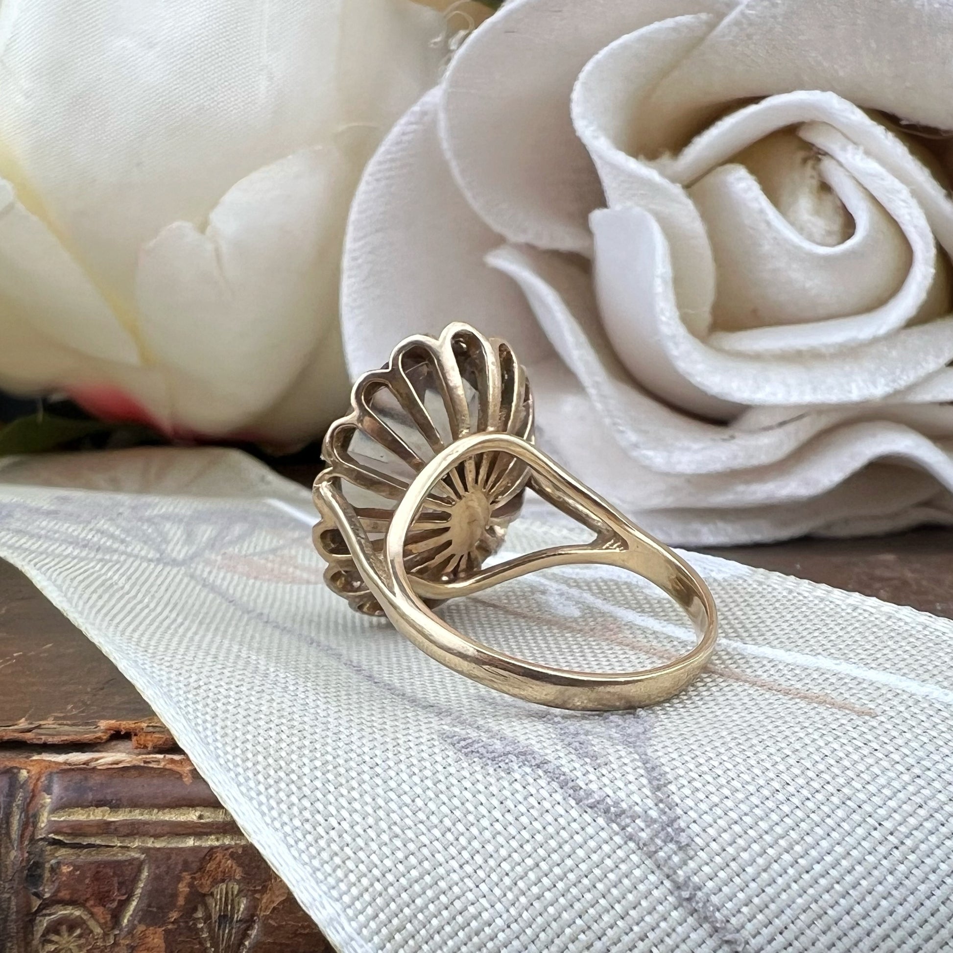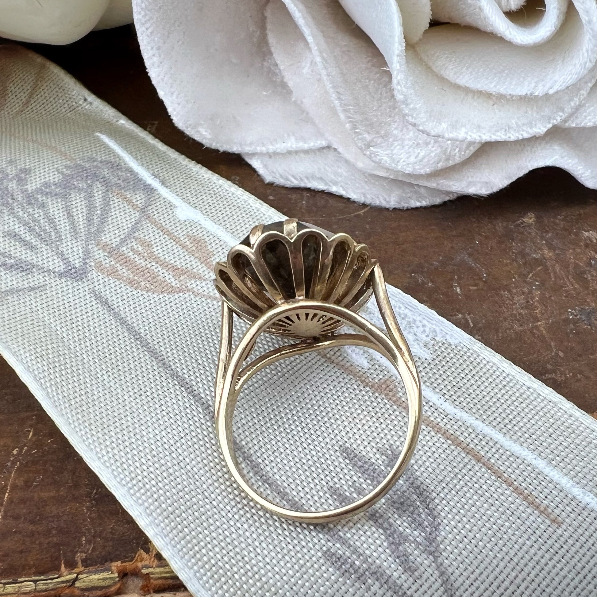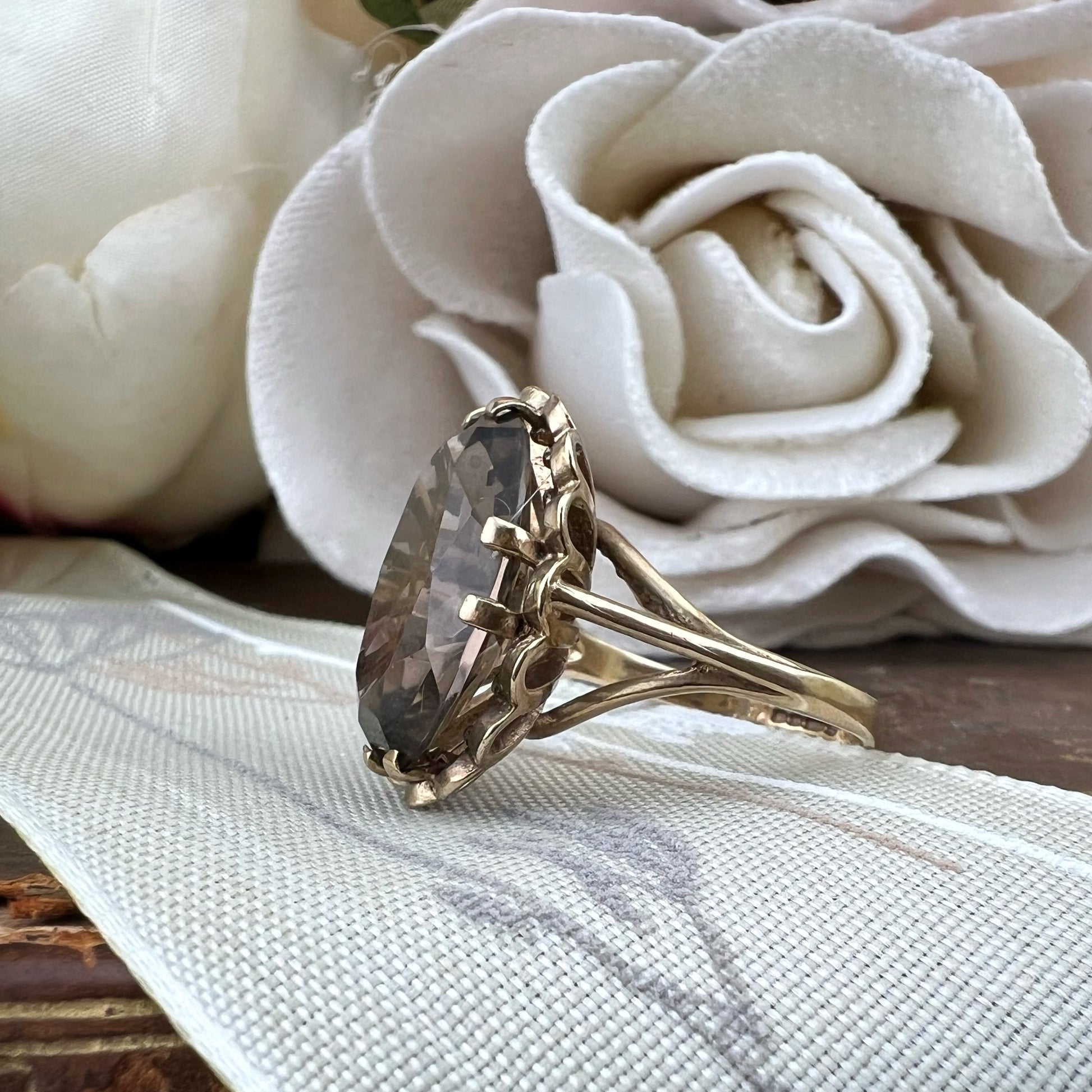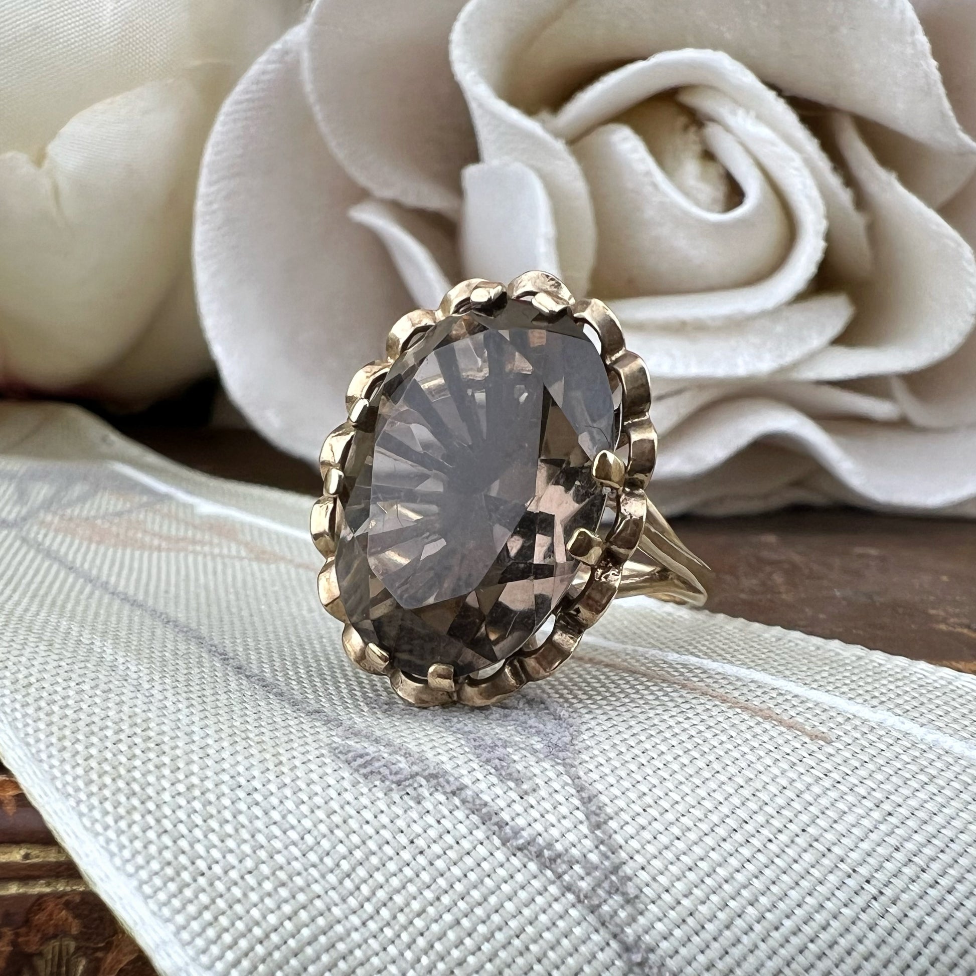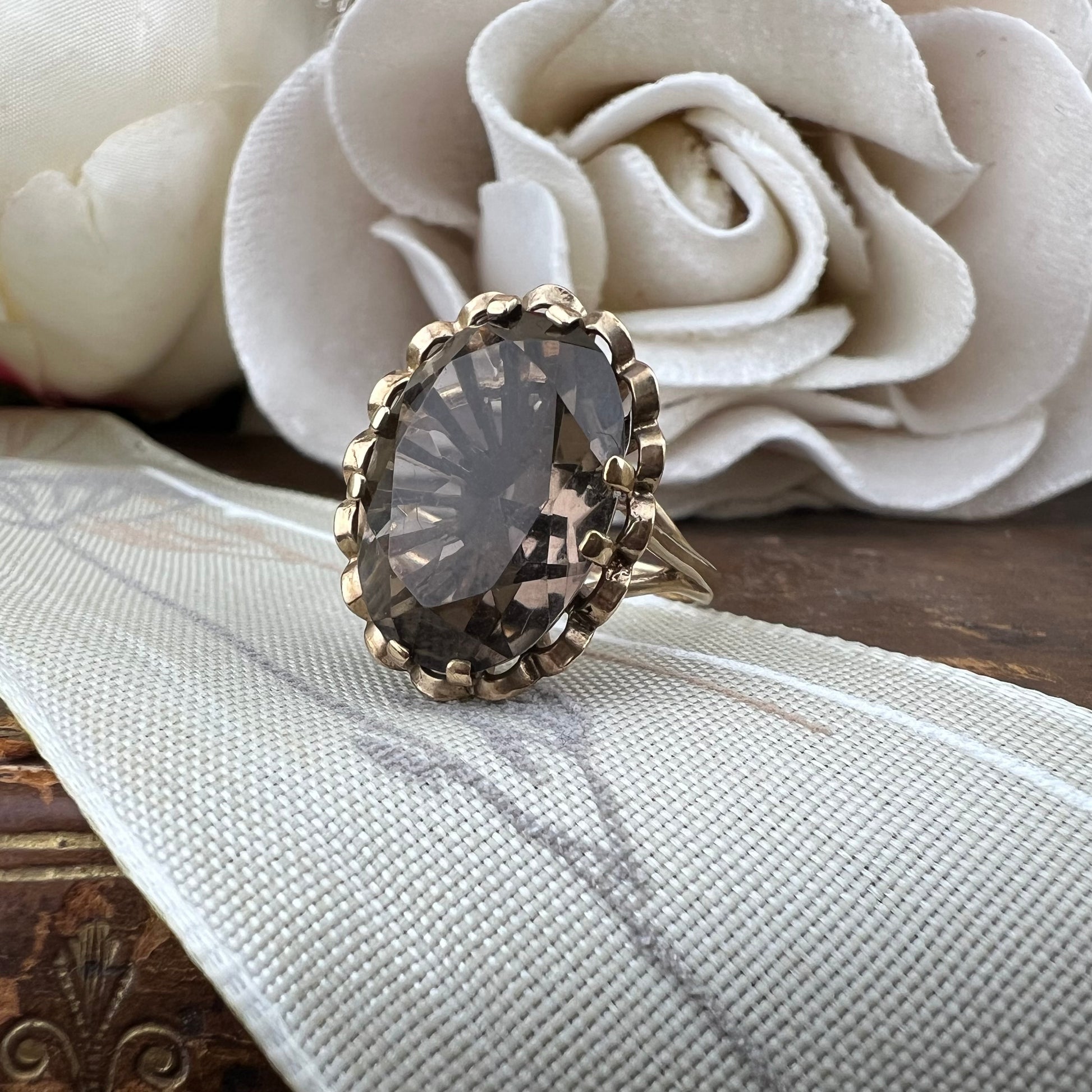 Ein bezaubernder Vintage-Cocktailring aus 9-karätigem Gelbgold, verziert mit einem prächtigen ovalen Kaffeequarz von ca. 9,45 ct.