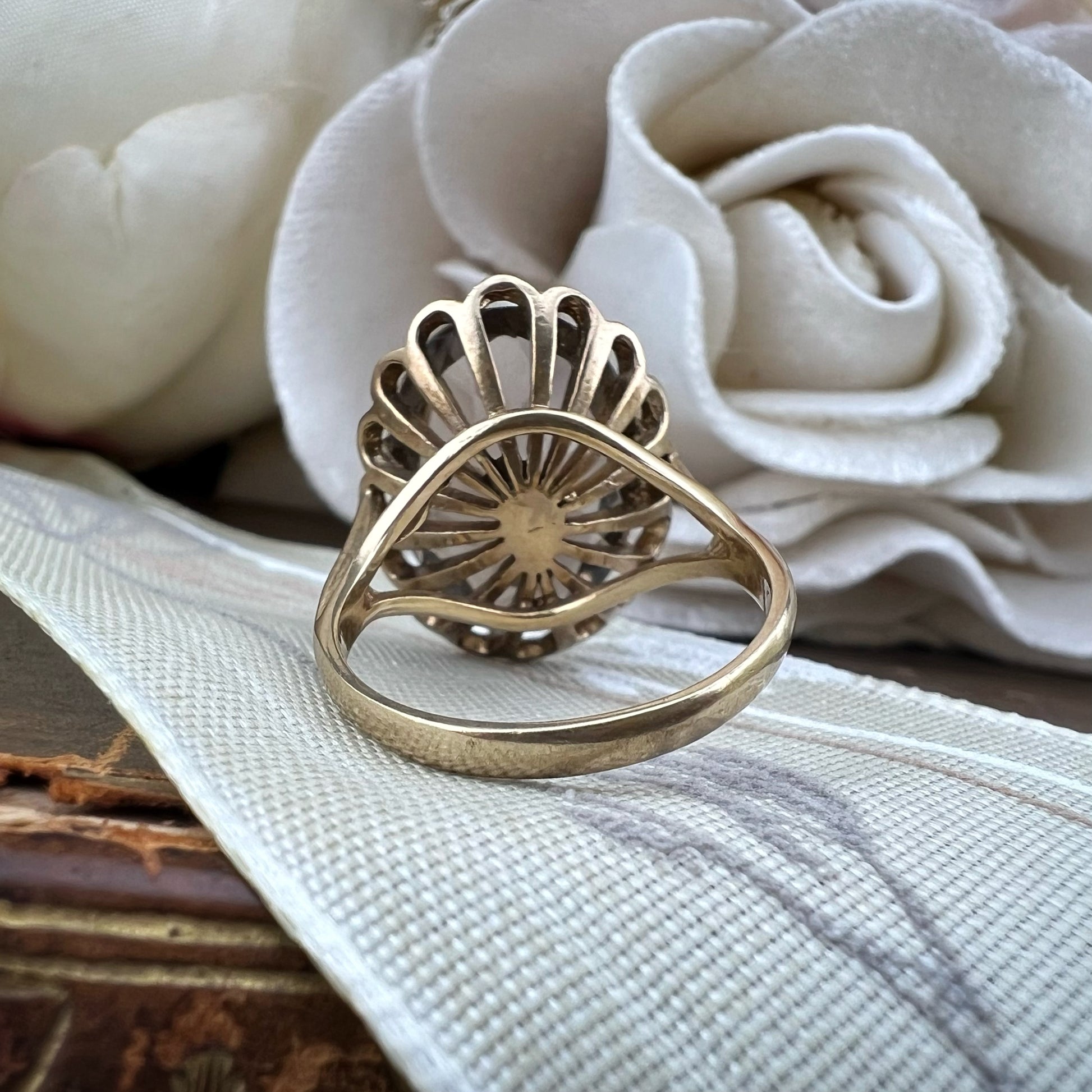 Ein Schmuckstück, das die dramatische Kraft großer farbiger Steine mit dem typischen Stil der 70er Jahre verbindet, perfekt für alle, die gerne Statement-Ringe mit Charakter und Persönlichkeit tragen.