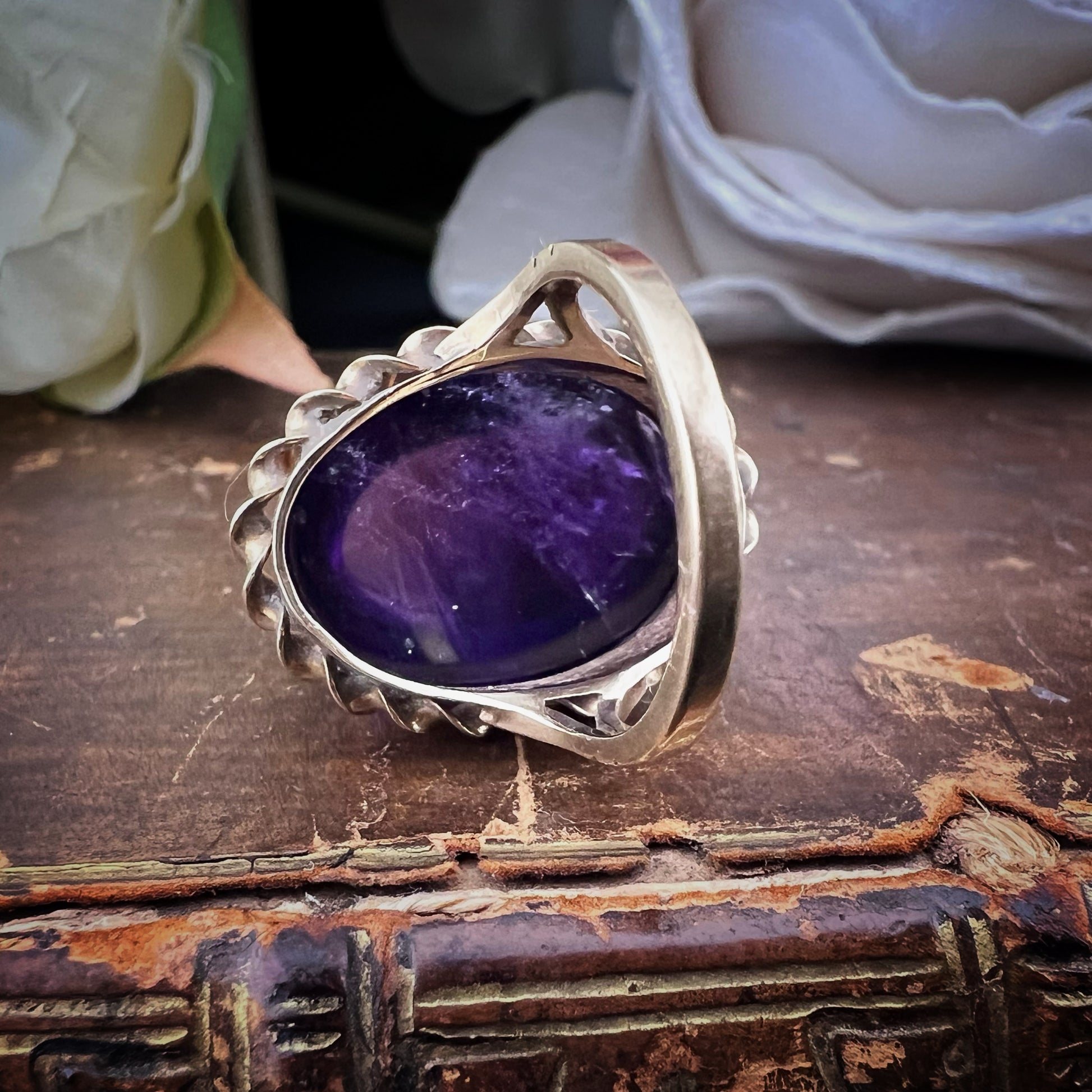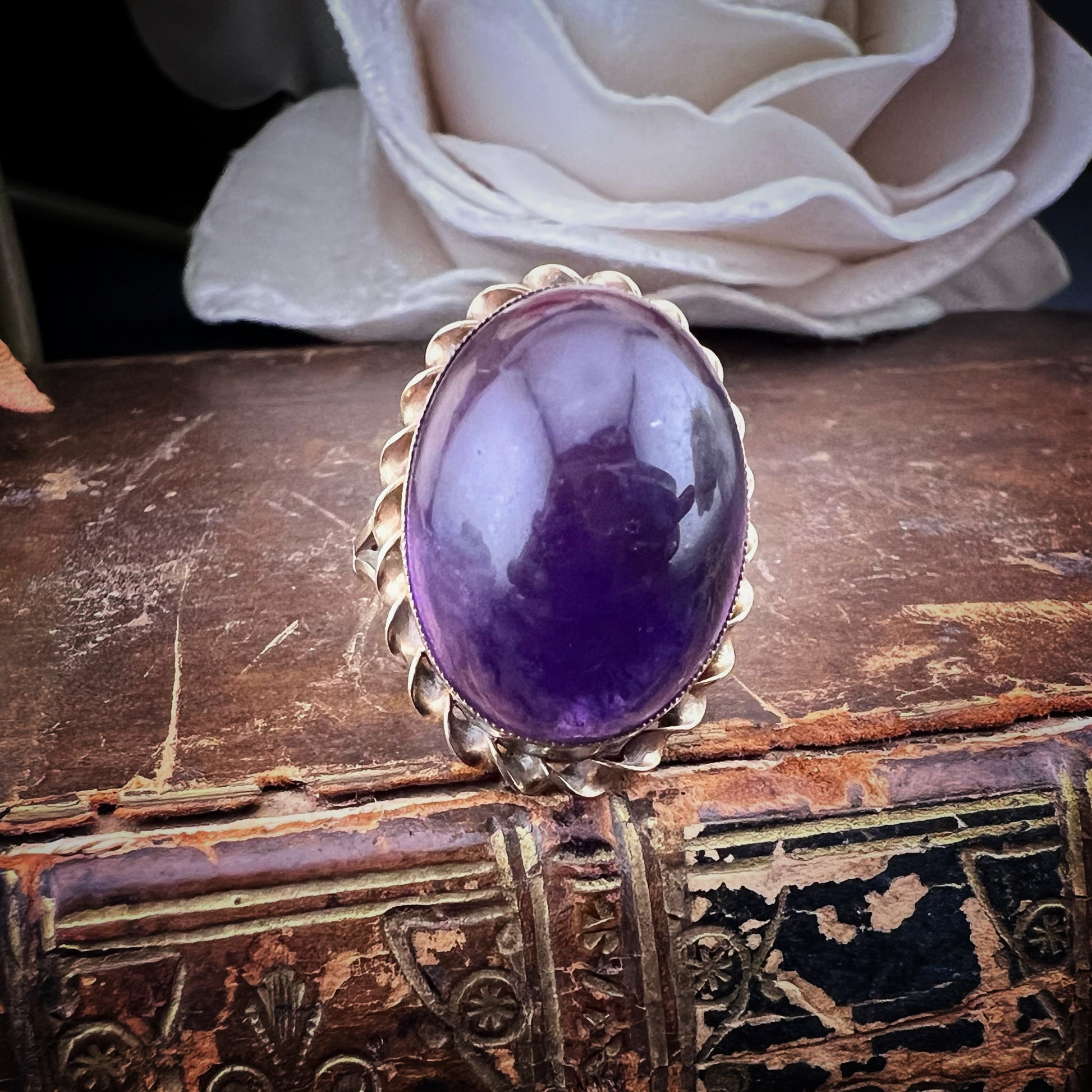 Der unangefochtene Star ist der imposante ovale Amethyst-Cabochon mit seiner außergewöhnlichen Farbtiefe: Die dunkleren Farbtöne im Inneren des Edelsteins erzeugen faszinierende Lichtspiele und verleihen jeder Handbewegung eine Aura des Geheimnisvollen und Einzigartigen.