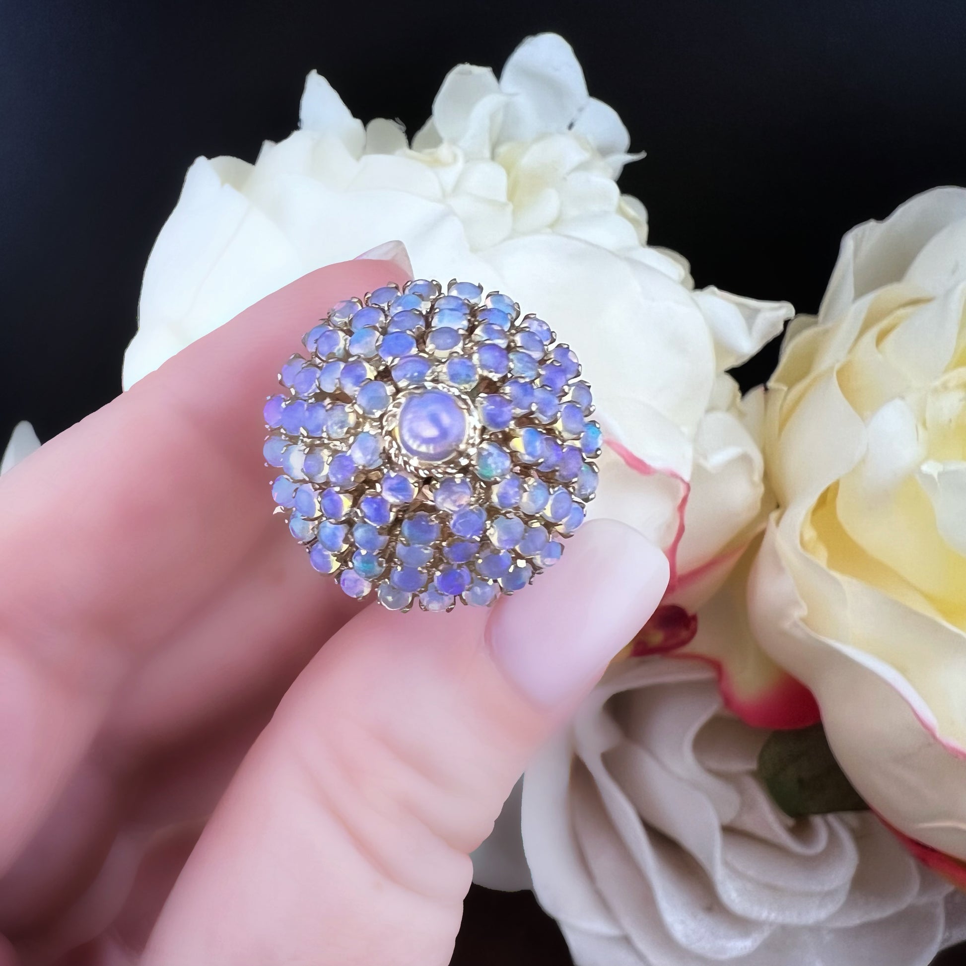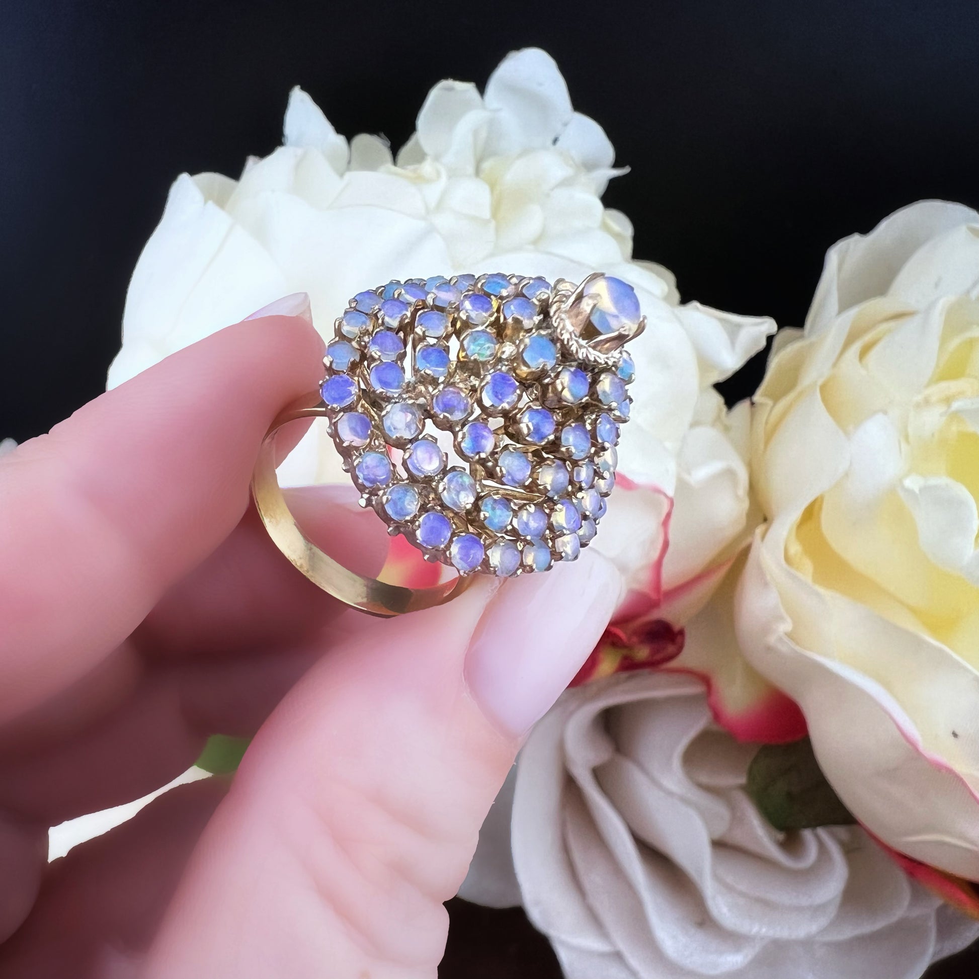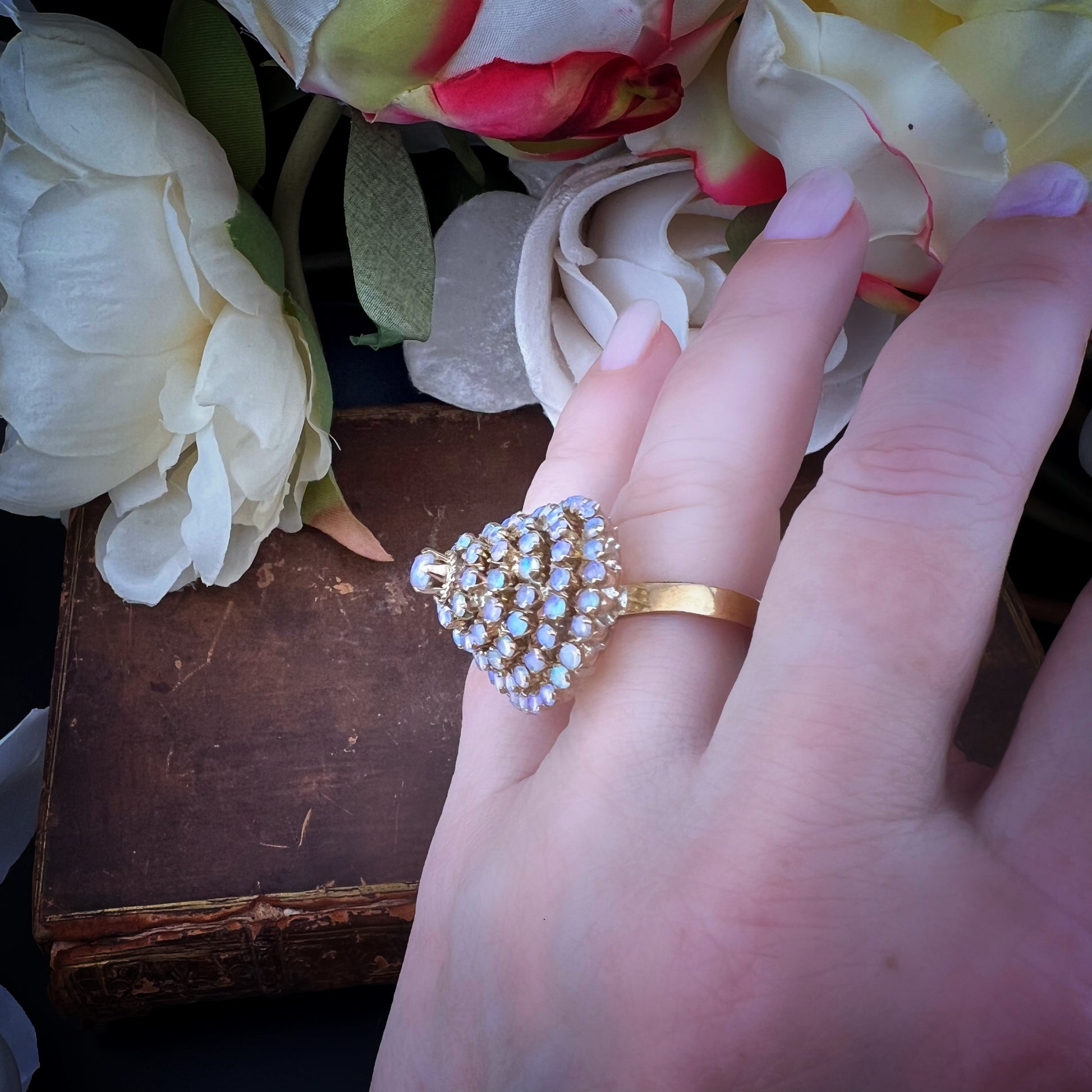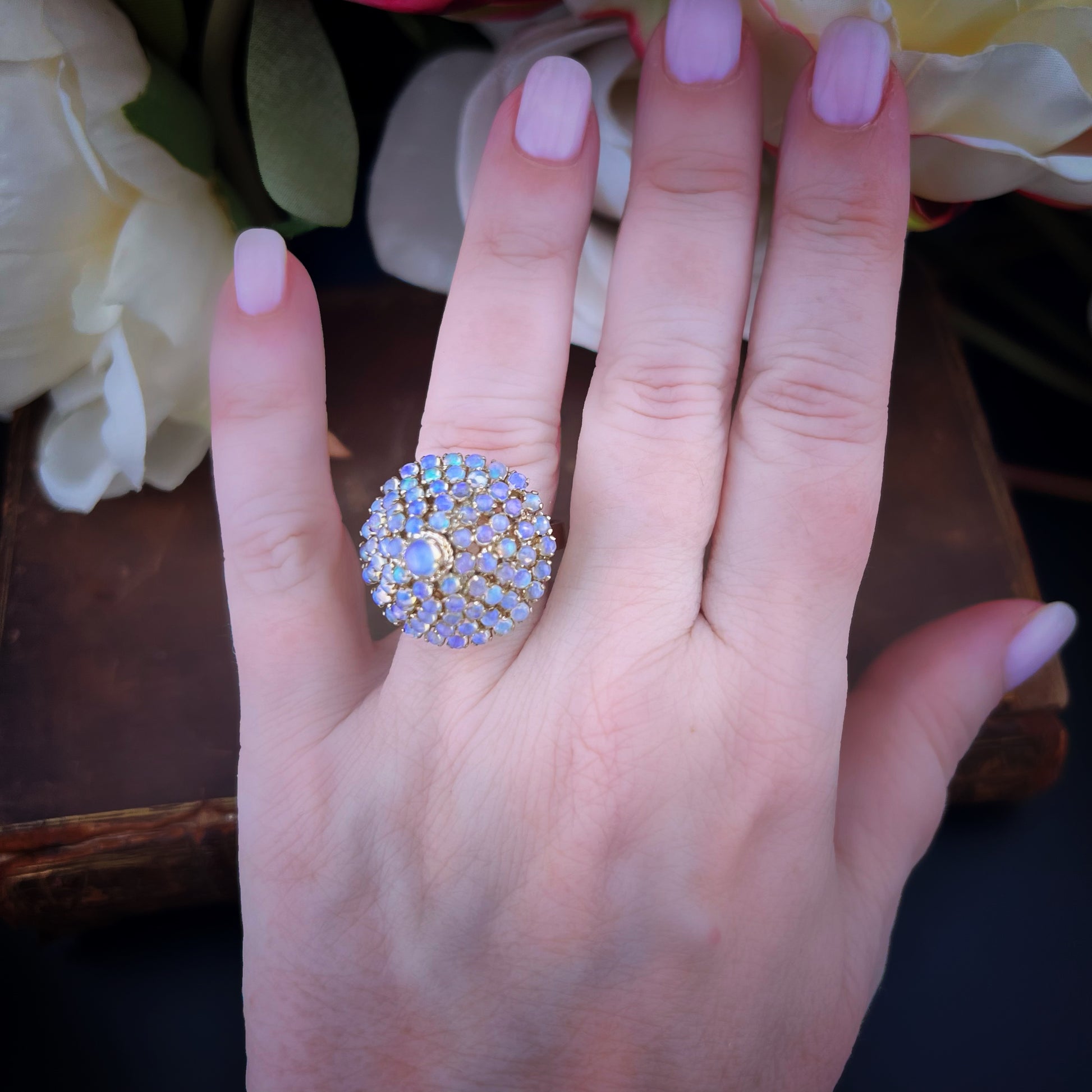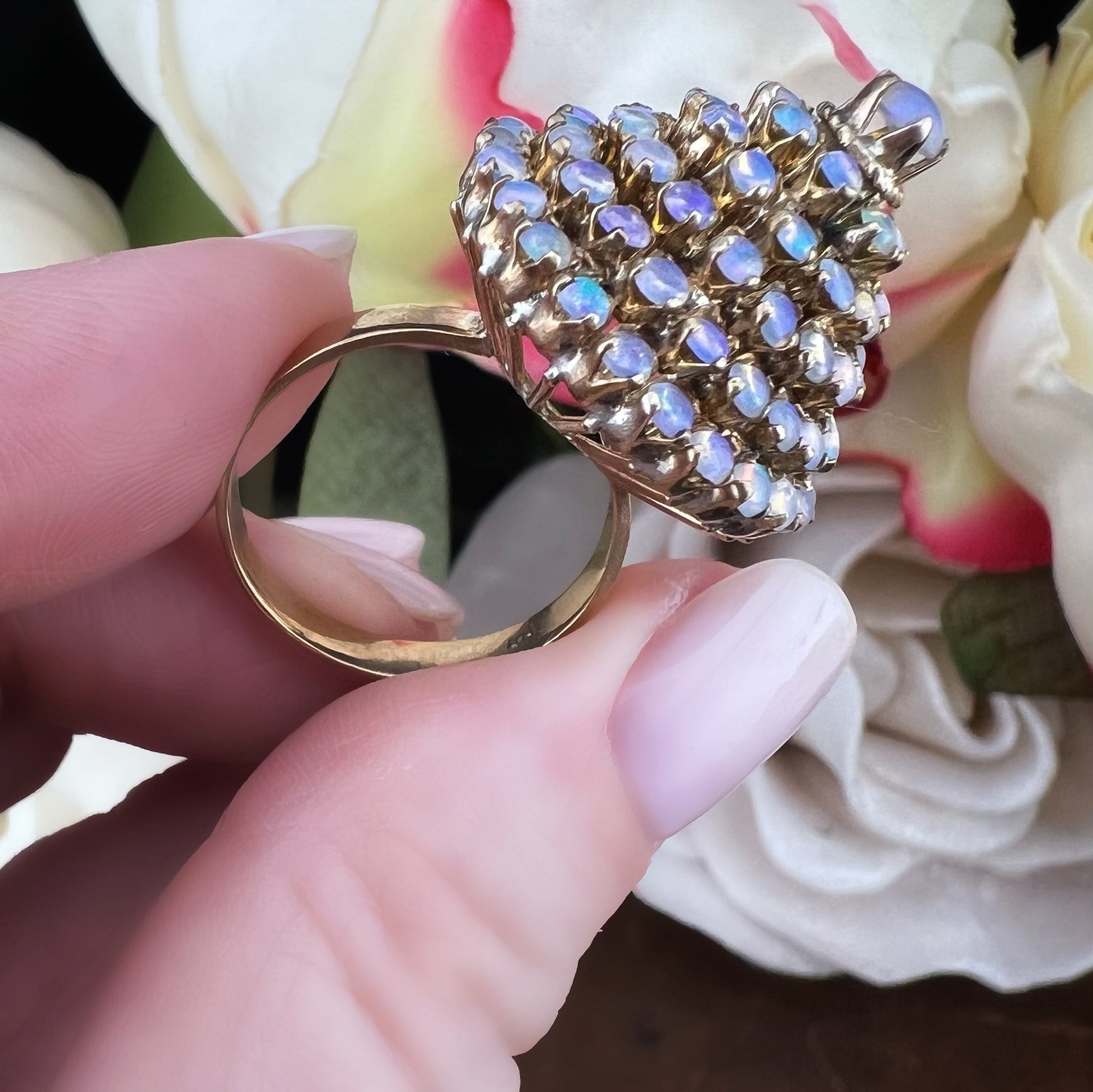 Dieser Vintage-Opalring ist ein auffälliges, seltenes und faszinierendes Schmuckstück. Er ist aus 14-karätigem Gelbgold gefertigt und verfügt über eine dramatische gewölbte Fassung aus 81 natürlichen Cabochon-Opalen.
