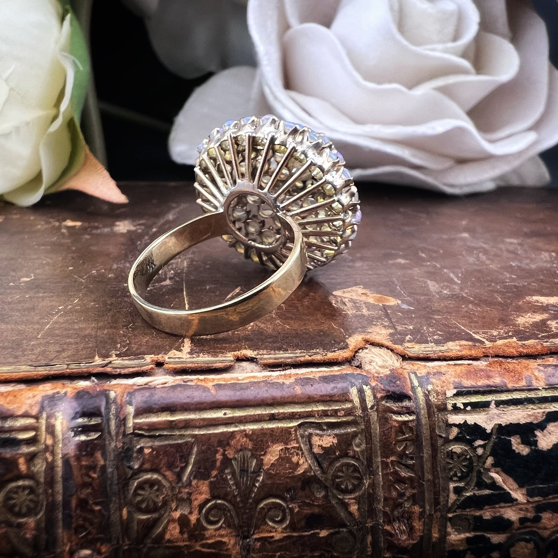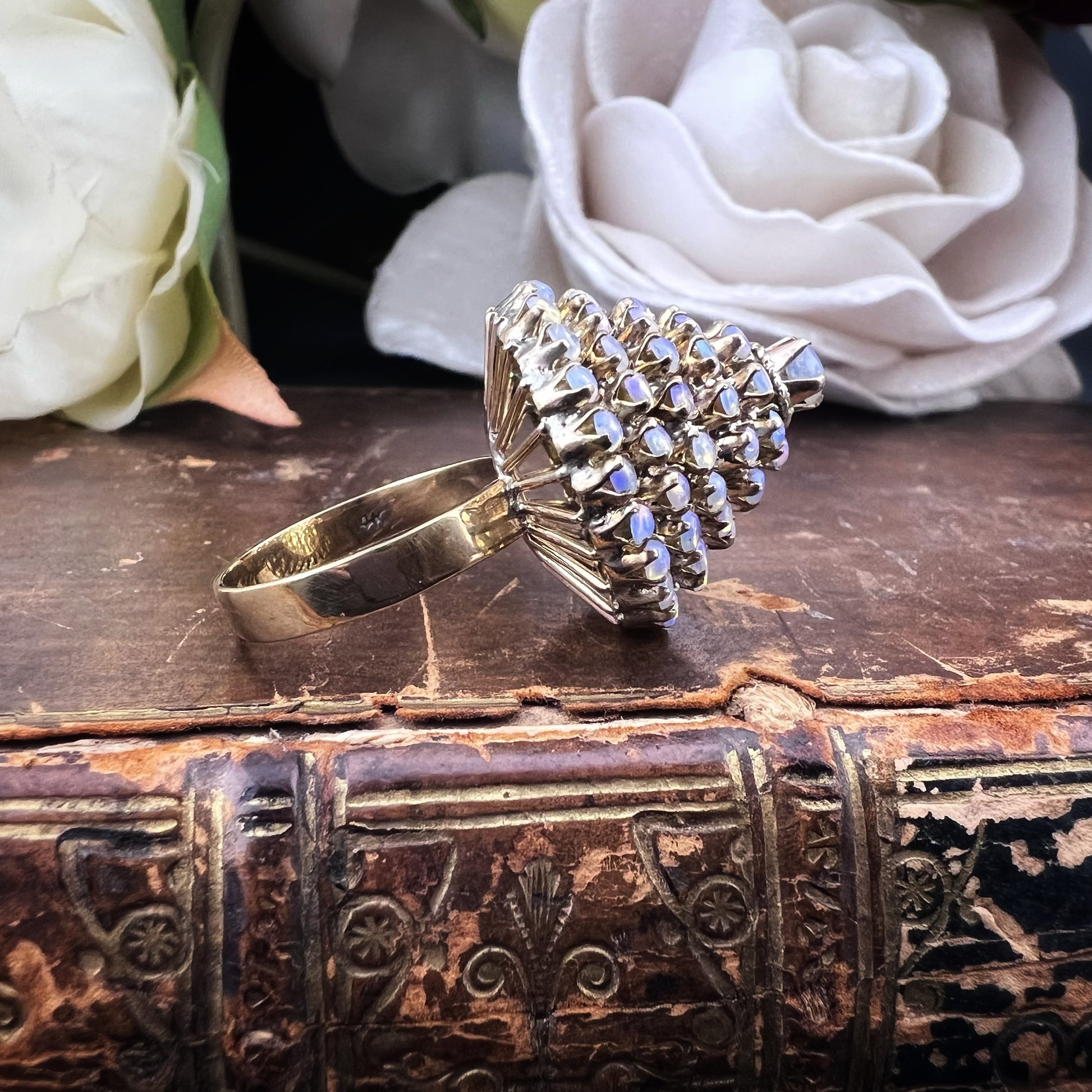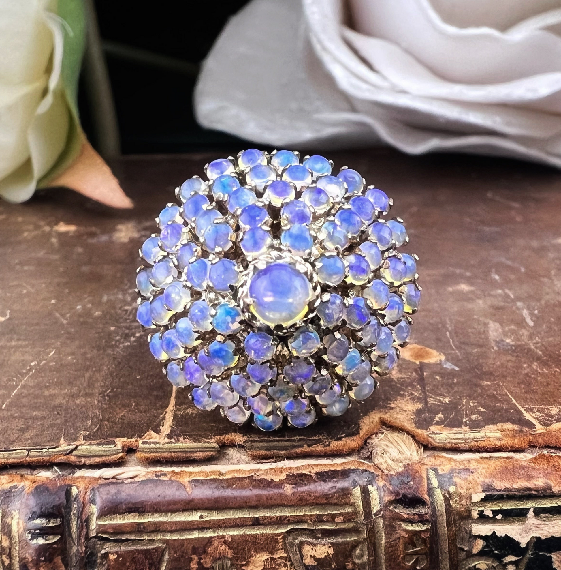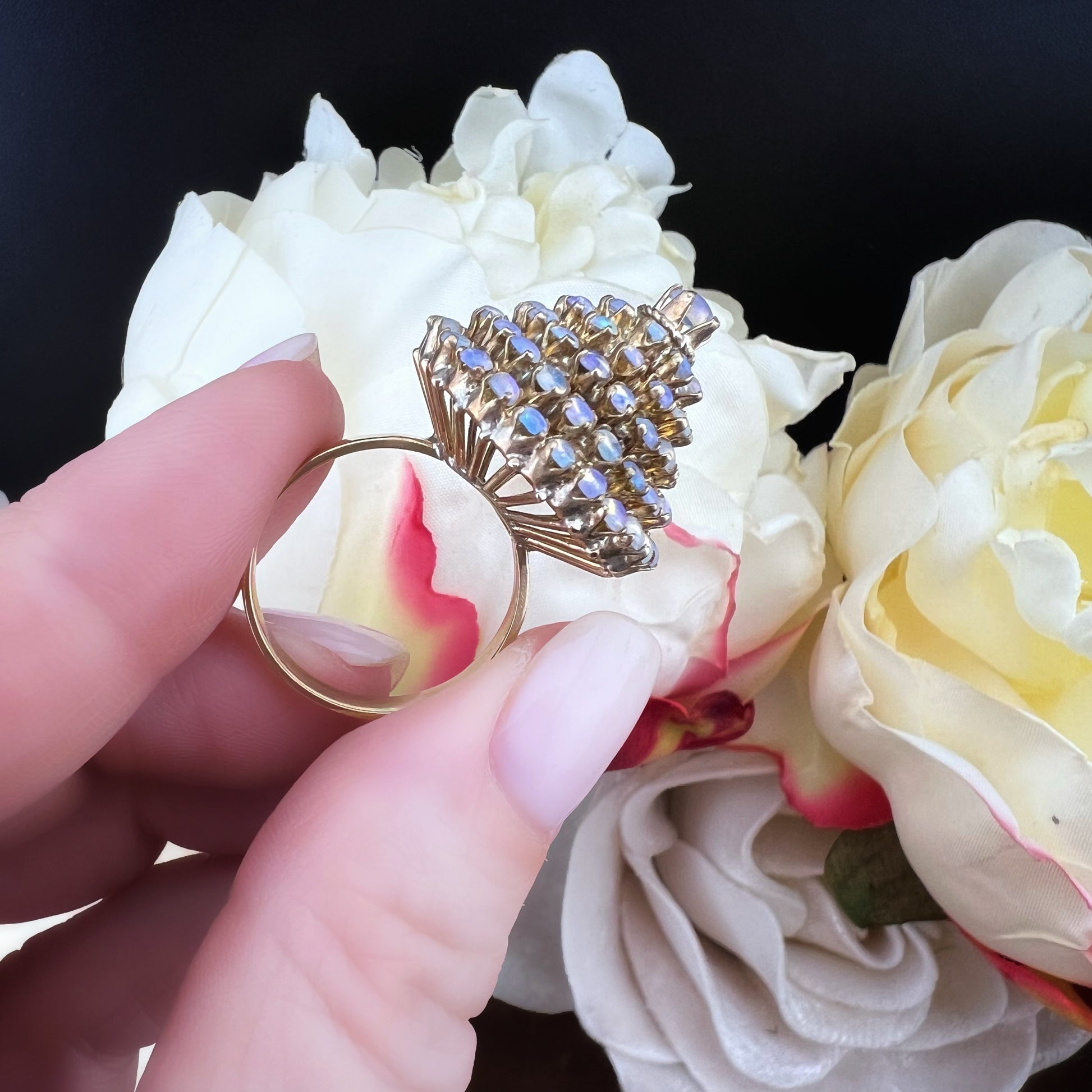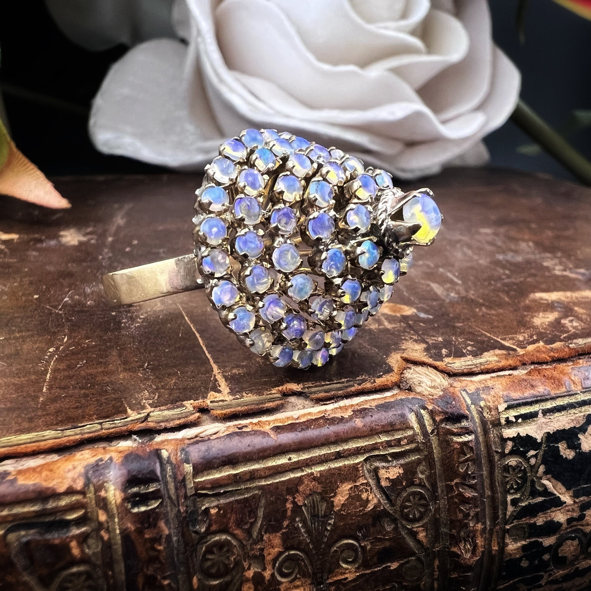 Dieser Vintage-Opalring ist ein auffälliges, seltenes und faszinierendes Schmuckstück. Er ist aus 14-karätigem Gelbgold gefertigt und verfügt über eine dramatische gewölbte Fassung aus 81 natürlichen Cabochon-Opalen.