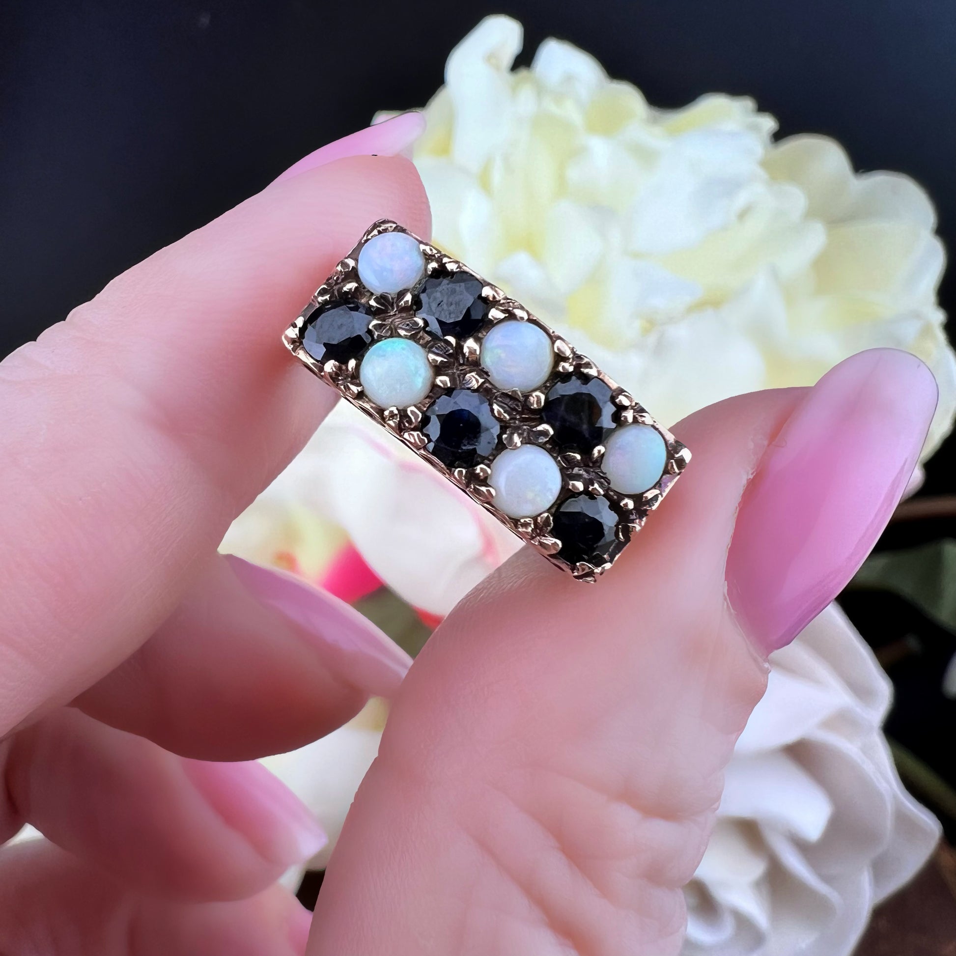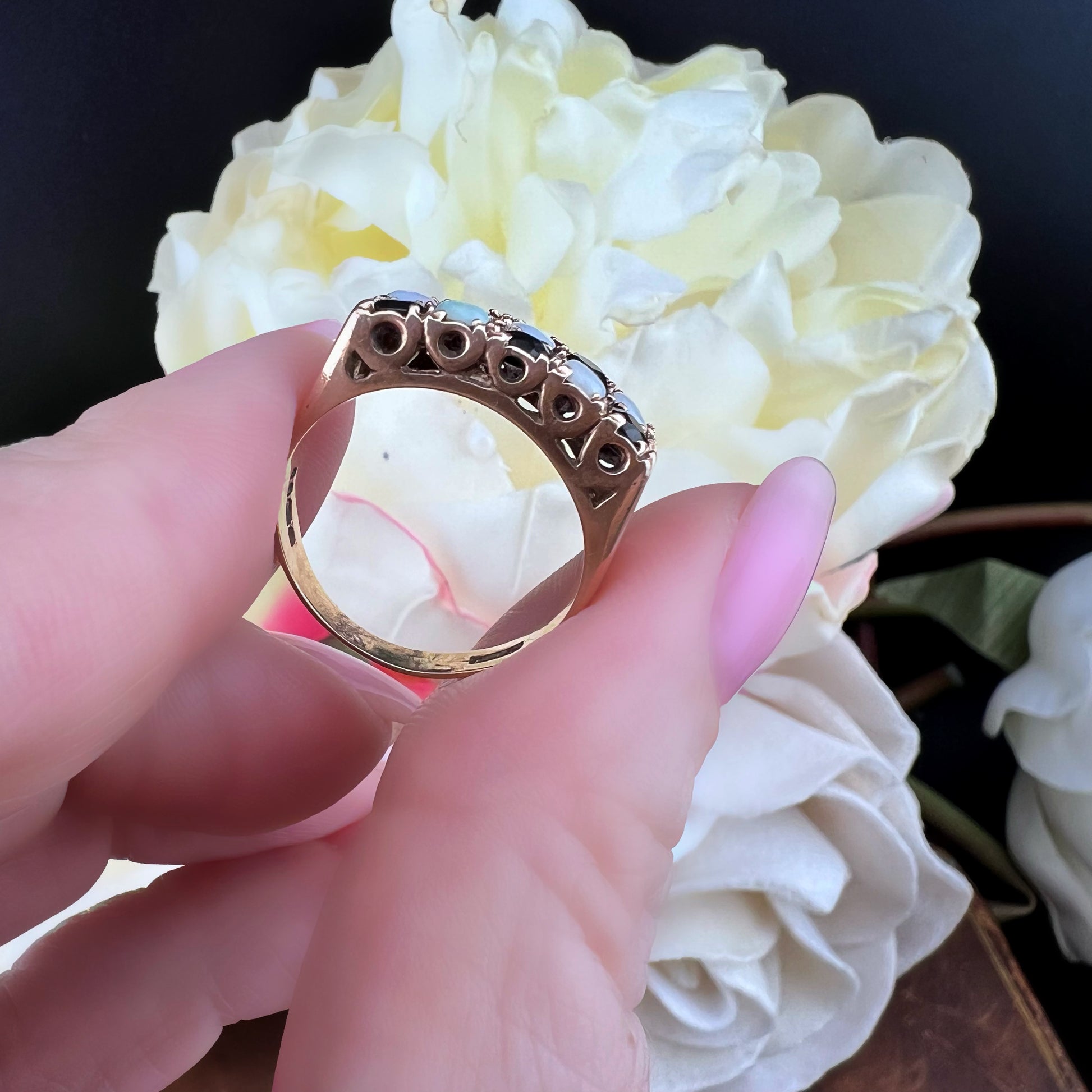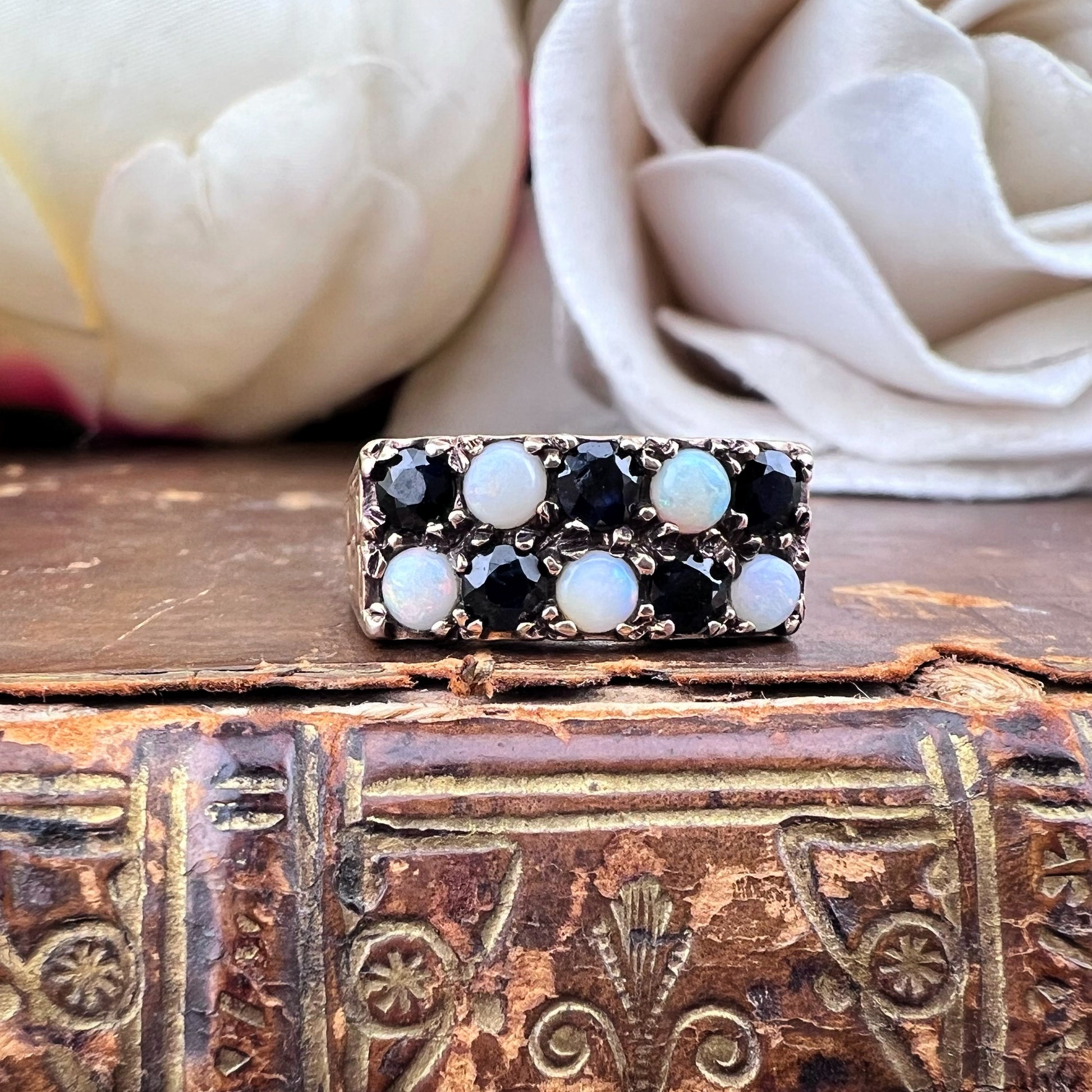Ein wahres Juwel, das die Essenz von Retro-Glamour mit einem Hauch schillernder Magie einfängt. Stellen Sie sich fünf runde Cabochon-Opale mit ihren schillernden Reflexen vor, die sich mit fünf runden, intensiv blauen Saphiren abwechseln.