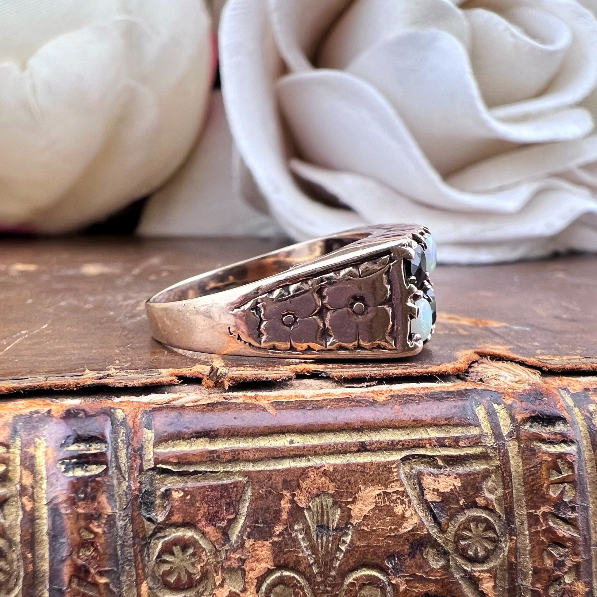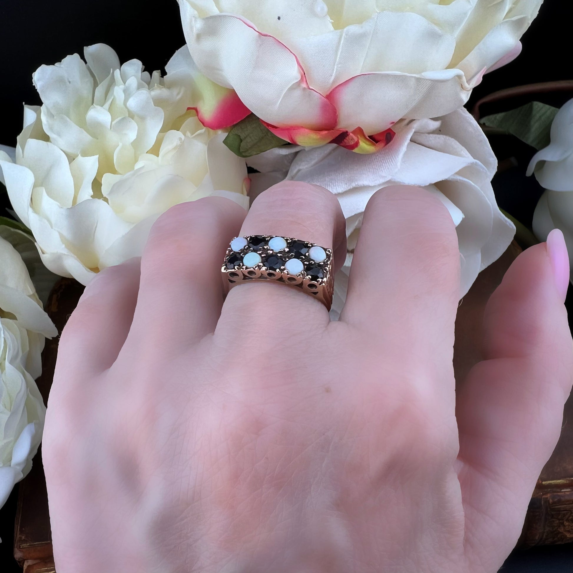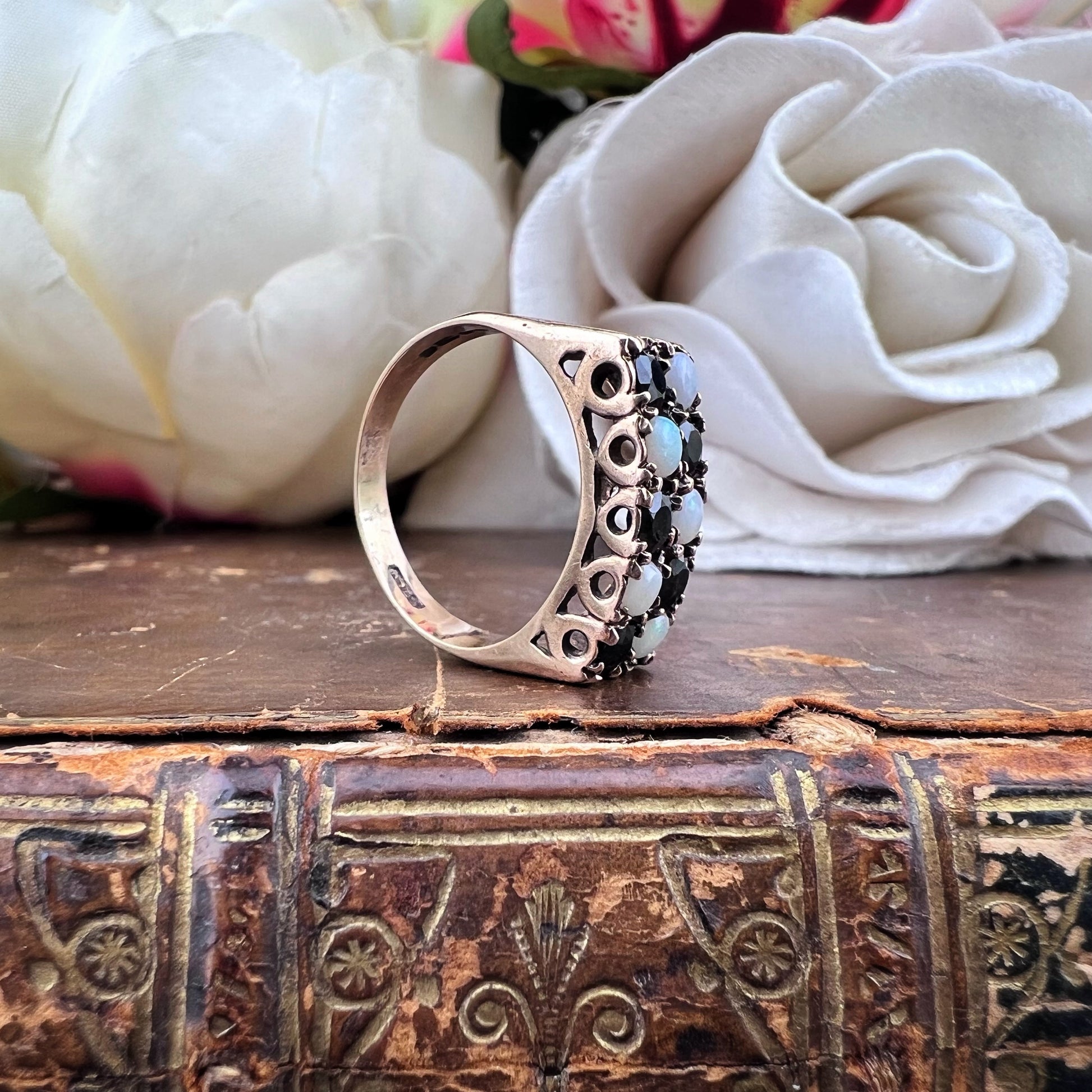 Ein wahres Juwel, das die Essenz von Retro-Glamour mit einem Hauch schillernder Magie einfängt. Stellen Sie sich fünf runde Cabochon-Opale mit ihren schillernden Reflexen vor, die sich mit fünf runden, intensiv blauen Saphiren abwechseln.