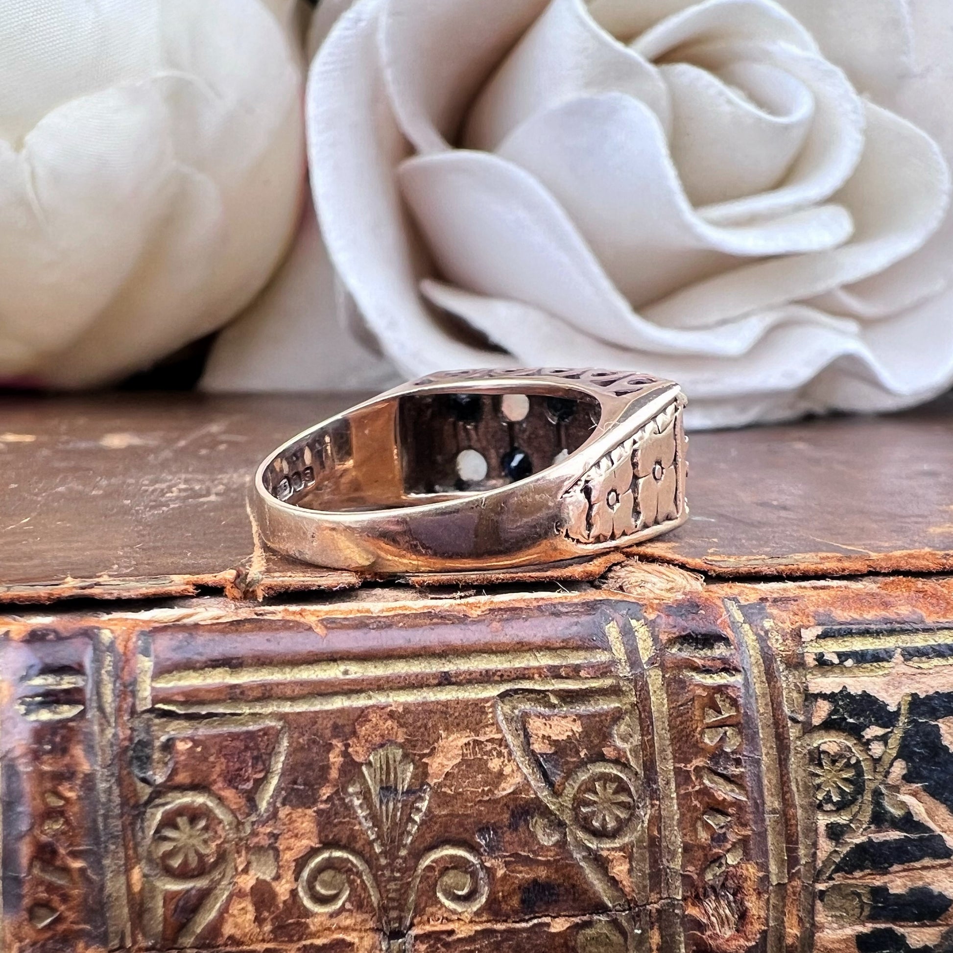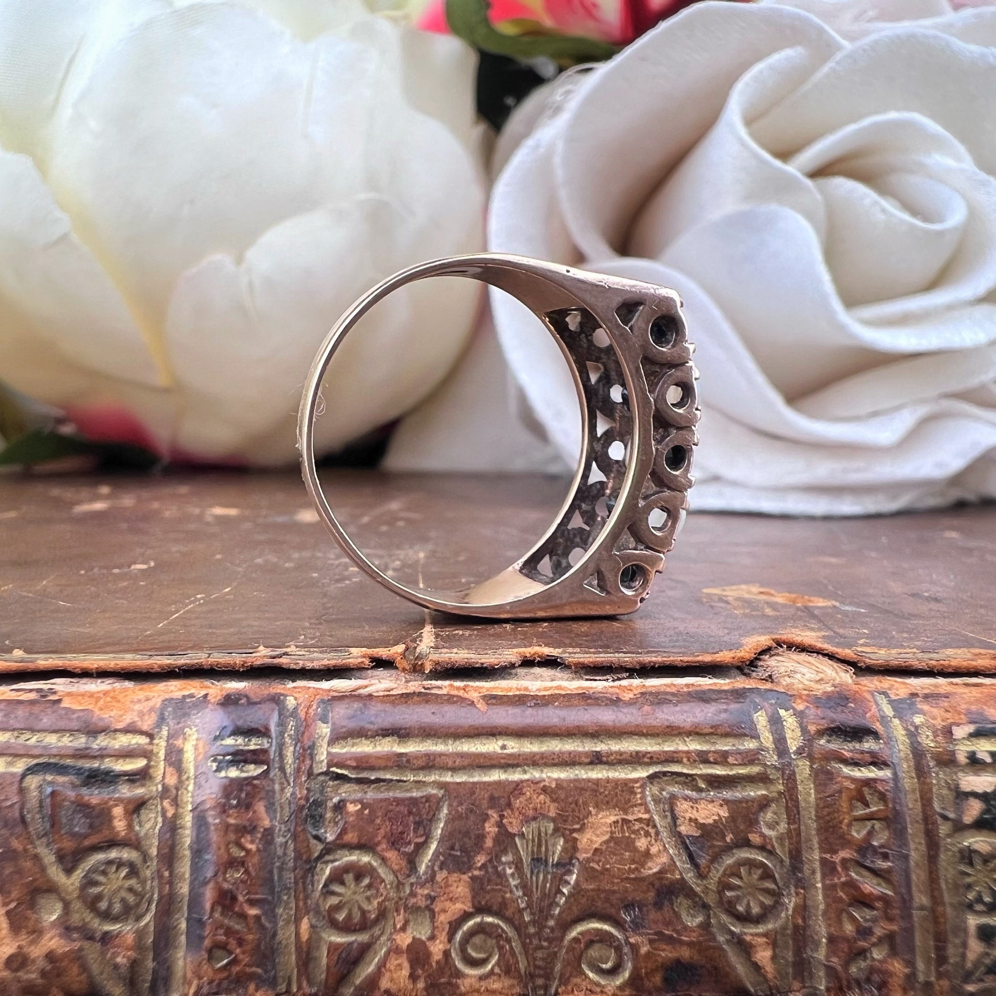 Ein funkelndes Wunder direkt aus dem London der 1980er Jahre! Dieser Vintage-Ring aus 9-karätigem Gold strotzt nur so vor Eleganz und Geheimnis. Auch bekannt als „rechteckiger Clusterring“ zeigt er florale Einflüsse, ein klassisches Design aus der Retro-Modern-Ära der 1980er Jahre. Typisch für die Londoner Goldschmiedekunst erinnern die durchbrochenen Fassungen und stilisierten Ringschienen an „Flower Cluster“- oder „Openwork Band“-Stile, oft mit britischen Punzen versehen.