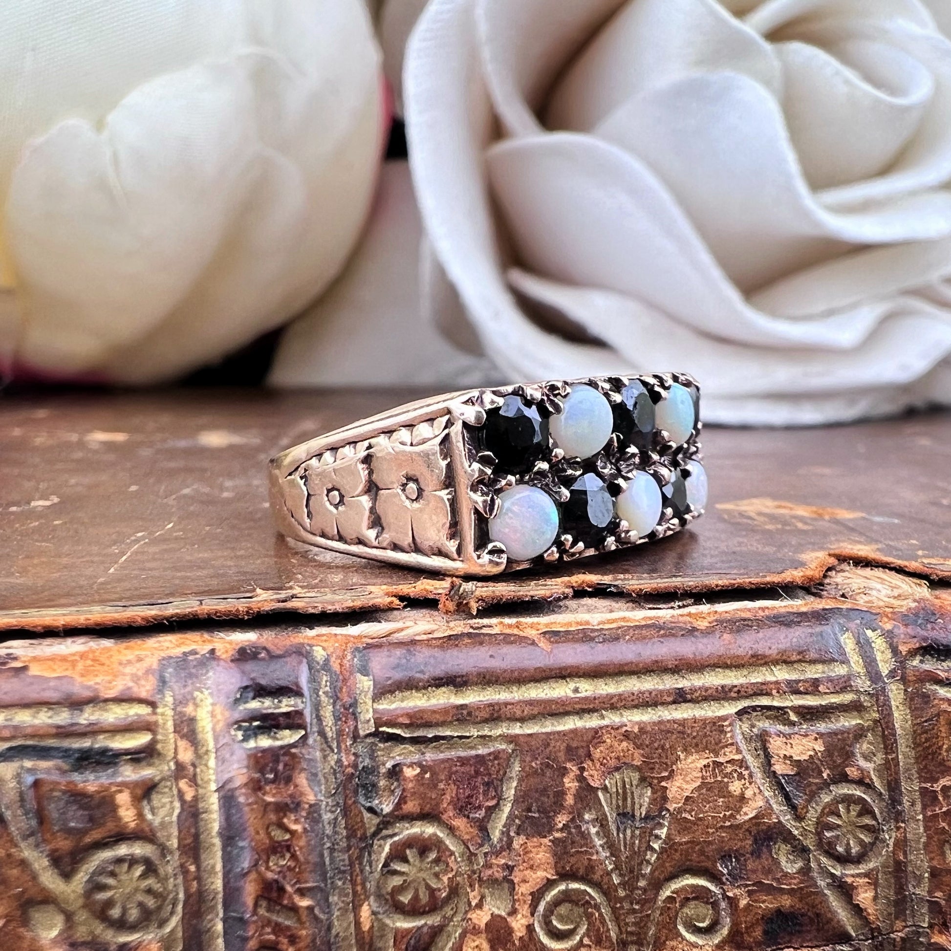 Vintage-Ring aus 9 Karat Gold mit Opal und Saphir – London 1980