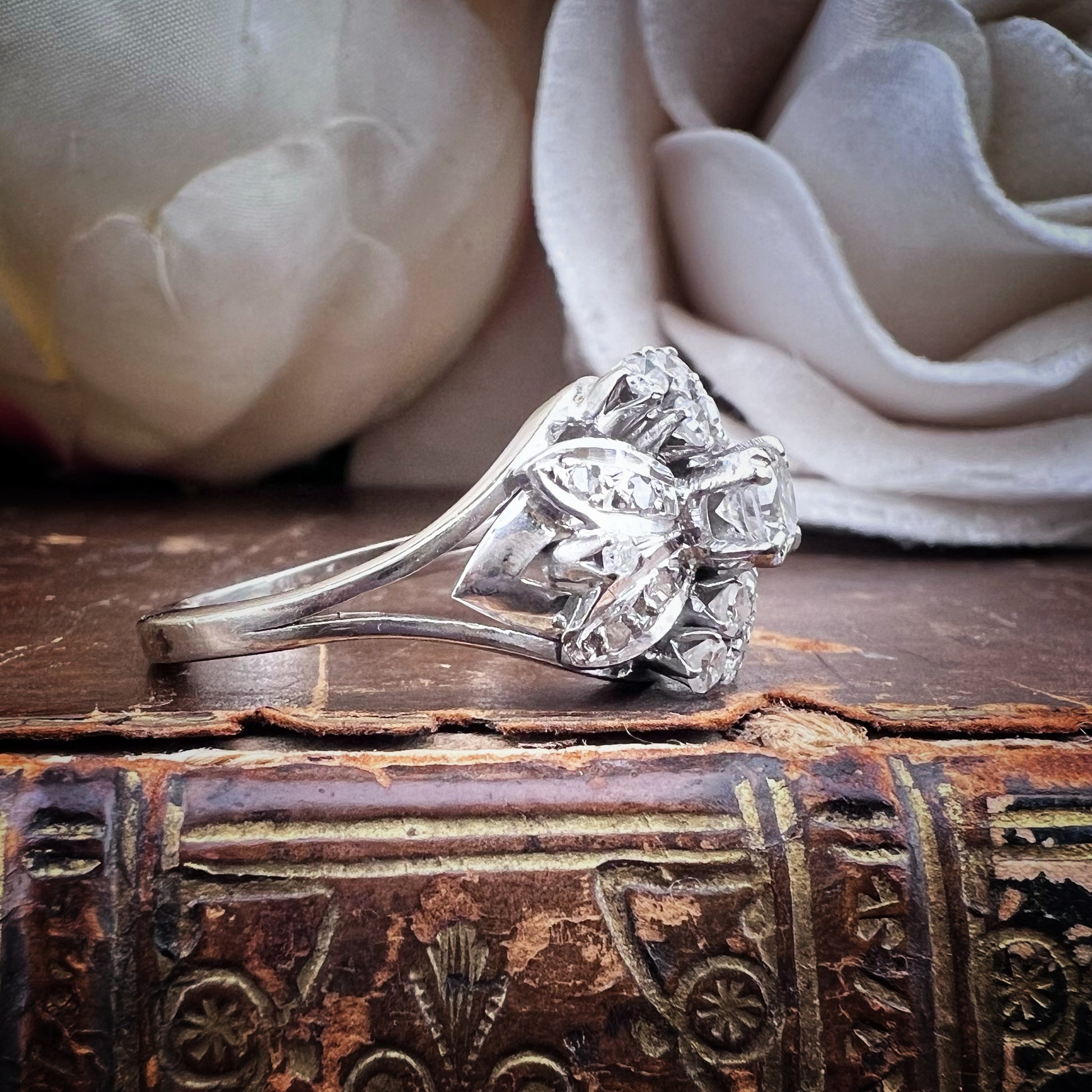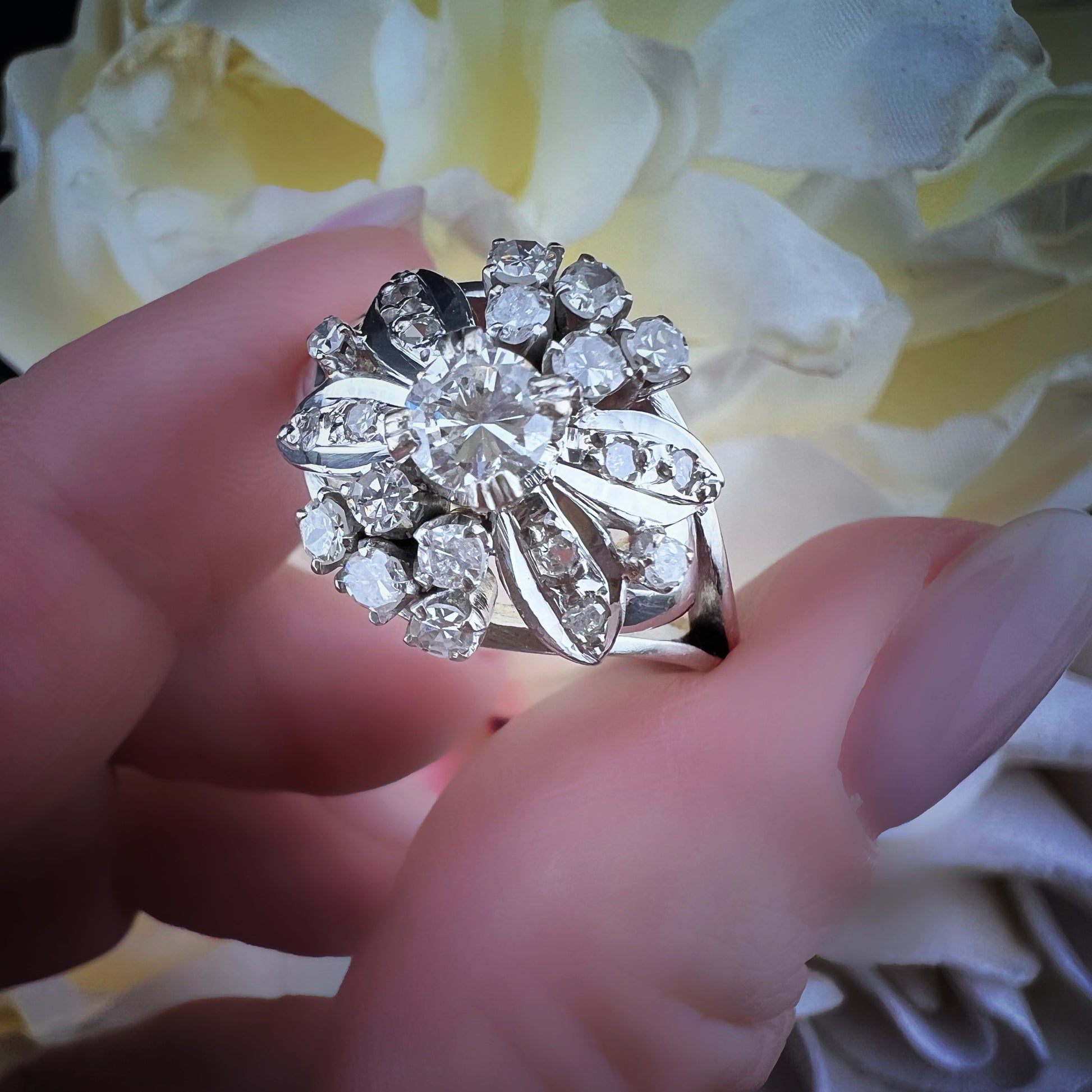 Im Zentrum glänzt ein Diamant im Brillantschliff von ca. 0,33 ct, der als Herzstück einer stilisierten Blüte funkelnd gefasst ist. Um ihn herum sorgt eine „Blumenkrone“ aus zehn größeren Diamanten, die zwischen zarten Blättern mit kleineren Diamanten (insgesamt ca. 0,93 ct) eingefasst ist, für einen harmonischen und leuchtenden optischen Effekt.