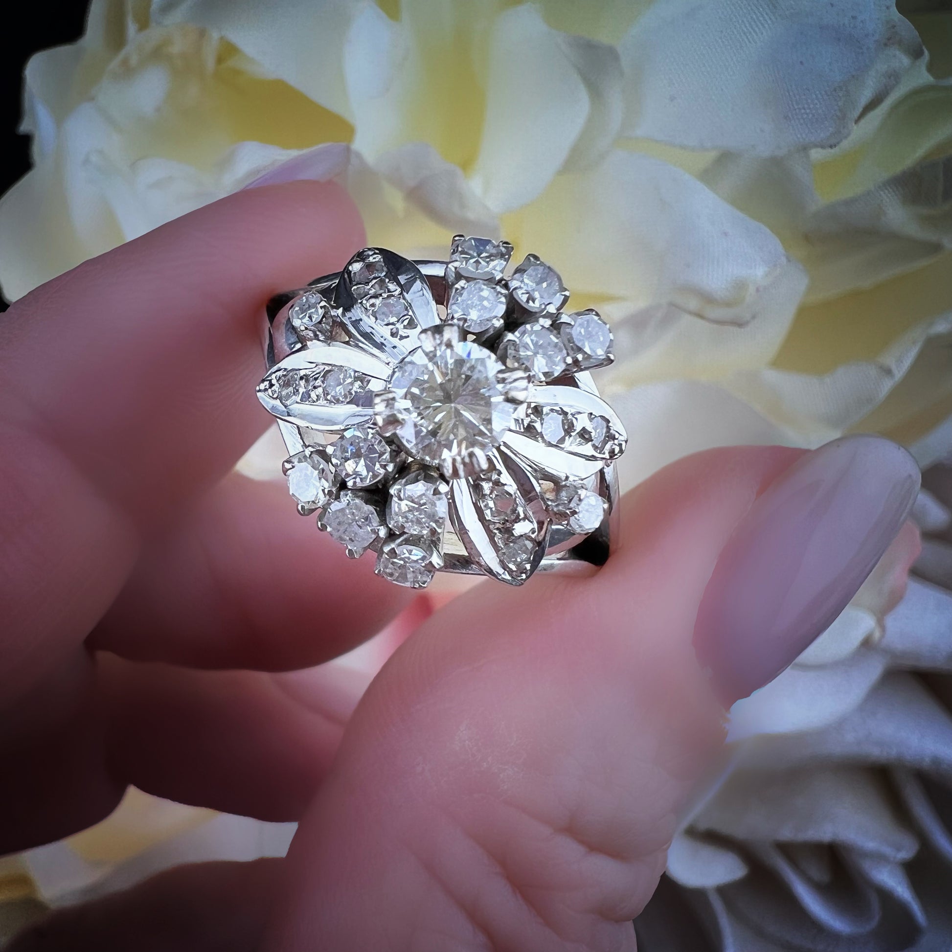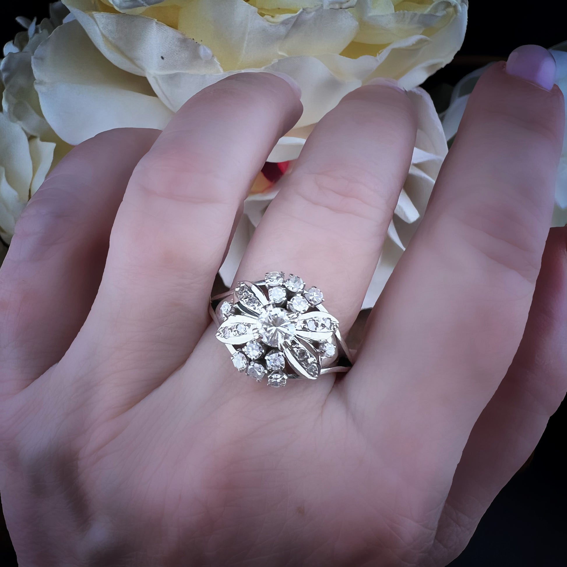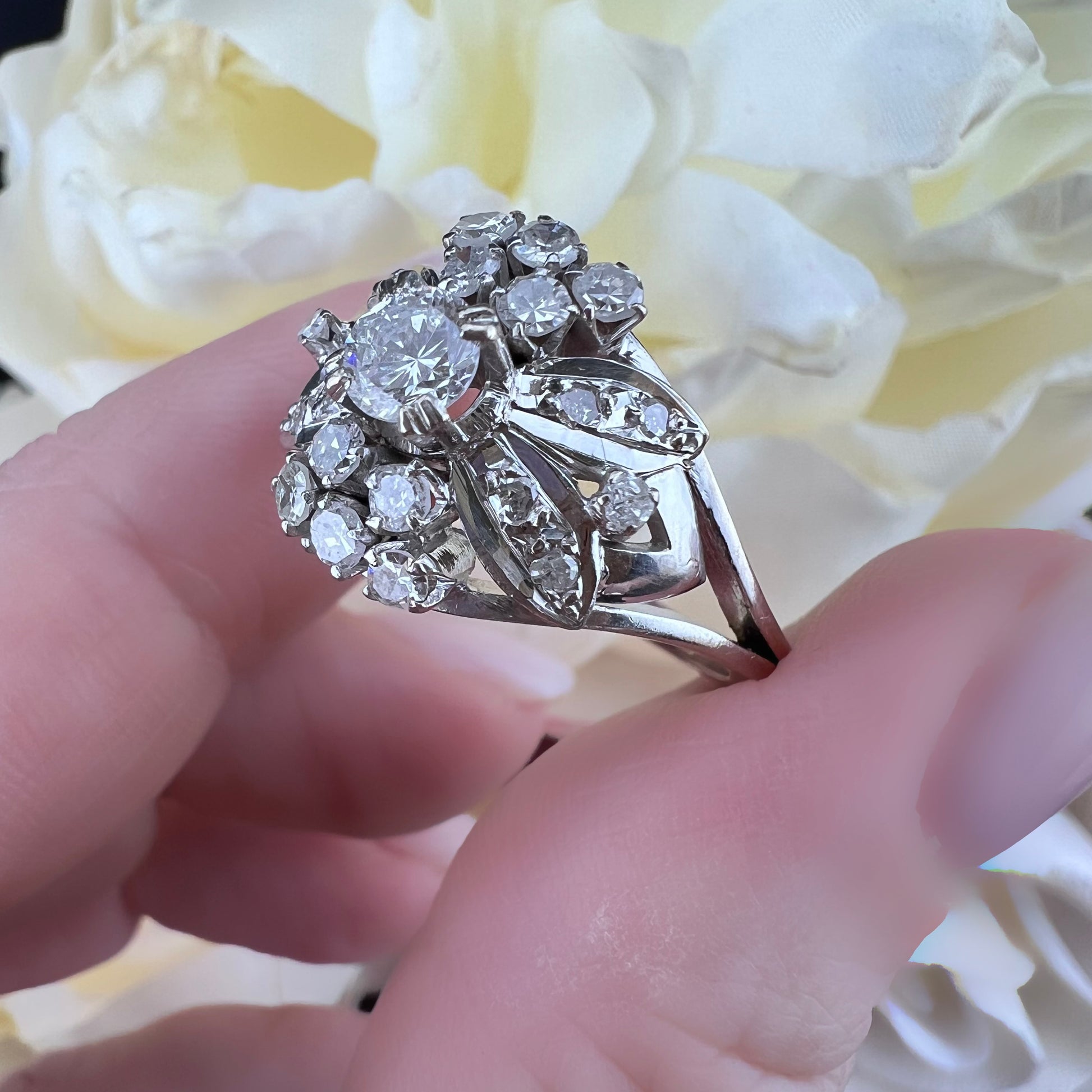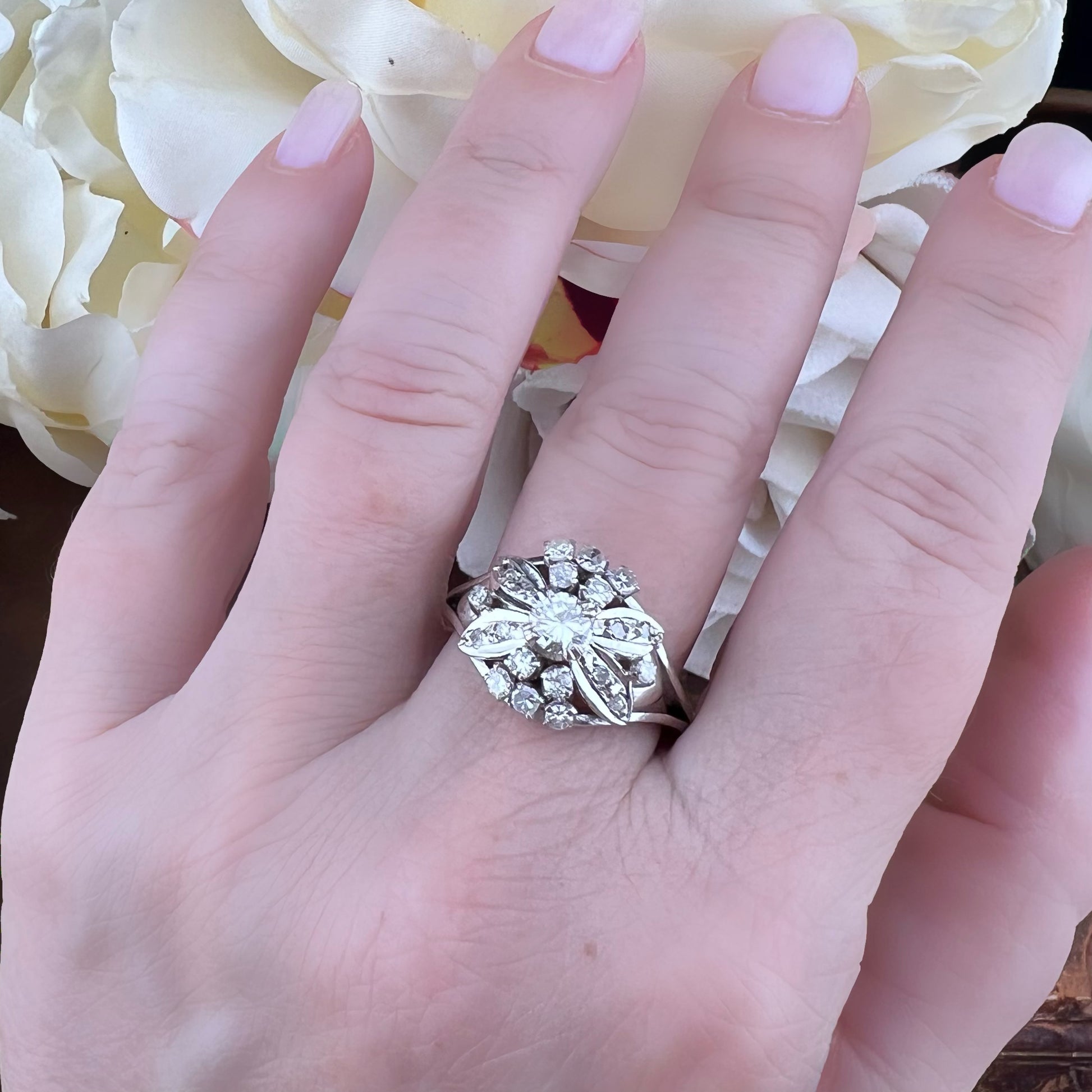 Dieser bezaubernde Vintage-Ring aus 14-karätigem Weißgold (USA, 1960er Jahre) besticht durch sein raffiniertes Blumendesign.