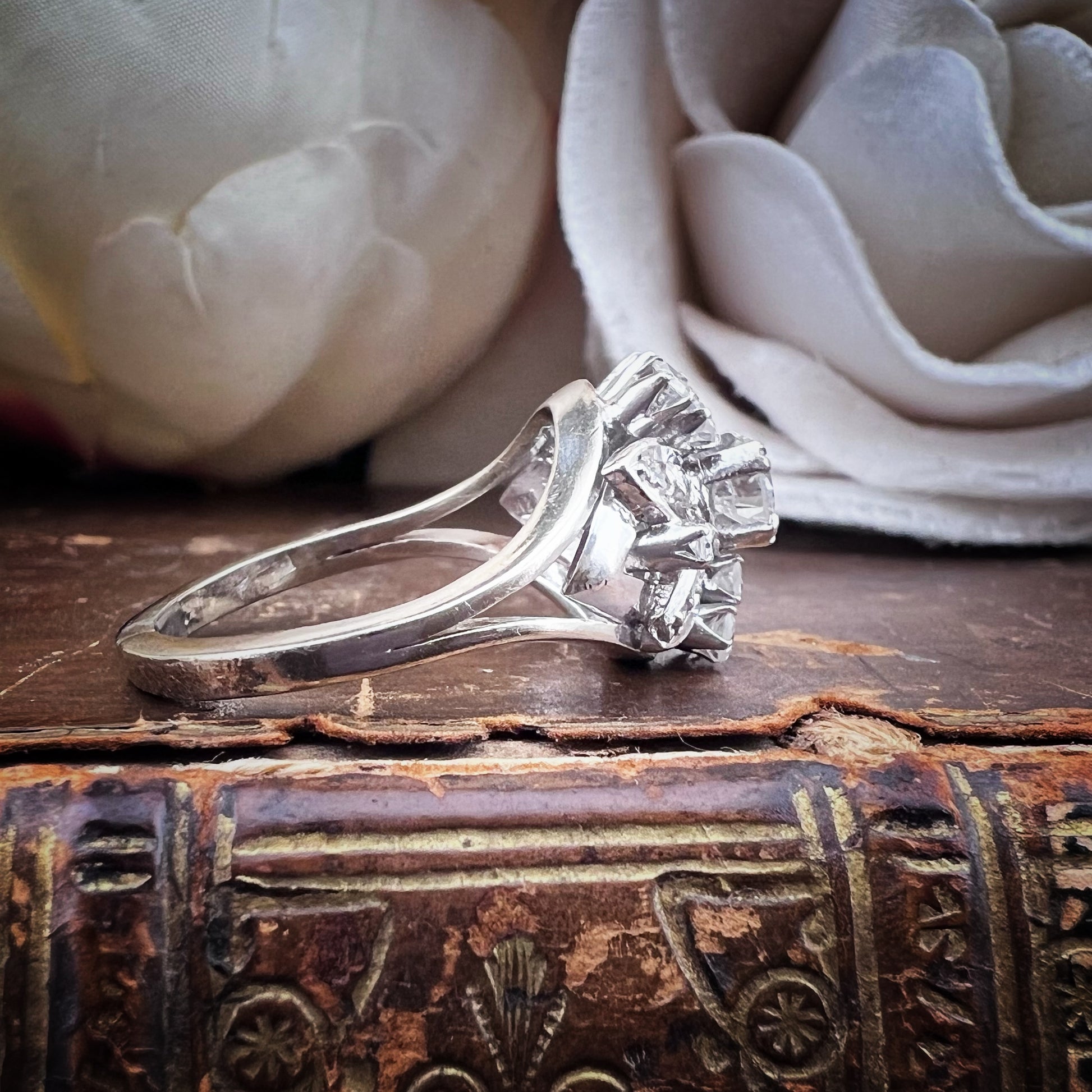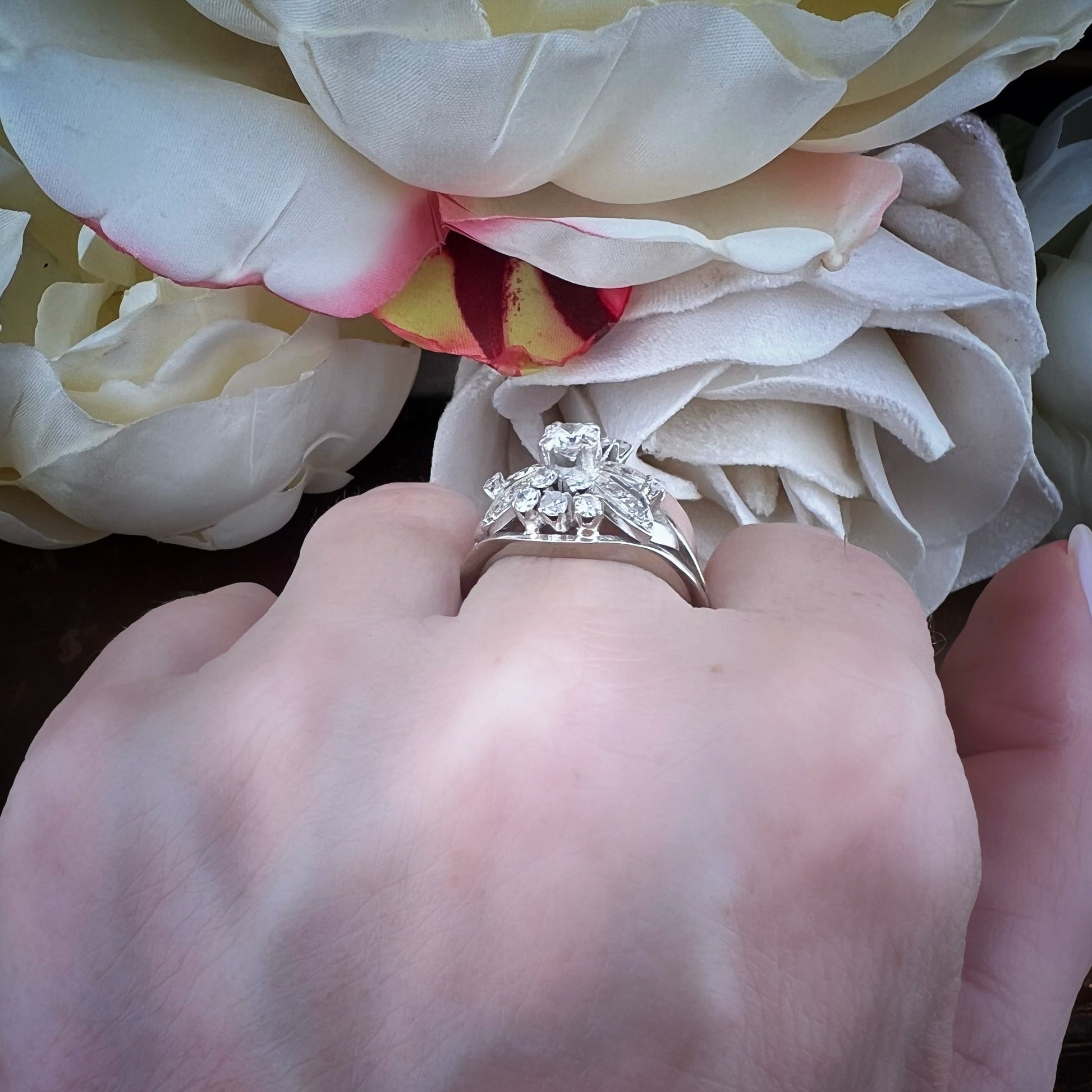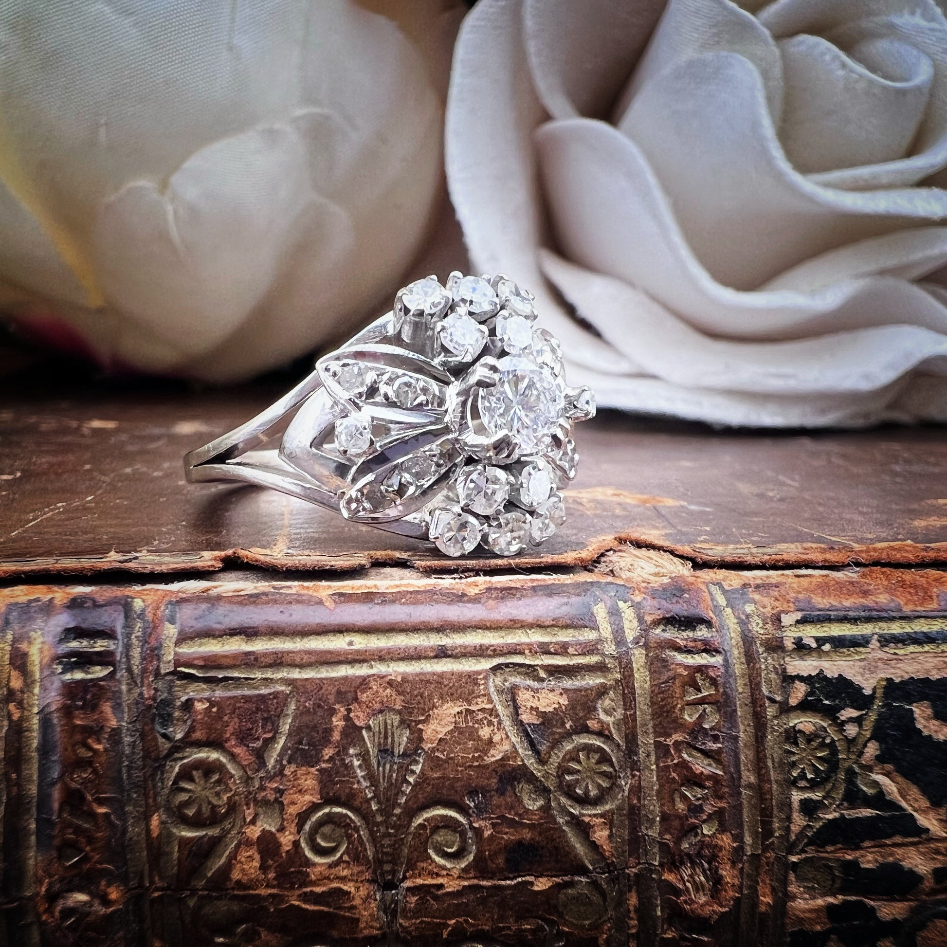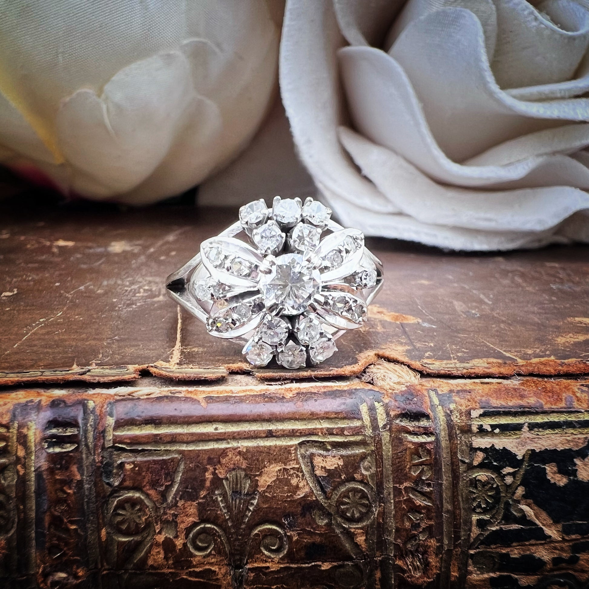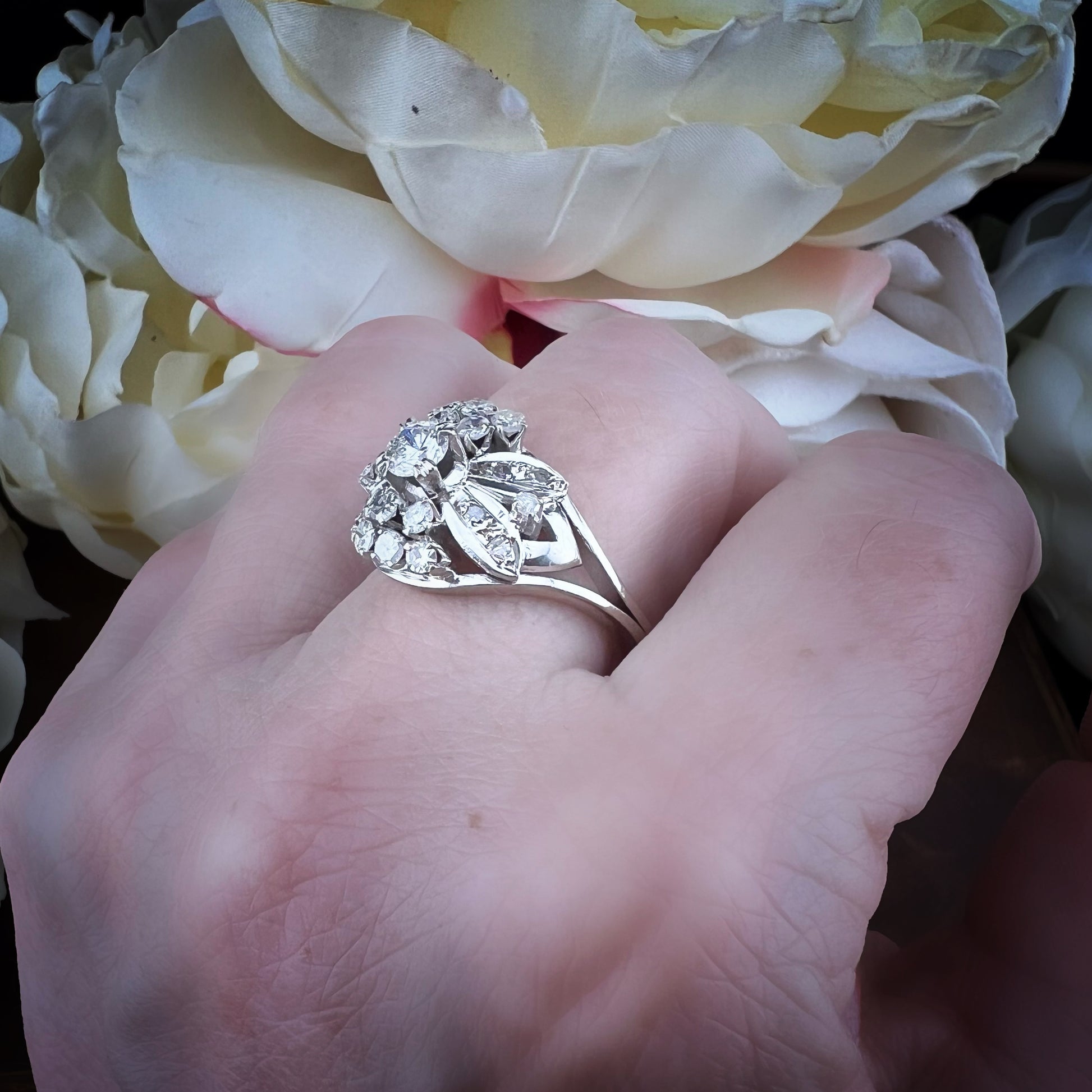 Dieser bezaubernde Vintage-Ring aus 14-karätigem Weißgold (USA, 1960er Jahre) besticht durch sein raffiniertes Blumendesign.