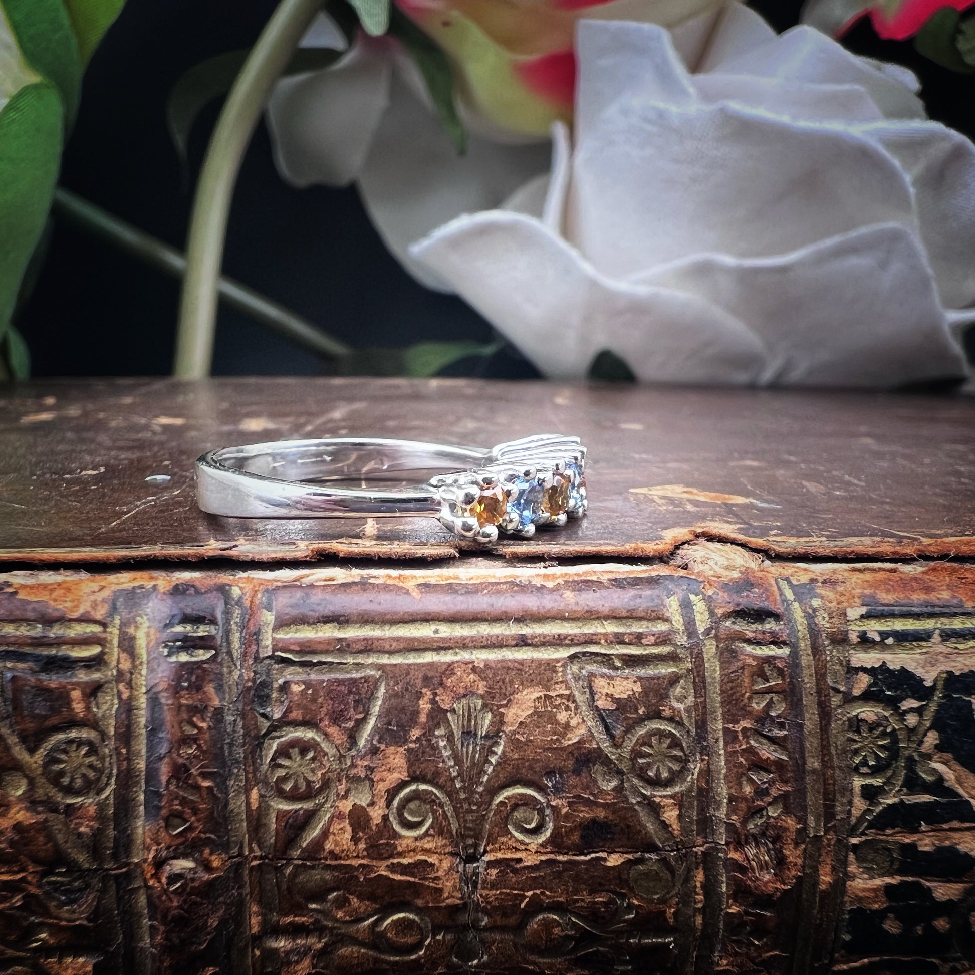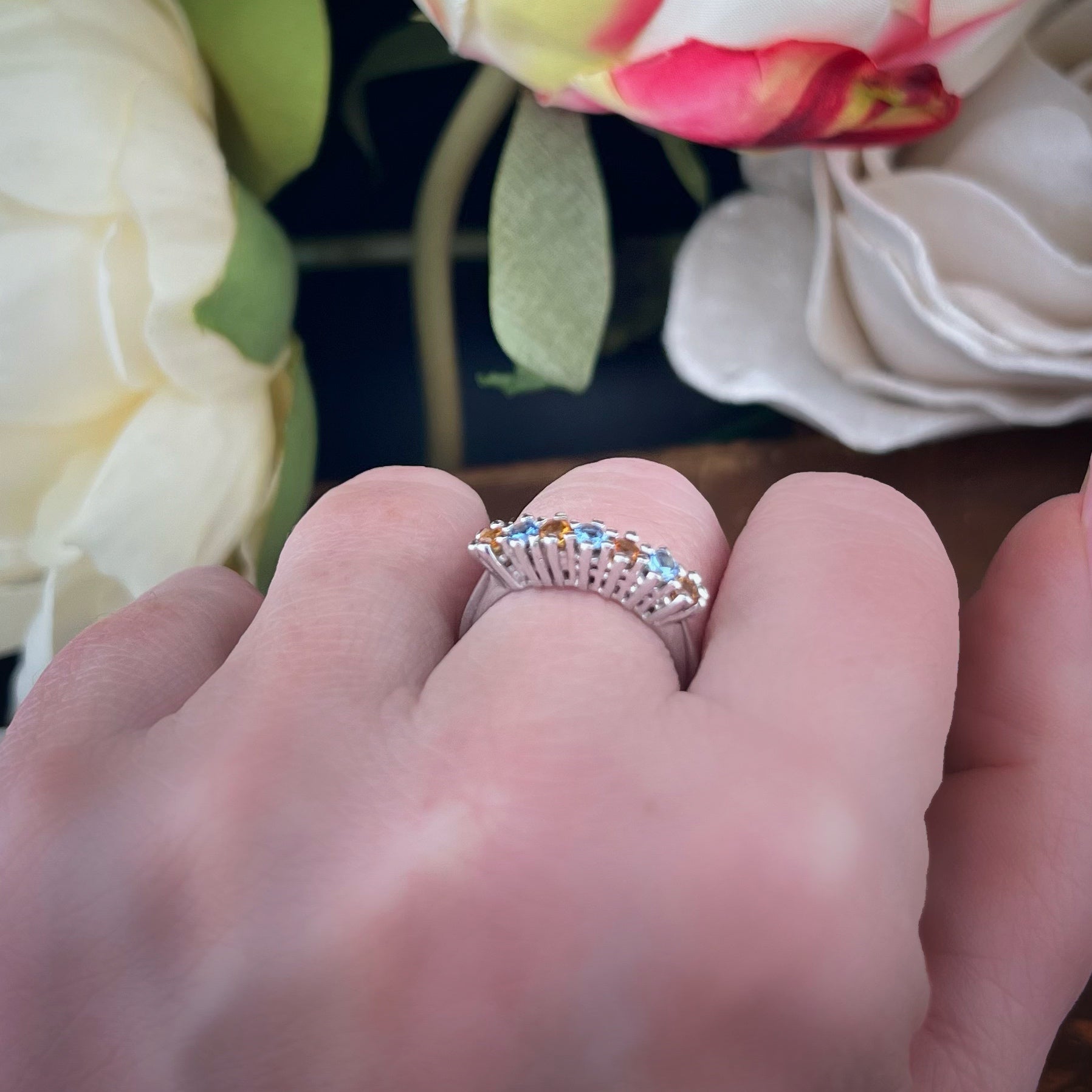Die drei blauen Topassteine und vier Madeira-Citrinquarzsteine sind in einer eleganten, abwechselnden Linie angeordnet und erzeugen einen perfekt ausgewogenen und raffinierten Effekt. Die detailreiche Fassung und die sorgfältigen Proportionen machen diesen Ring zu einem charaktervollen Schmuckstück – ideal für alle, die mit Eleganz und Stil auffallen möchten.