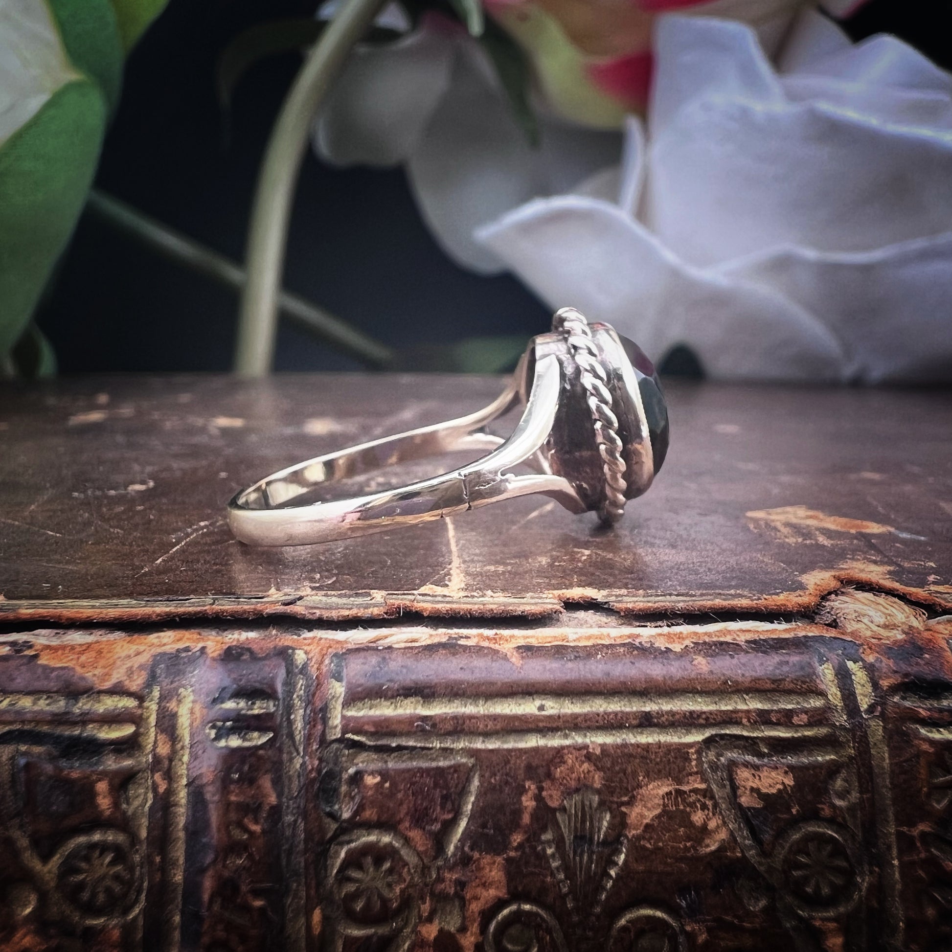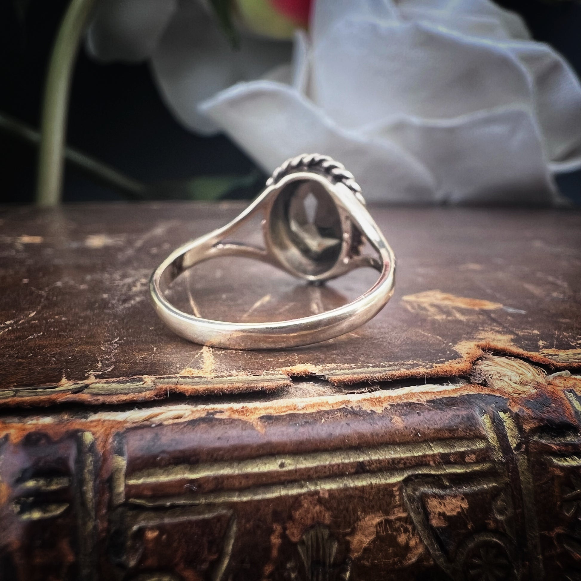 In der Mitte steht ein facettierter, oval geschliffener Rauchquarz mit tiefen, geheimnisvollen Tönen, bündig eingefasst und mit einem raffinierten Torchon-Rand verziert, der seinen Glanz verstärkt.