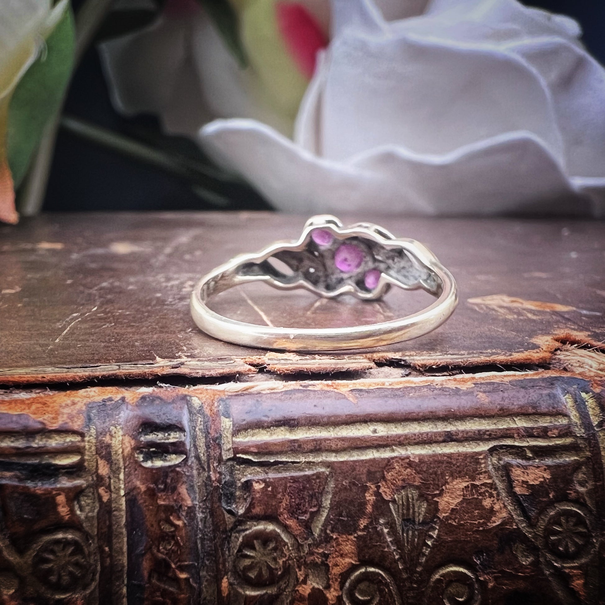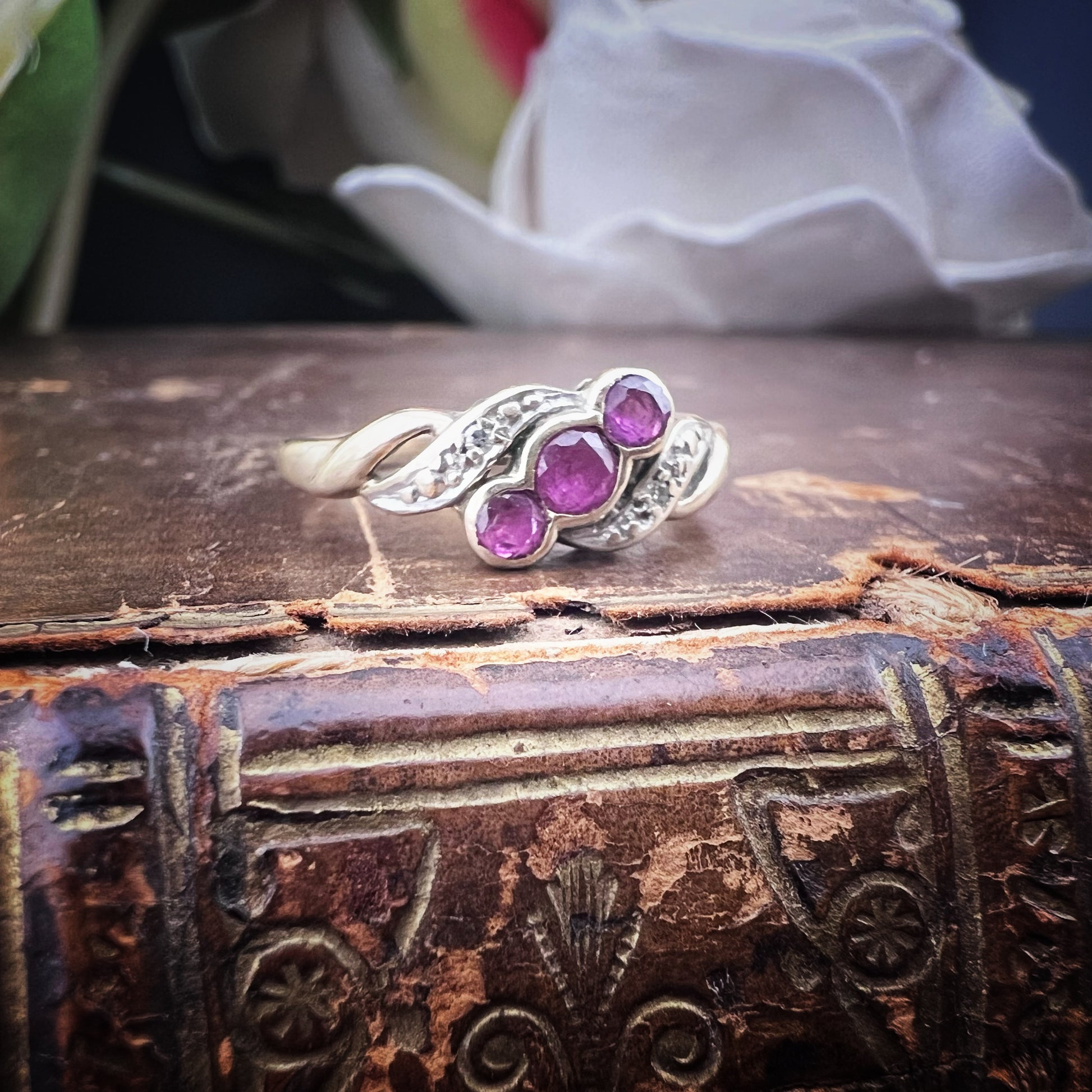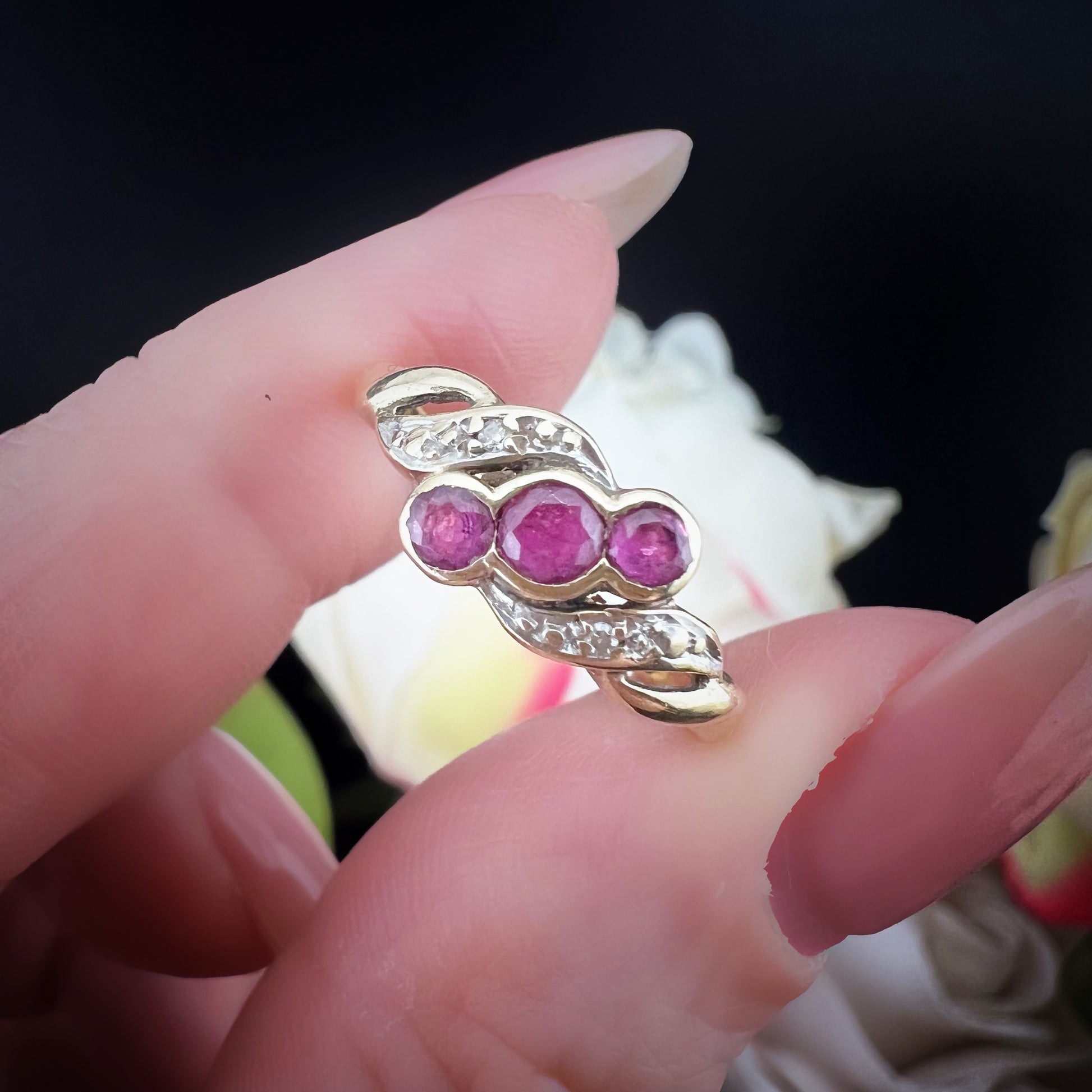 Ein kleines Meisterwerk der Retro-Eleganz: Dieser Vintage-Ring aus den 1980er Jahren bezaubert durch sein harmonisches und leicht asymmetrisches Design. Drei runde Rubine sind diagonal angeordnet und meisterhaft in eine Zargenfassung eingefasst, die sie betont, ohne aufdringlich zu wirken. Eingerahmt werden sie von zwei zarten, geschwungenen Goldwellen, die jeweils von einem kleinen, dezenten und doch funkelnden Diamanten flankiert werden.