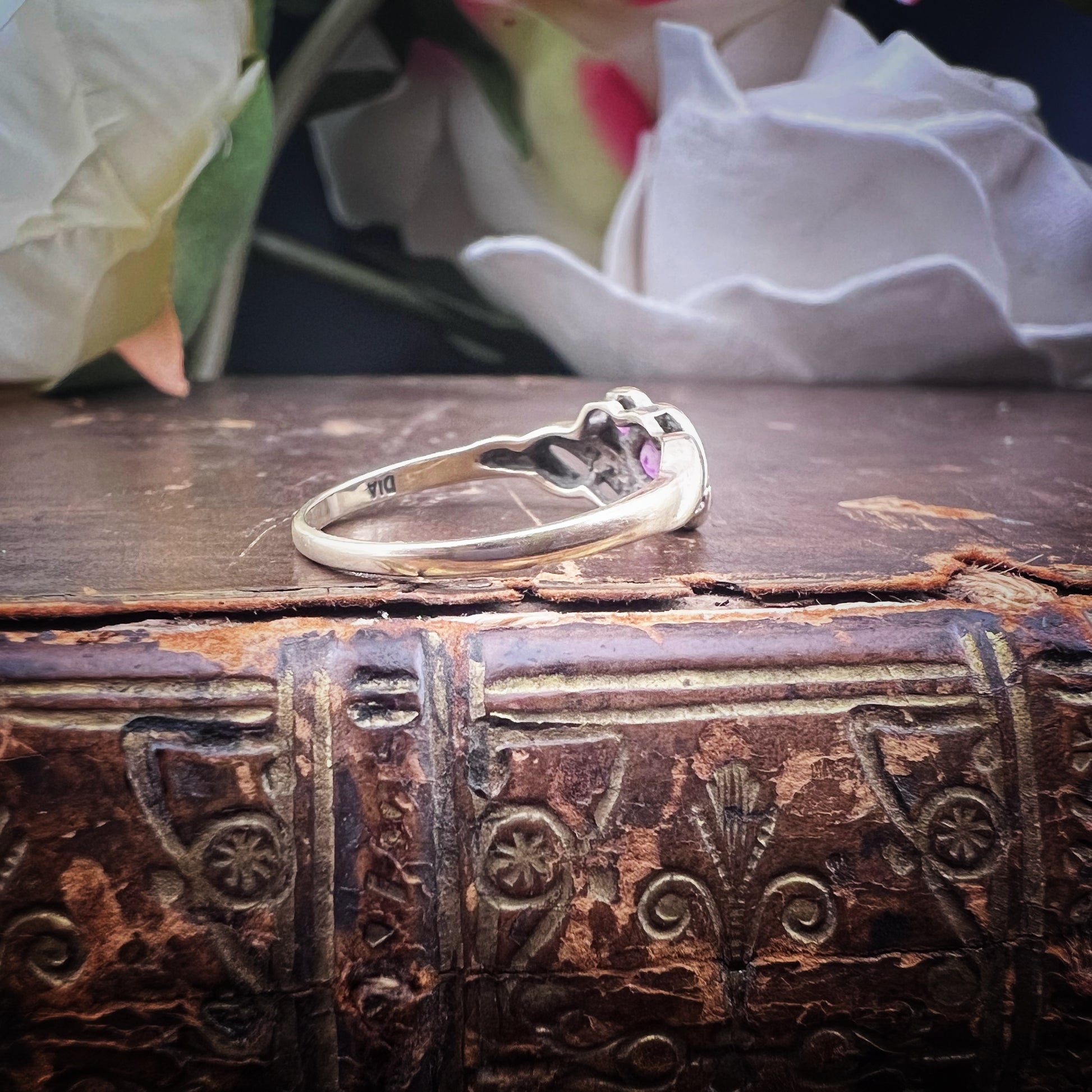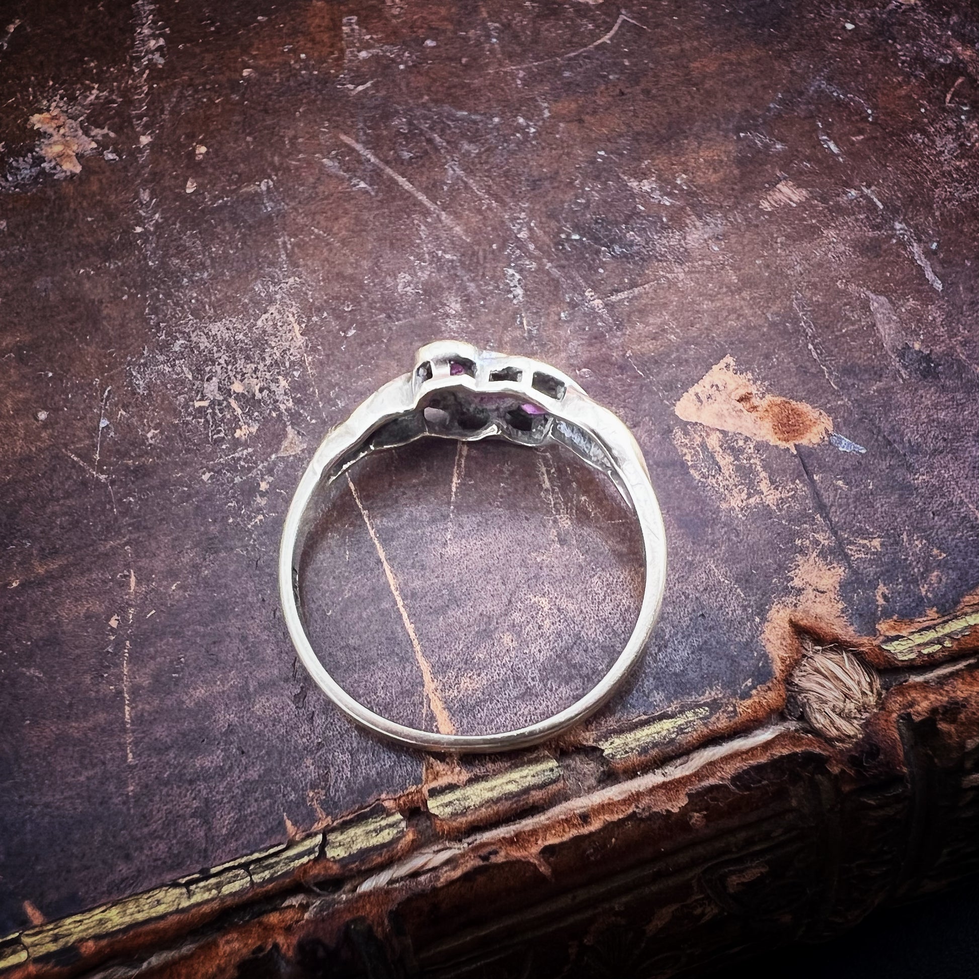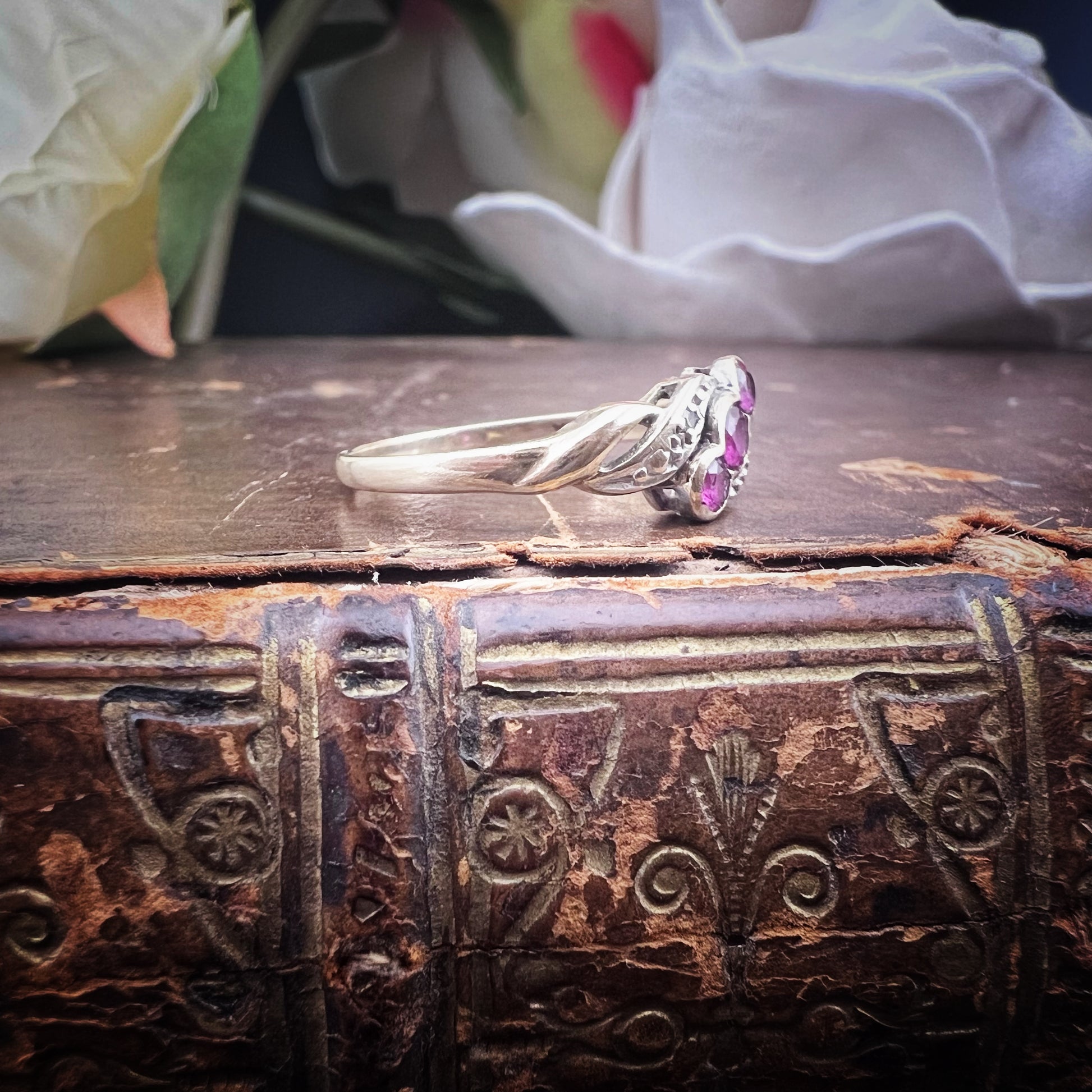 Ein kleines Meisterwerk der Retro-Eleganz: Dieser Vintage-Ring aus den 1980er Jahren bezaubert durch sein harmonisches und leicht asymmetrisches Design. Drei runde Rubine sind diagonal angeordnet und meisterhaft in eine Zargenfassung eingefasst, die sie betont, ohne aufdringlich zu wirken. Eingerahmt werden sie von zwei zarten, geschwungenen Goldwellen, die jeweils von einem kleinen, dezenten und doch funkelnden Diamanten flankiert werden.
