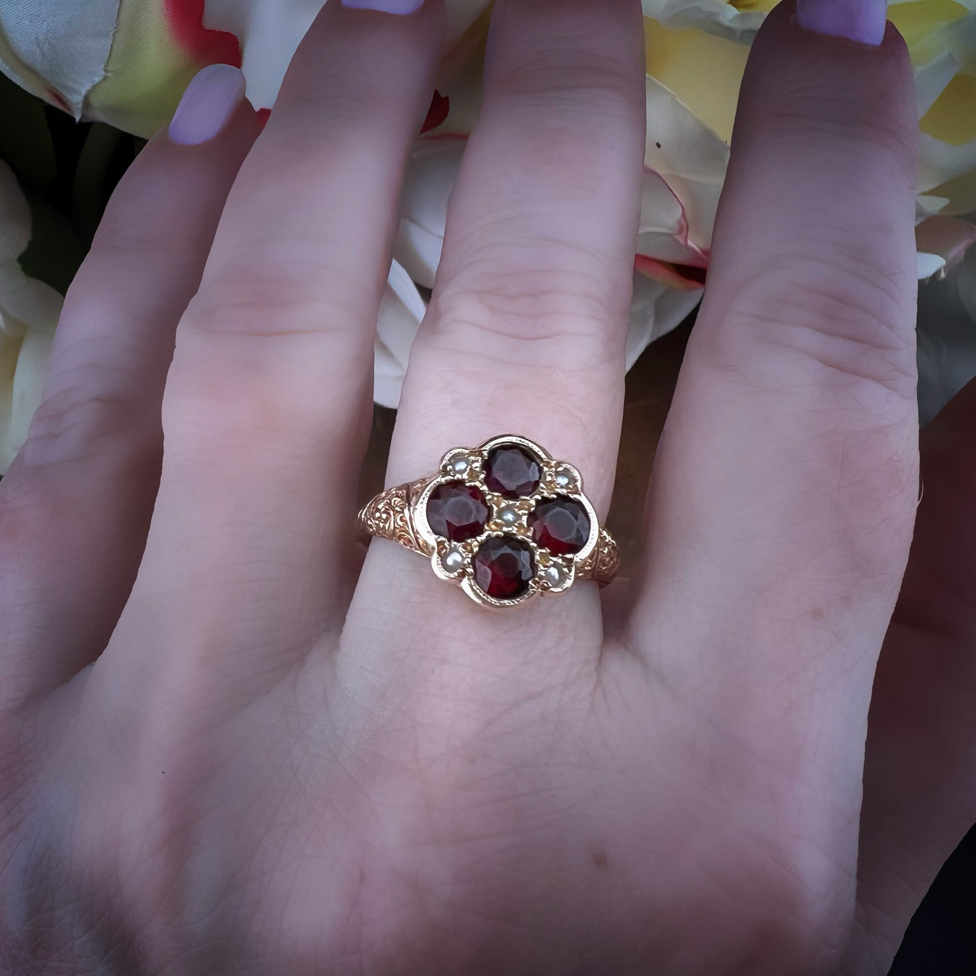 Englischer Vintage-Goldring mit Granat und Perle – London, 1970
