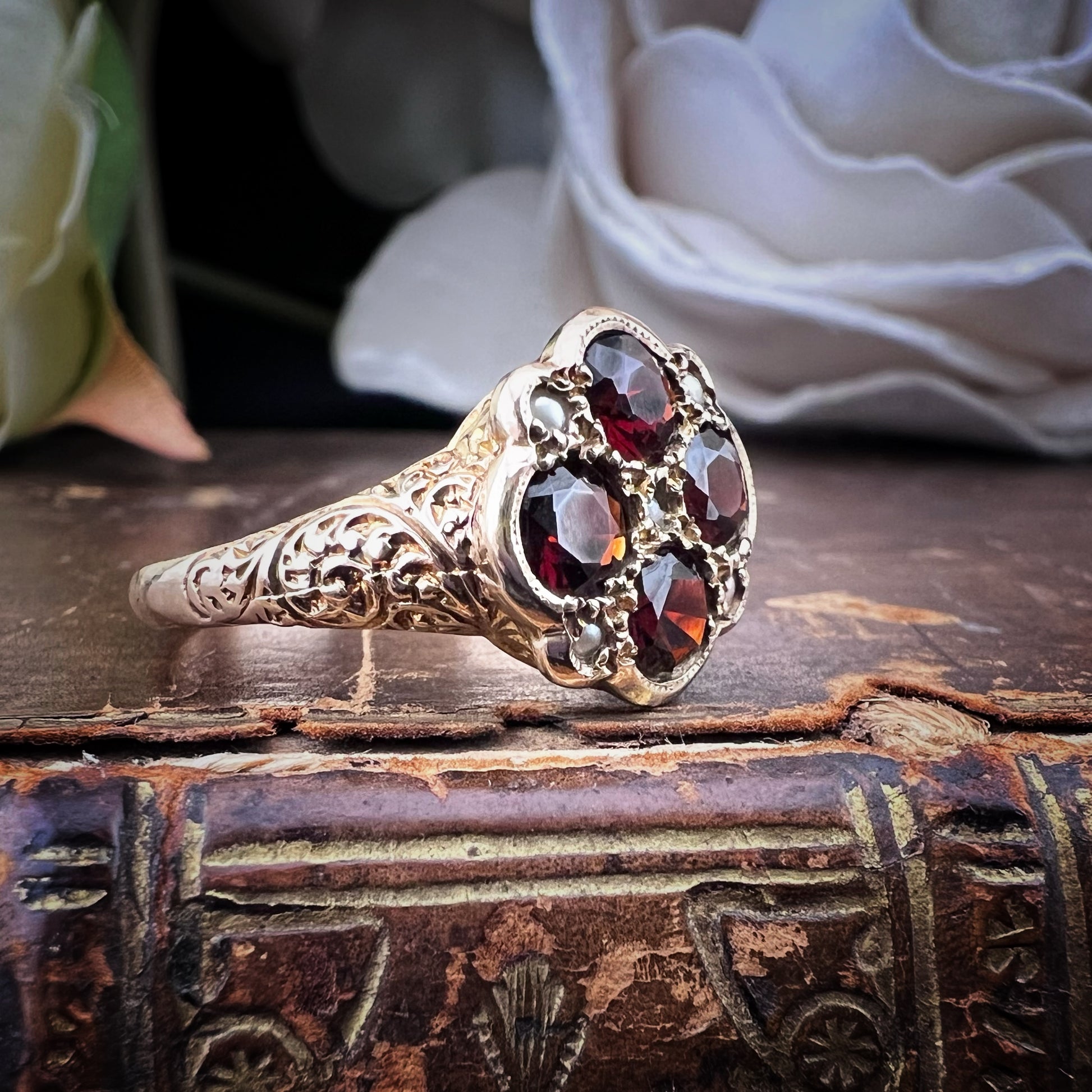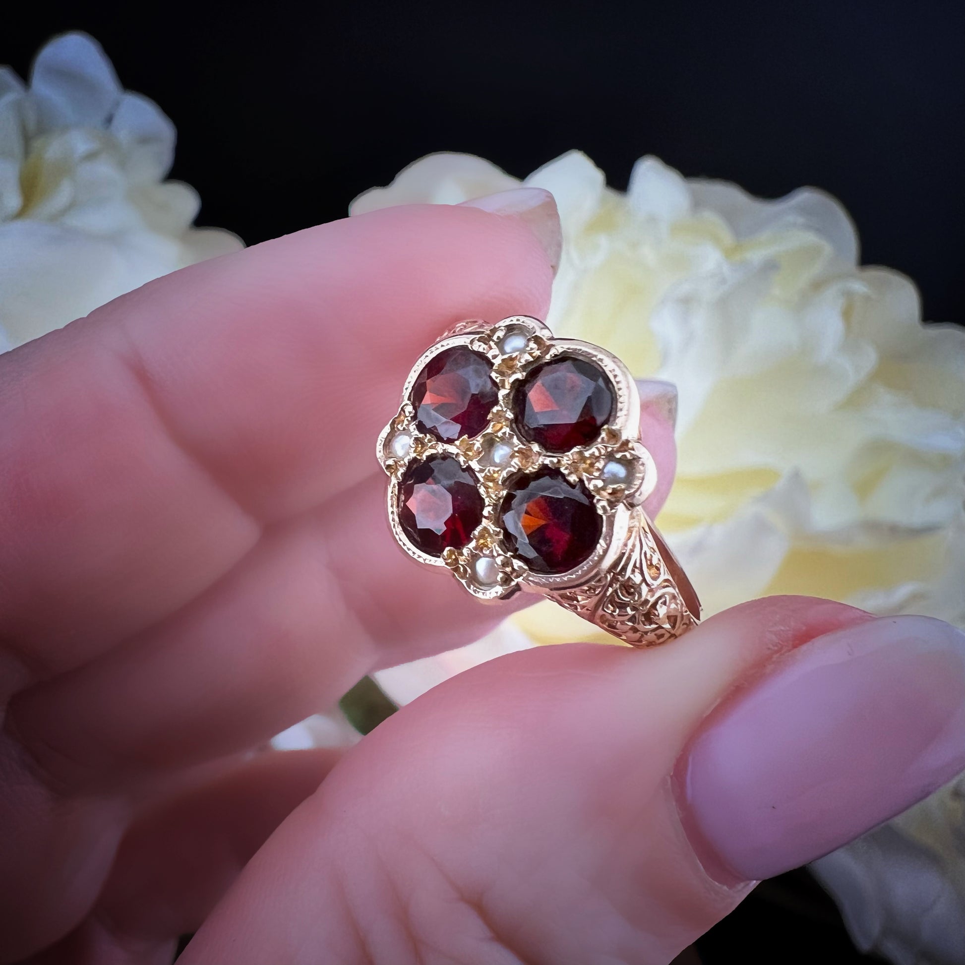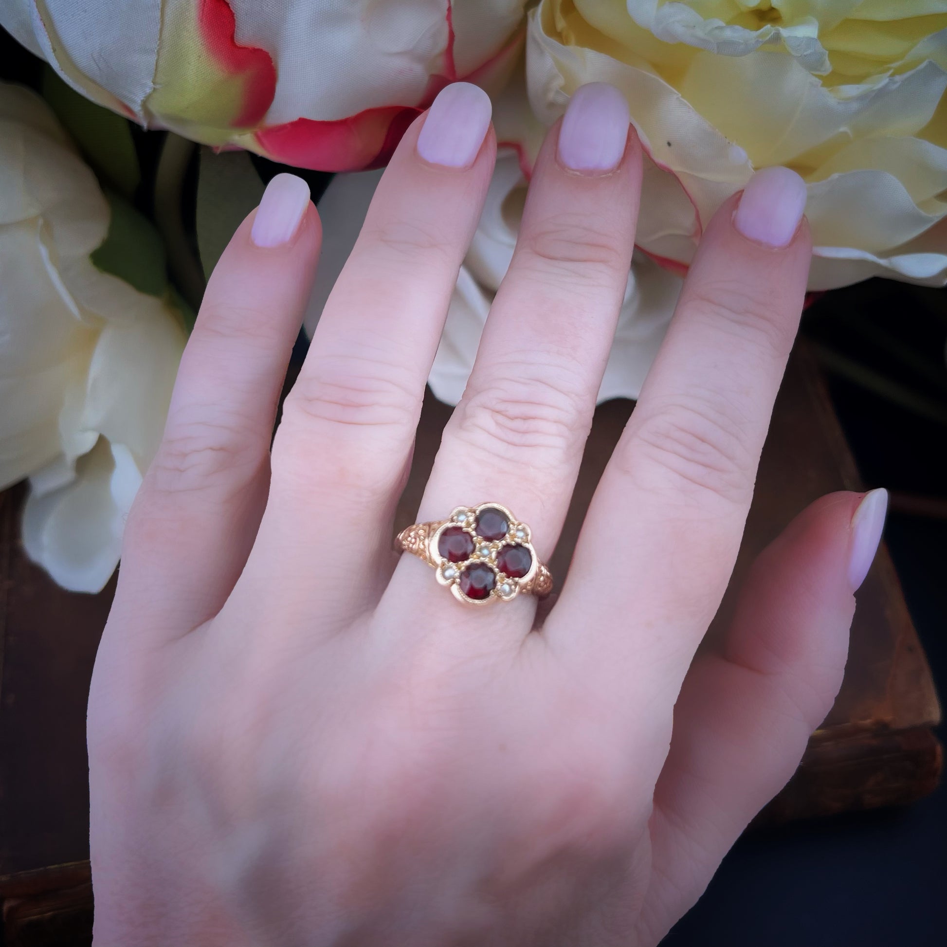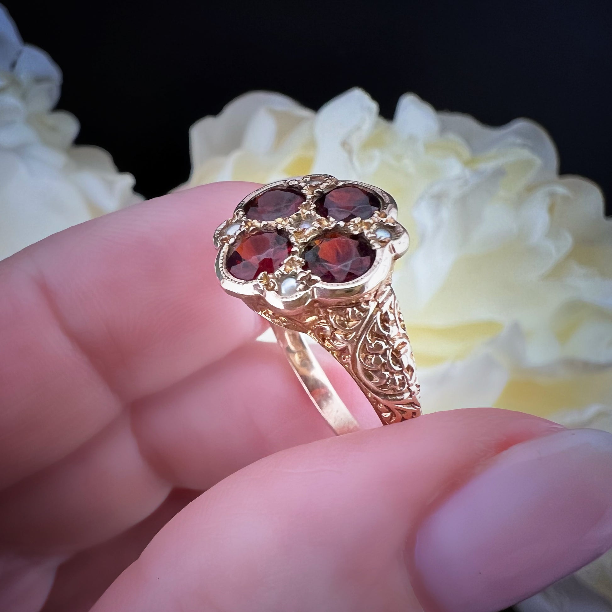 Der Ringkopf mit 13 mm Durchmesser ist mit vier tiefen, 4 mm großen, runden Granaten besetzt, die kreuzförmig angeordnet sind und zwischen denen fünf leuchtende Süßwasserperlen leuchten. Das Ergebnis ist eine harmonische Komposition, die Stärke und Süße, Leidenschaft und Reinheit vereint.