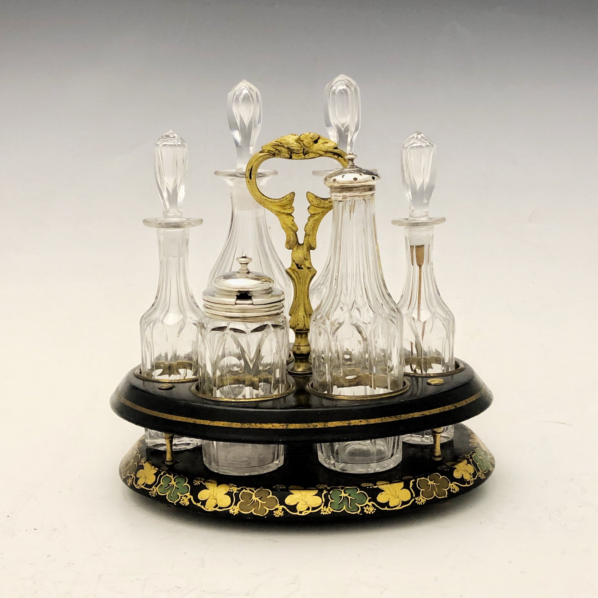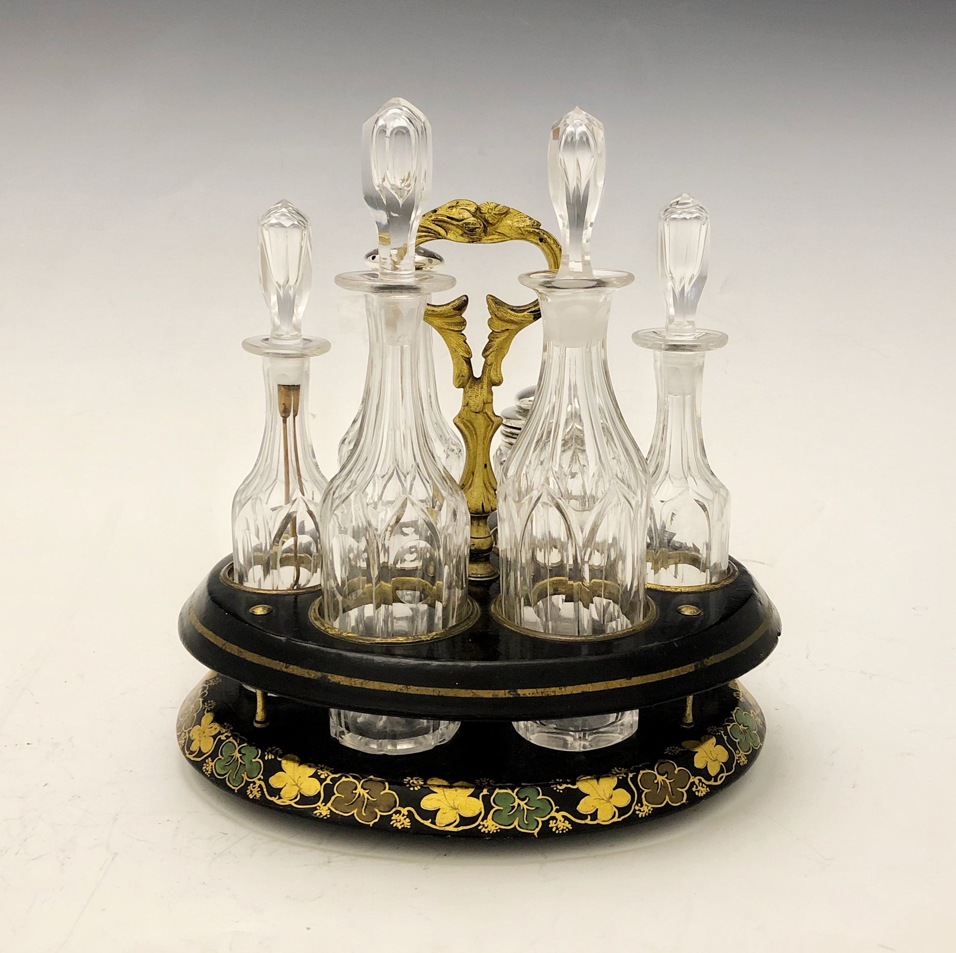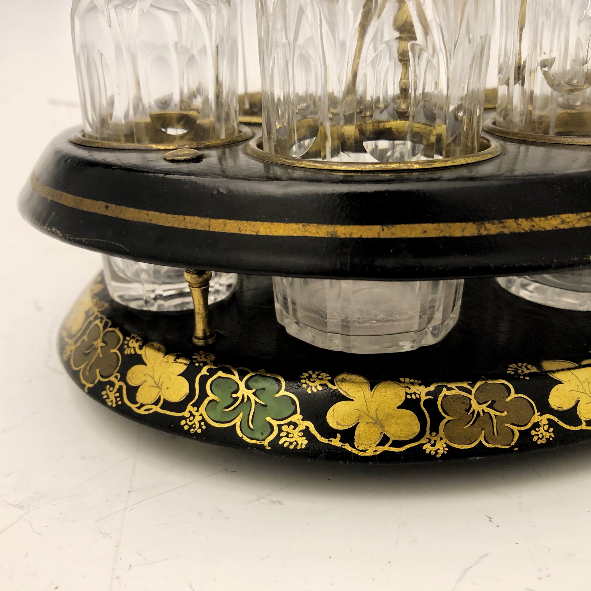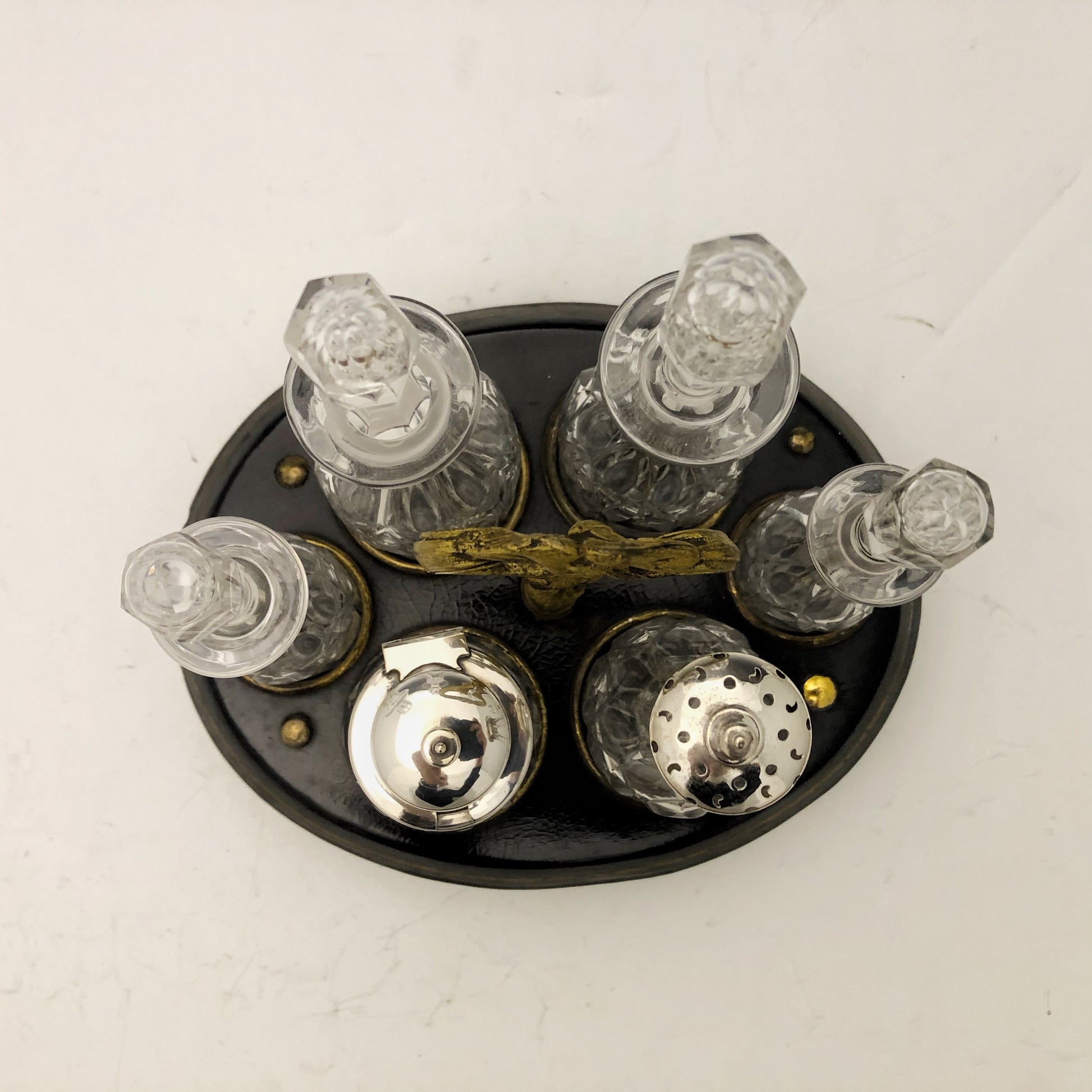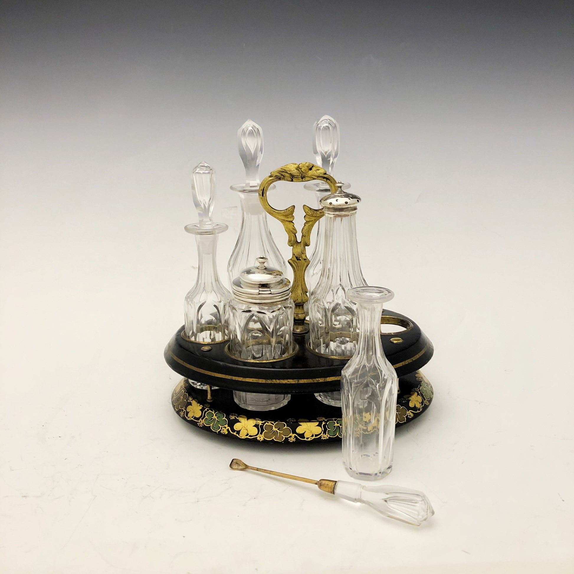 Antike und seltene Voliere mit sechs Schalen aus geschliffenem Kristall, eine davon mit einem Löffel für würzige Soßen.