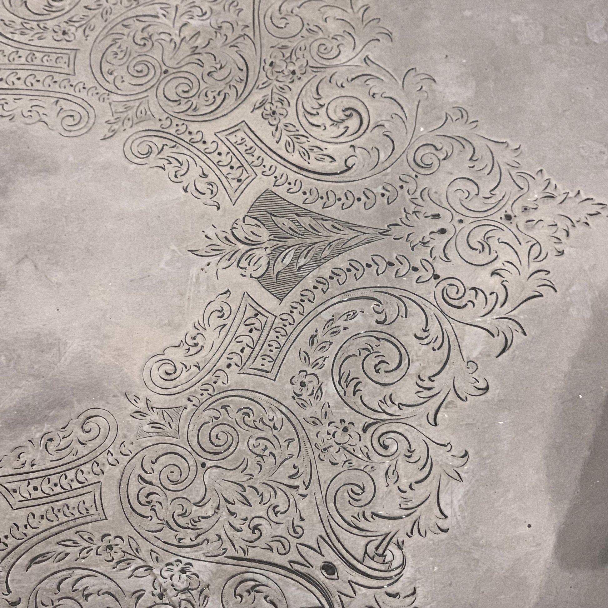 Meisterhaft von Hand mit floralen und pflanzlichen Motiven graviert. Steht auf vier aufgesetzten Silberfüßen.