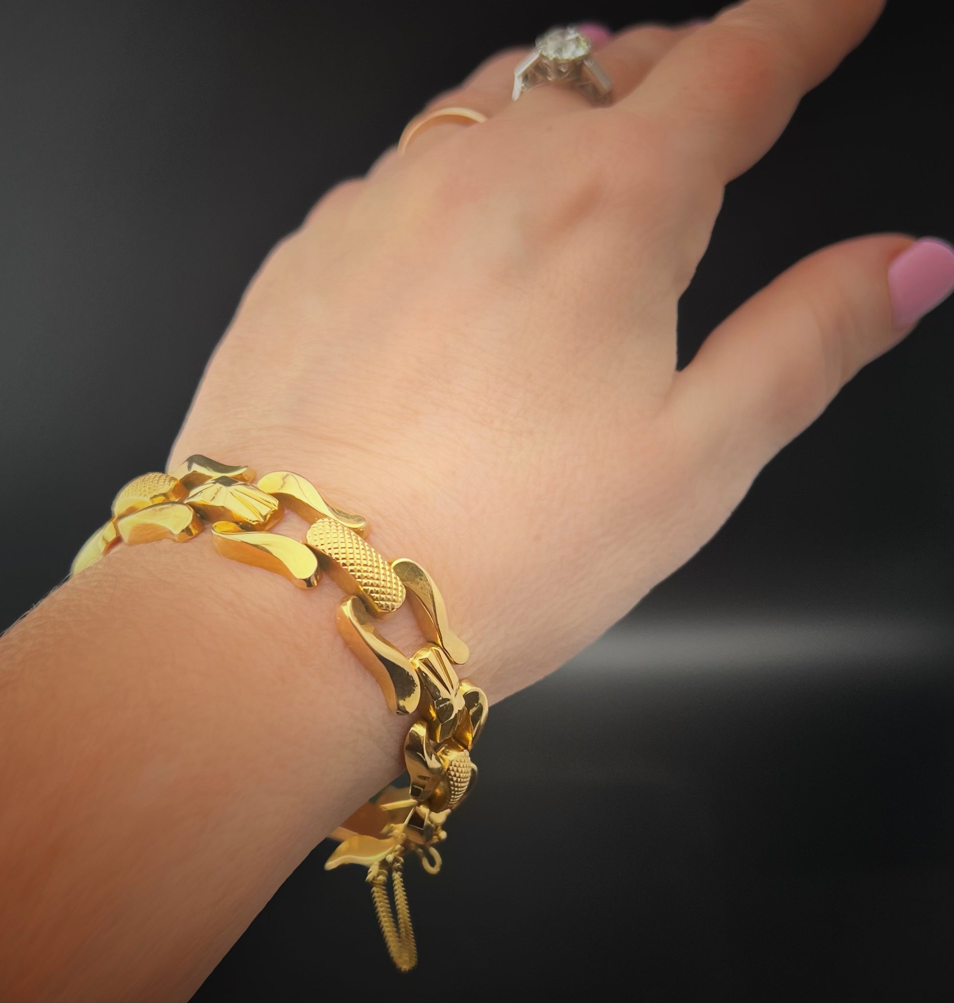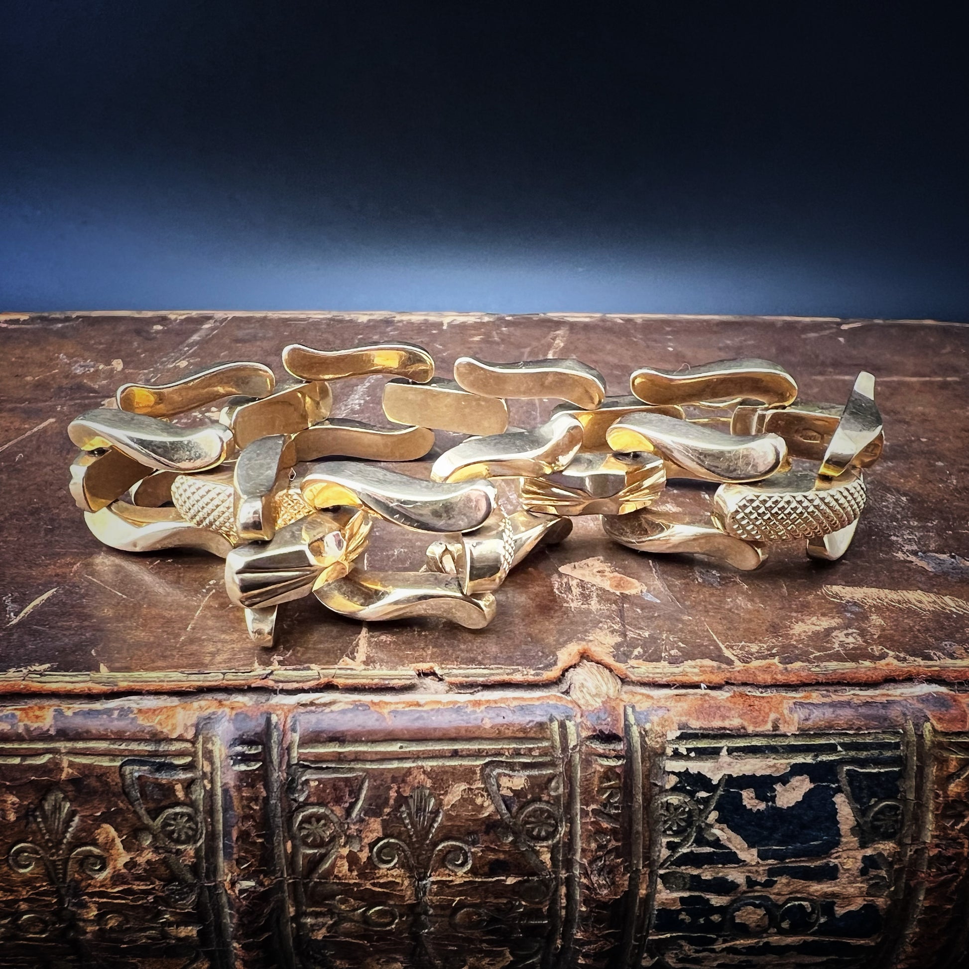Prächtiges Armband im Stil der 1950er Jahre aus 18 Karat Gelbgold mit drehbaren Gliedern, deren polierte Oberflächen und gravierte Details harmonisch aufeinandertreffen. Die Hauptglieder mit ihren geschwungenen und weichen Konturen erzeugen einen eleganten visuellen Effekt, während die gravierten Elemente mit ihrem raffinierten Gittermuster Struktur und Tiefe verleihen.