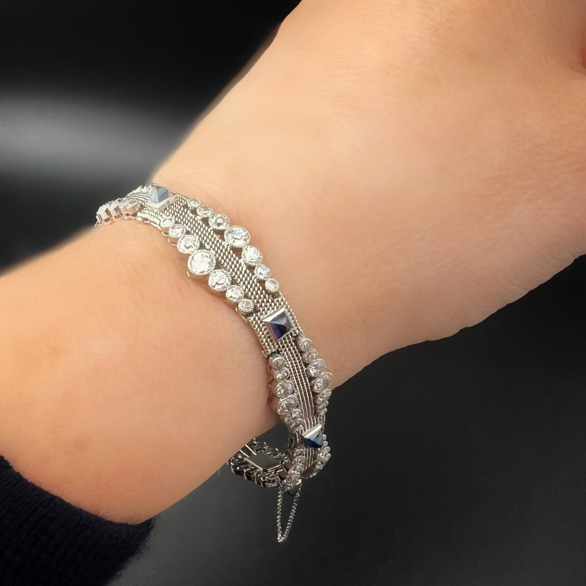 Um den Reiz des Armbands noch weiter zu verstärken, ist jedes Glied mit einem prächtigen natürlichen Korund-Saphir im Cusp-Cabochon-Schliff in tiefem, sattem Blau besetzt, der einen intensiven Farbkontrast mit dem Weißgold und den Diamanten bildet. Das Gesamtgewicht der Saphire wird auf 1,30 bis 1,50 Karat geschätzt.