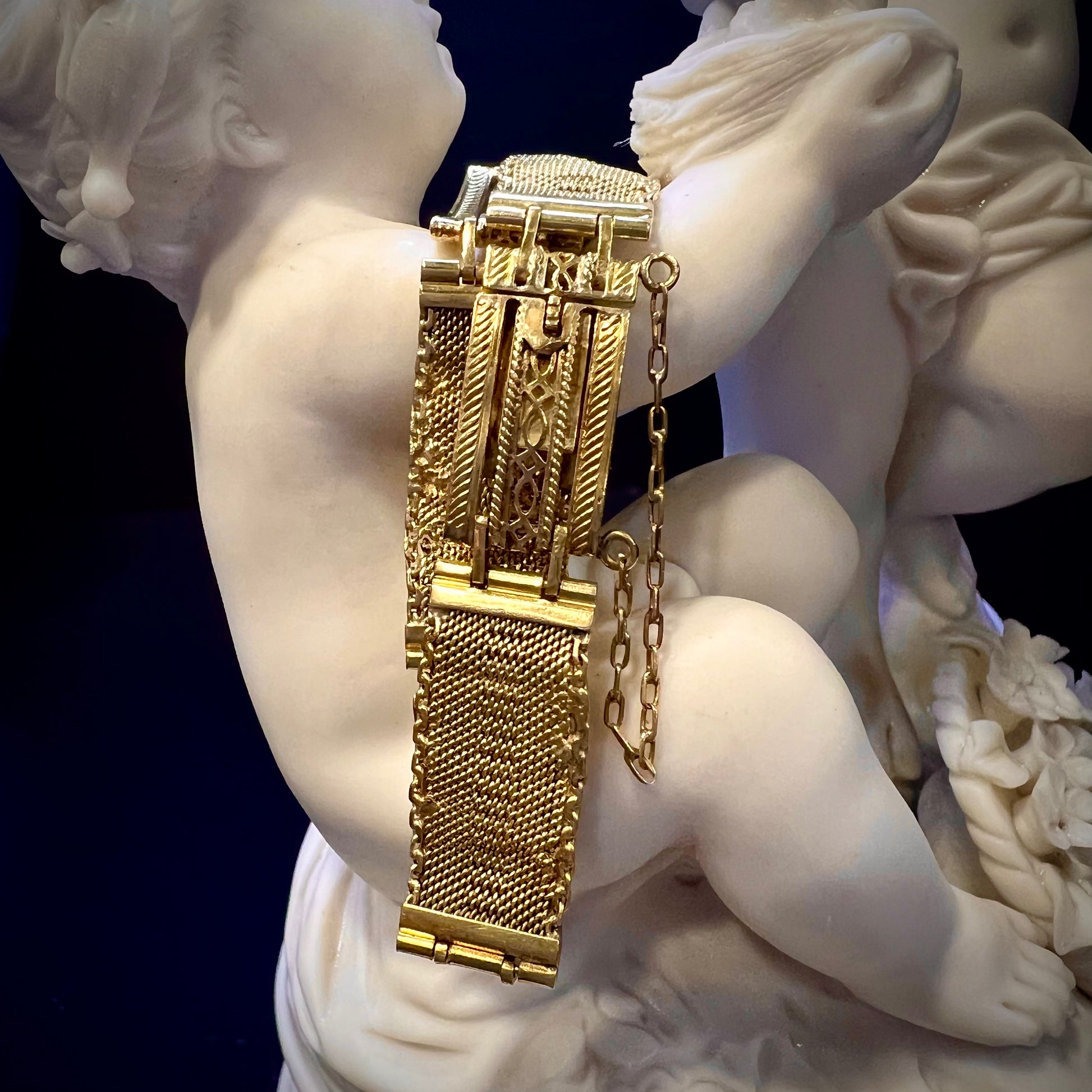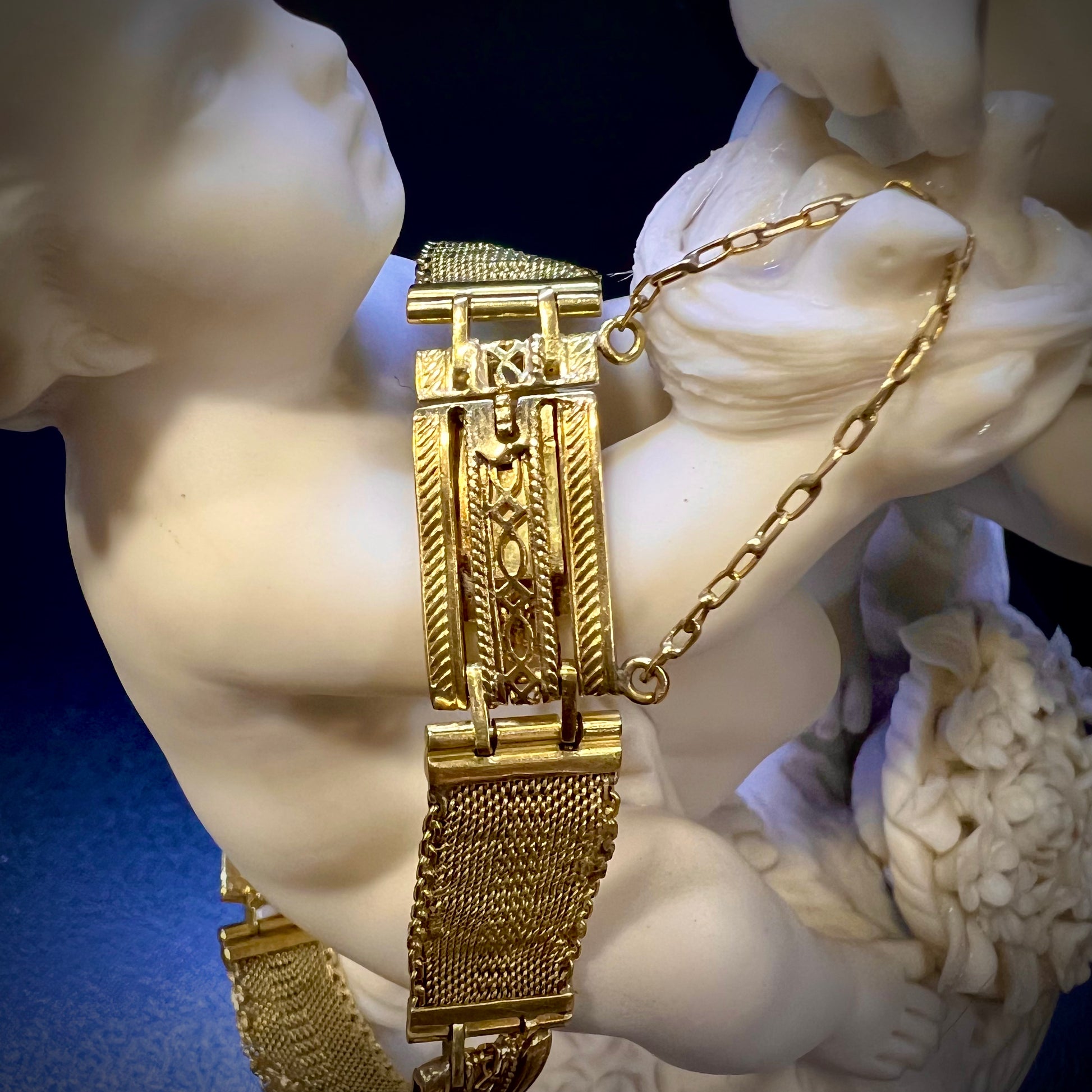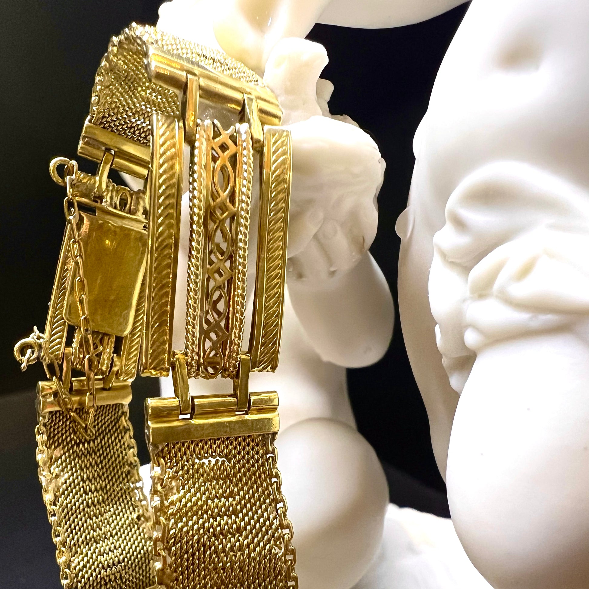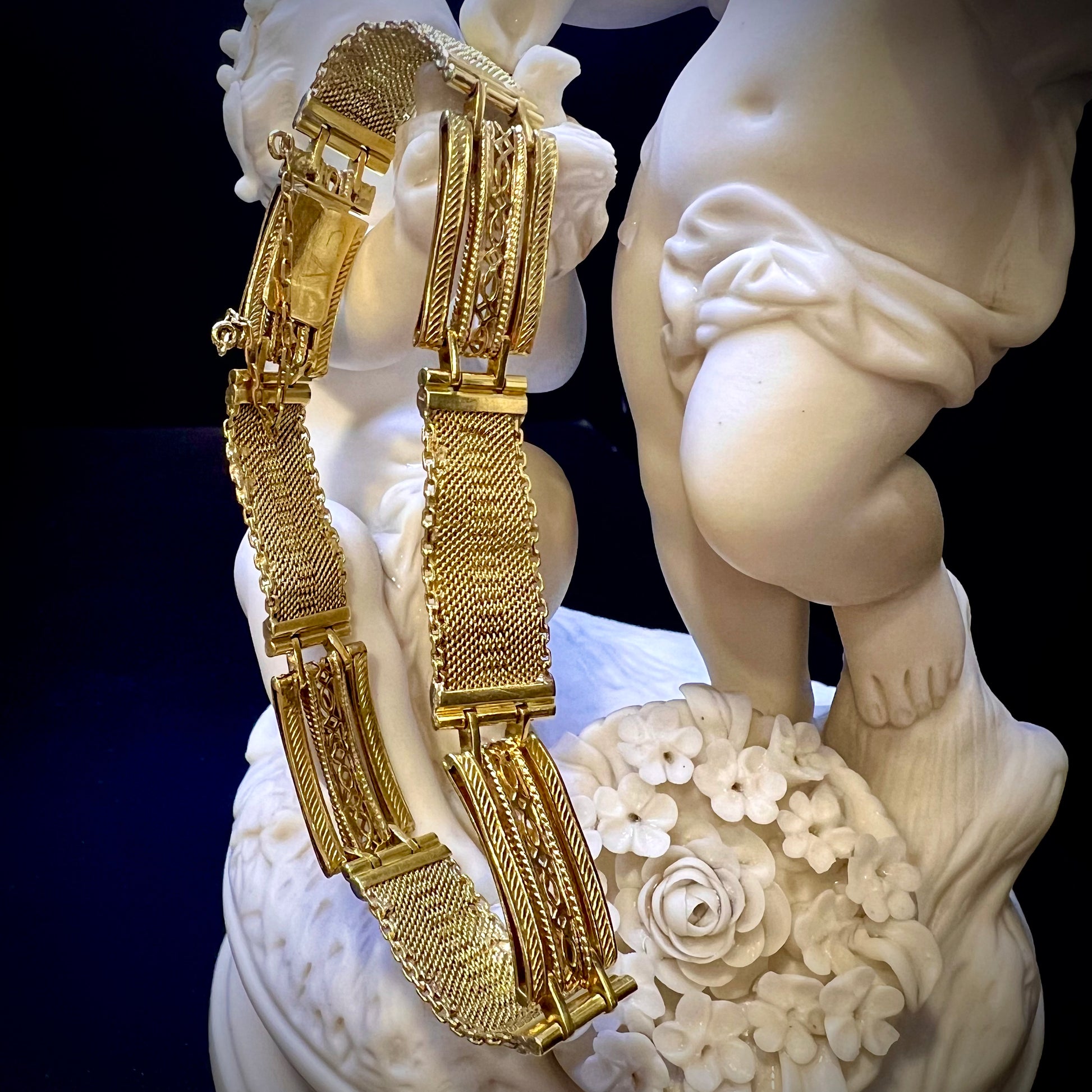 Ein einzigartiges und interessantes Armband mit Paneelen, die durch bewegliche Klammern miteinander verbunden sind. Die Paneele bestehen aus gravierten und gefalteten Bändern, wobei das mittlere durchbrochen ist und sich mit Paneelen aus dickem Golddraht abwechselt. Eine wahrhaft sorgfältige Verarbeitung, die die Ära hochspezialisierter und fachmännischer Handwerkskunst kennzeichnet. Der Verschluss ist eine Sicherheitskette. Hergestellt aus 18 Karat Gelbgold in Italien.