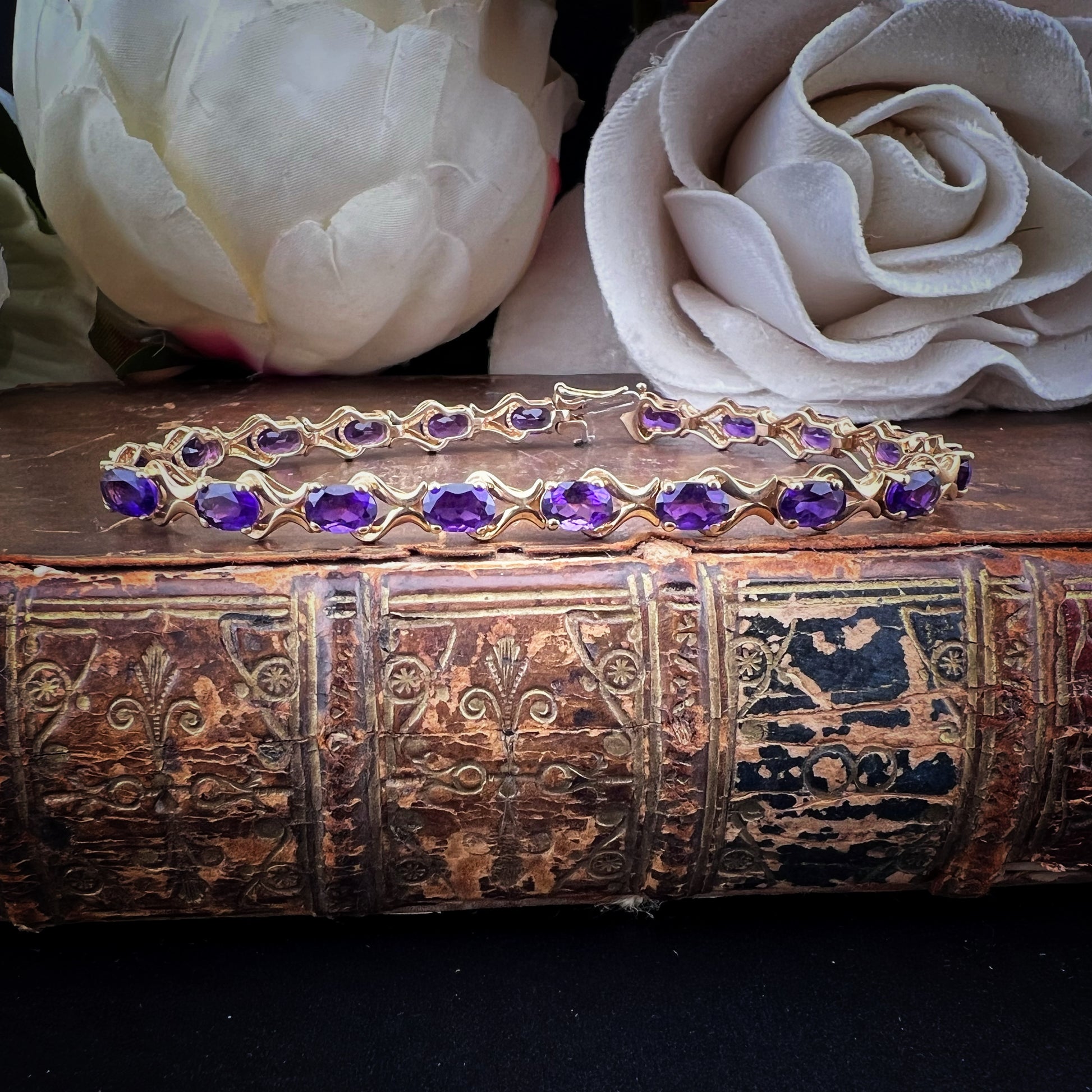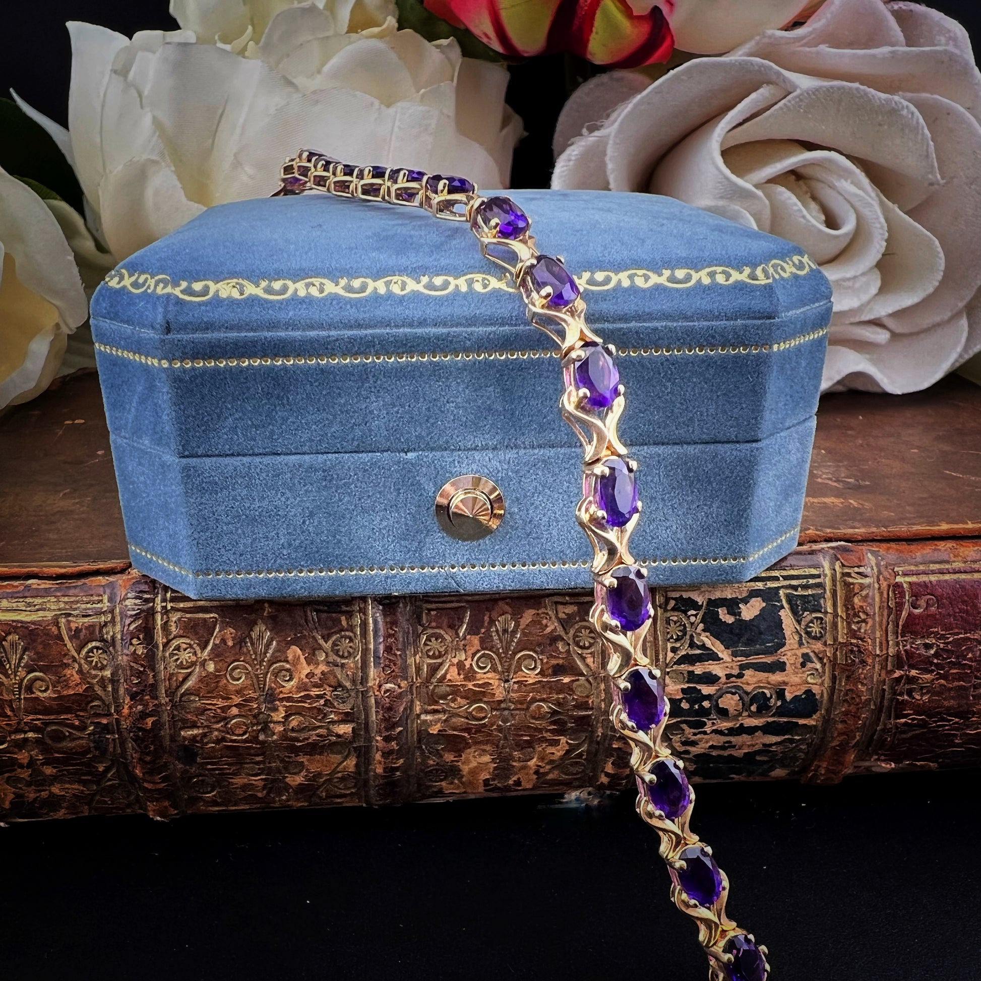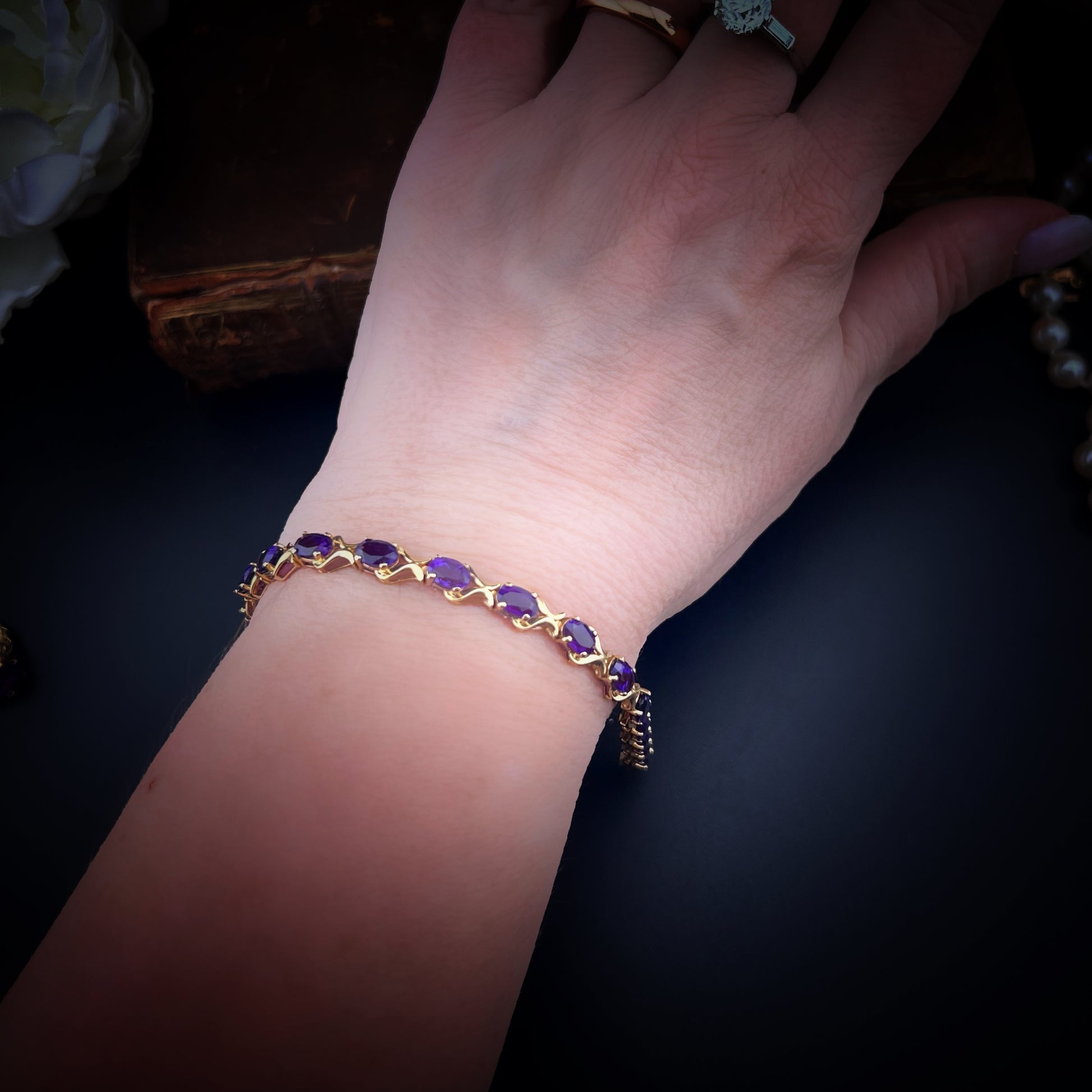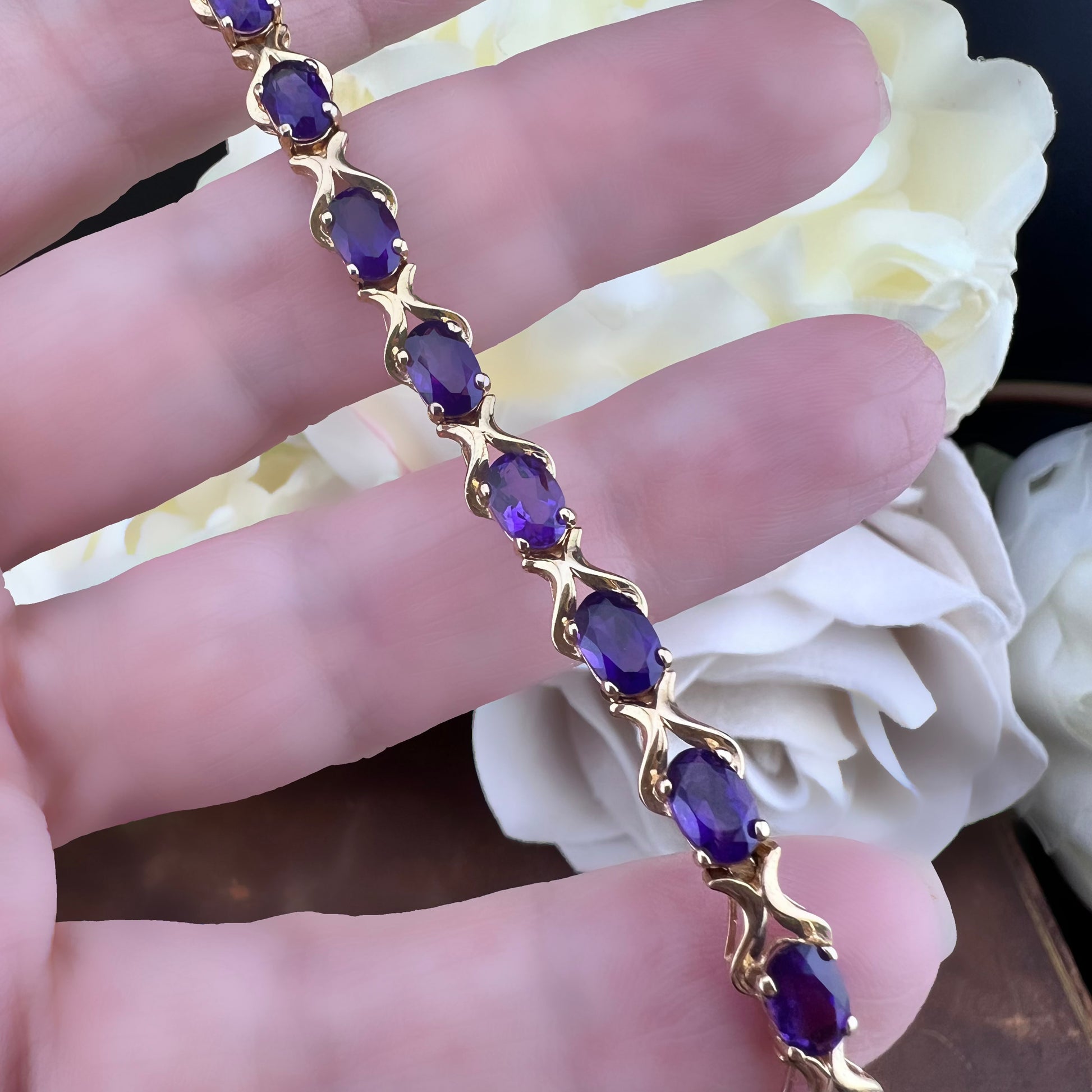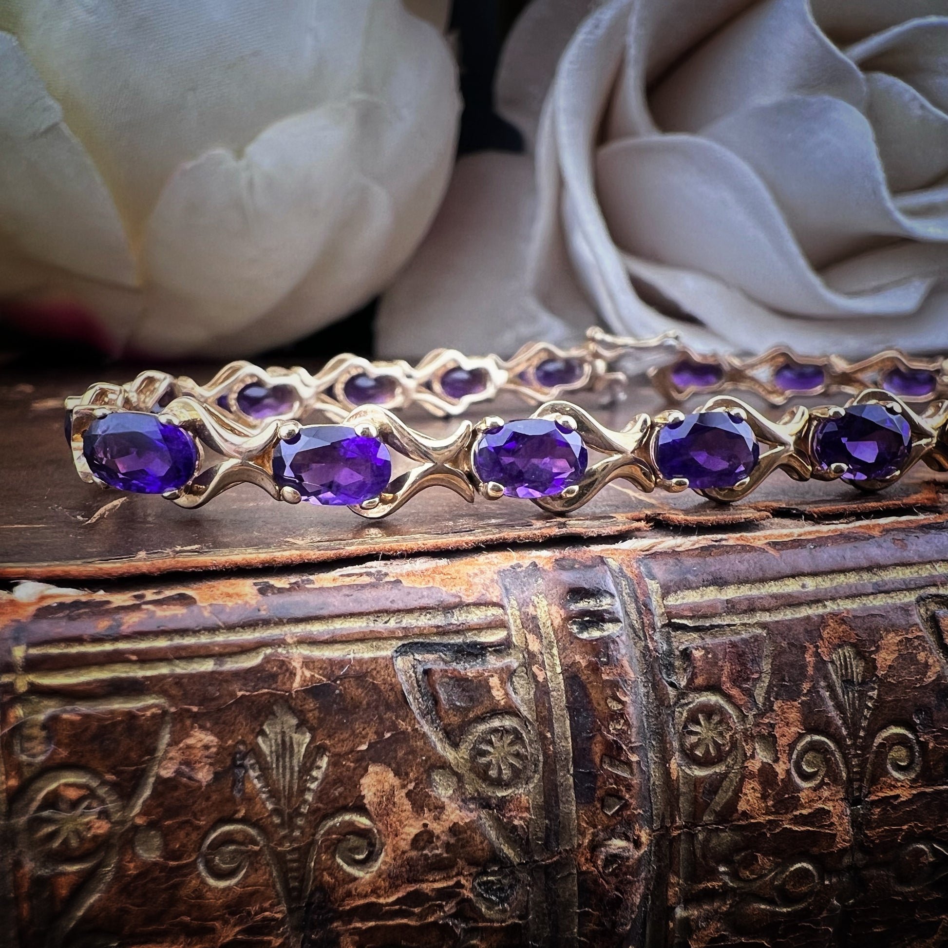 Ein Armband im eleganten und zeitlosen Stil, perfekt für alle, die Schmuck mit einer Geschichte lieben. Dieses edle Vintage-Stück aus 9 Karat Gelbgold besticht durch eine harmonische Abfolge von 19 oval geschliffenen Amethysten, die mit Krappen besetzt und von geschwungenen Bändern durchsetzt sind, die der Komposition Bewegung und Licht verleihen.