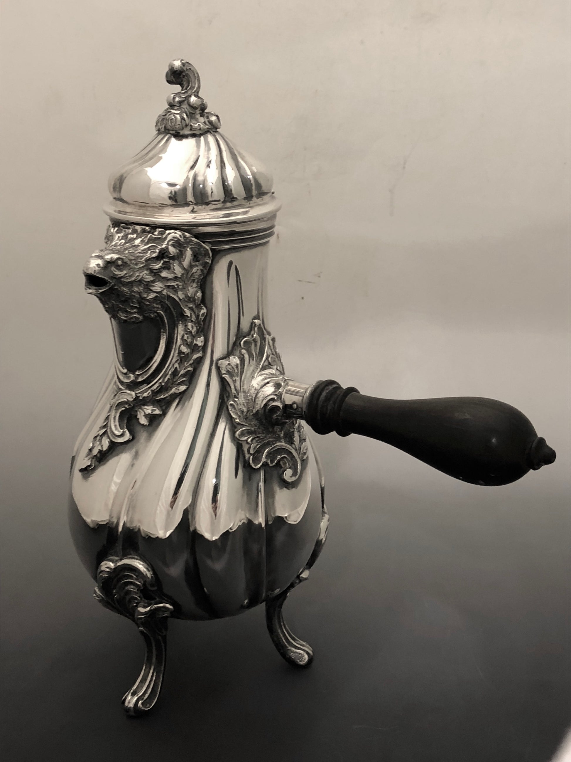 Antike silberne Kaffeekanne mit gedrechseltem Griff aus Ebenholzstange.