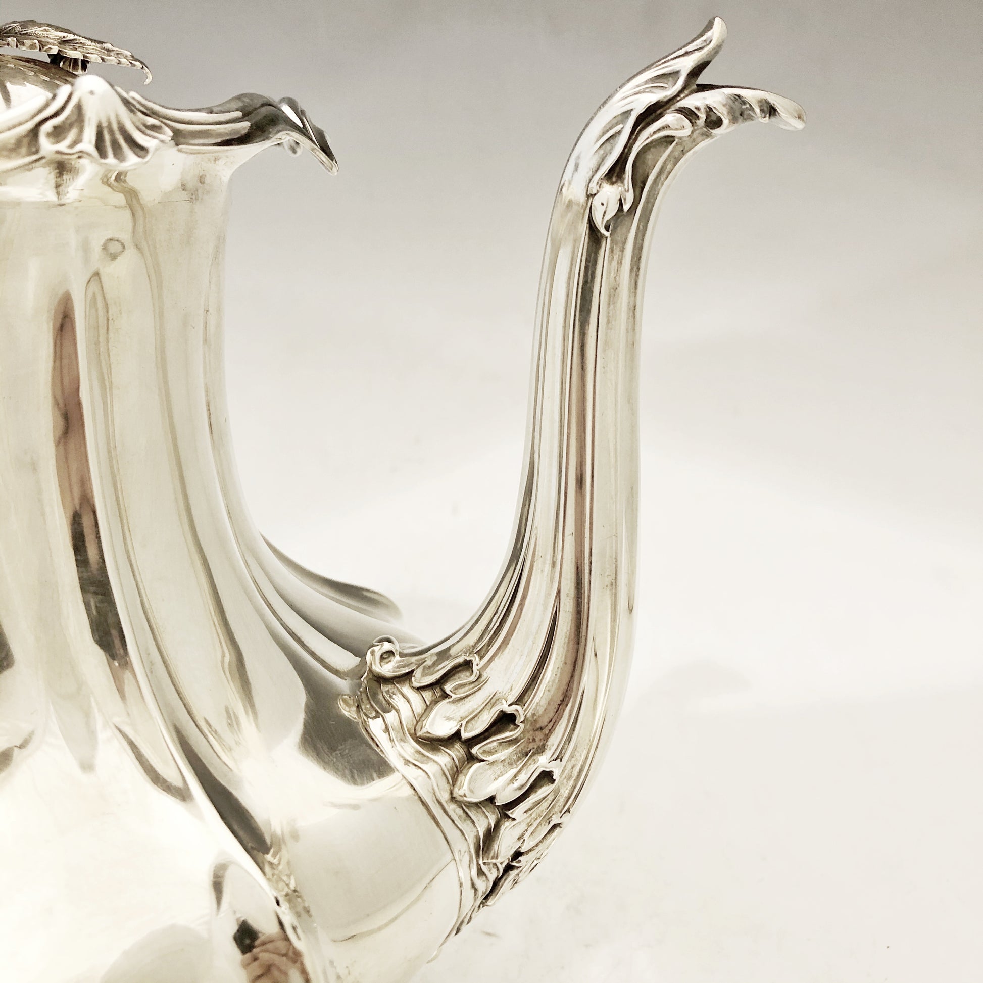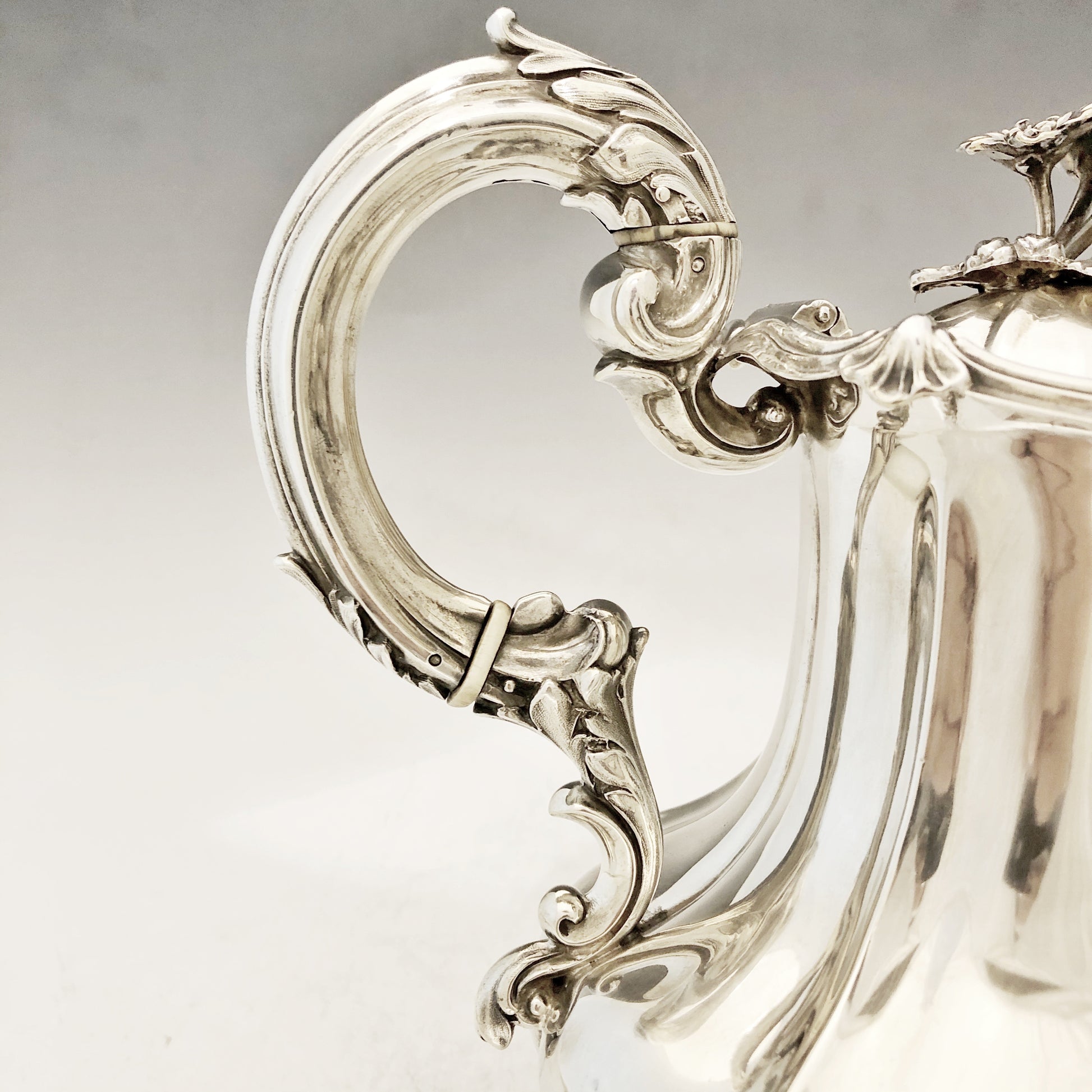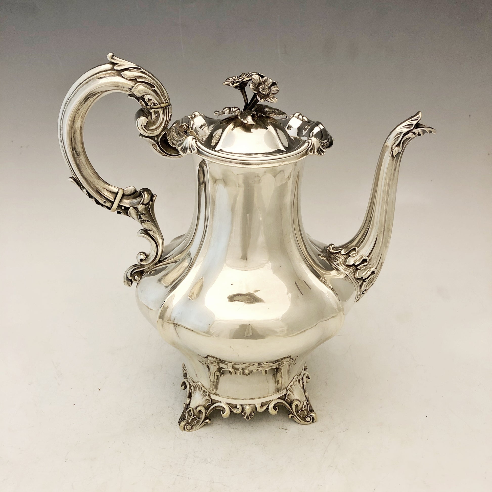 Antike viktorianische Kaffeekanne mit geripptem Korpus und einem Griff in Form eines Akanthusblatts mit elfenbeinfarbenem Wärmetrenner. Der Schwanenhalsausguss ist an Hals und Ausguss mit Blattdekor verziert. Der Klappdeckel besitzt einen blütenförmigen Griff. Die Kanne steht auf einem ziselierten, vierbeinigen Sockel aus Gusseisen. Gefertigt aus Silber und signiert von Charles Reily & George Storer, London, 1843.