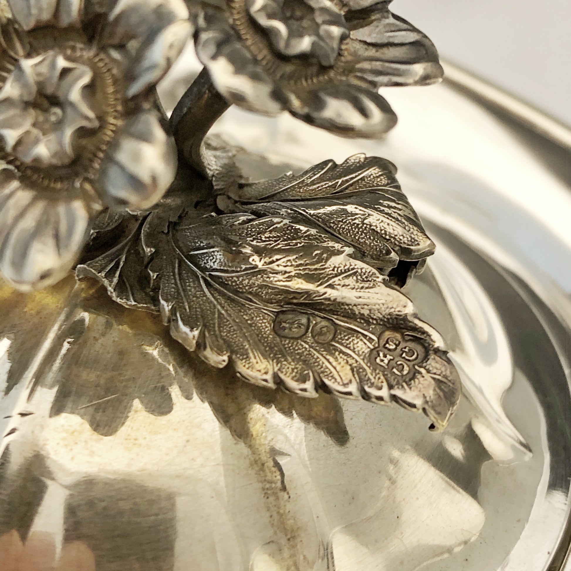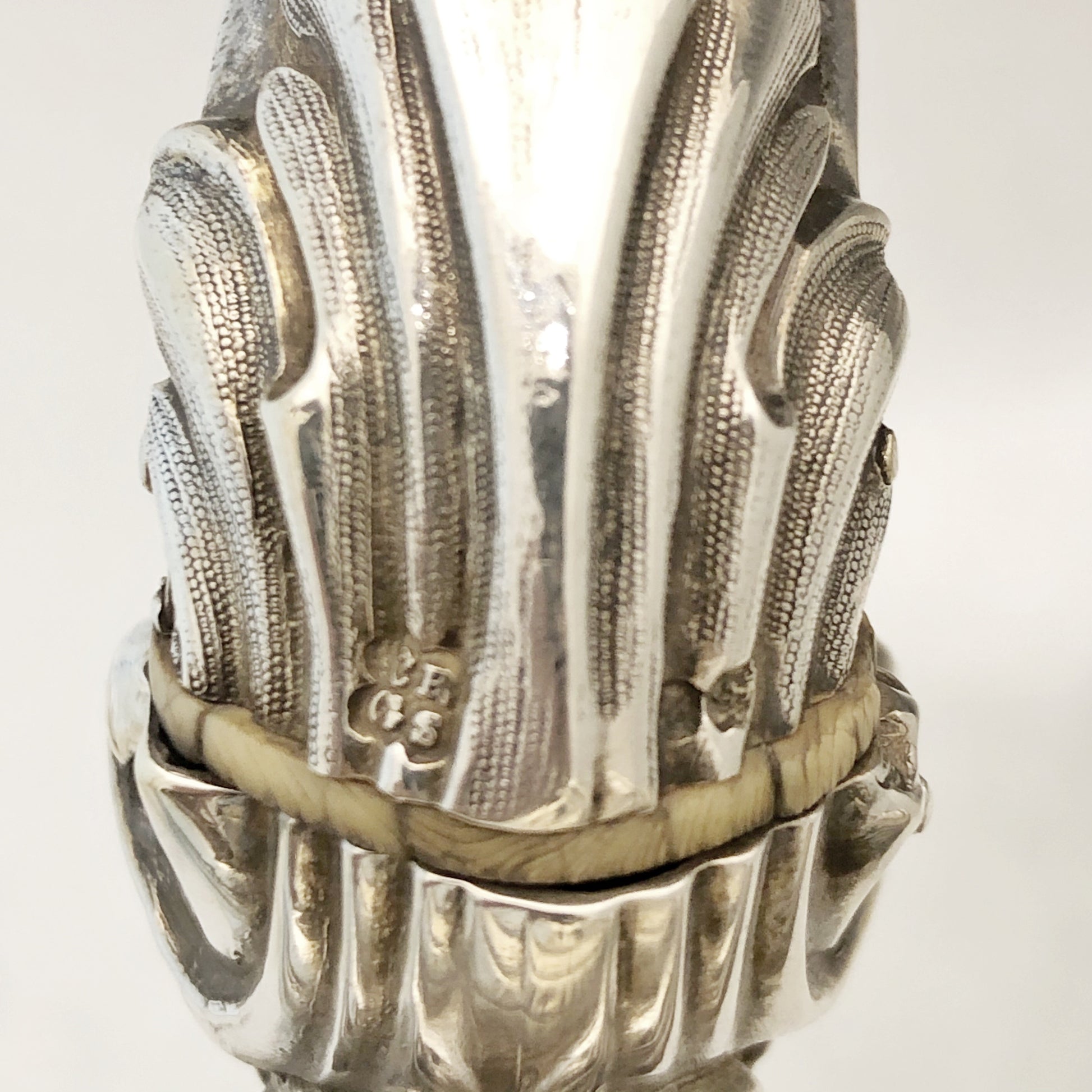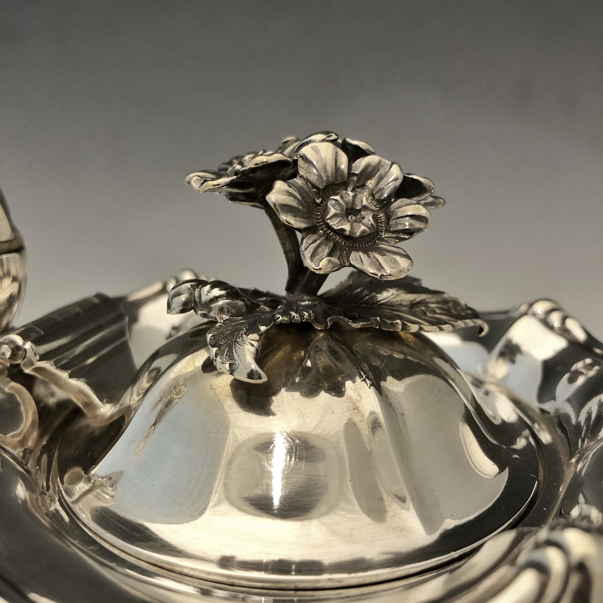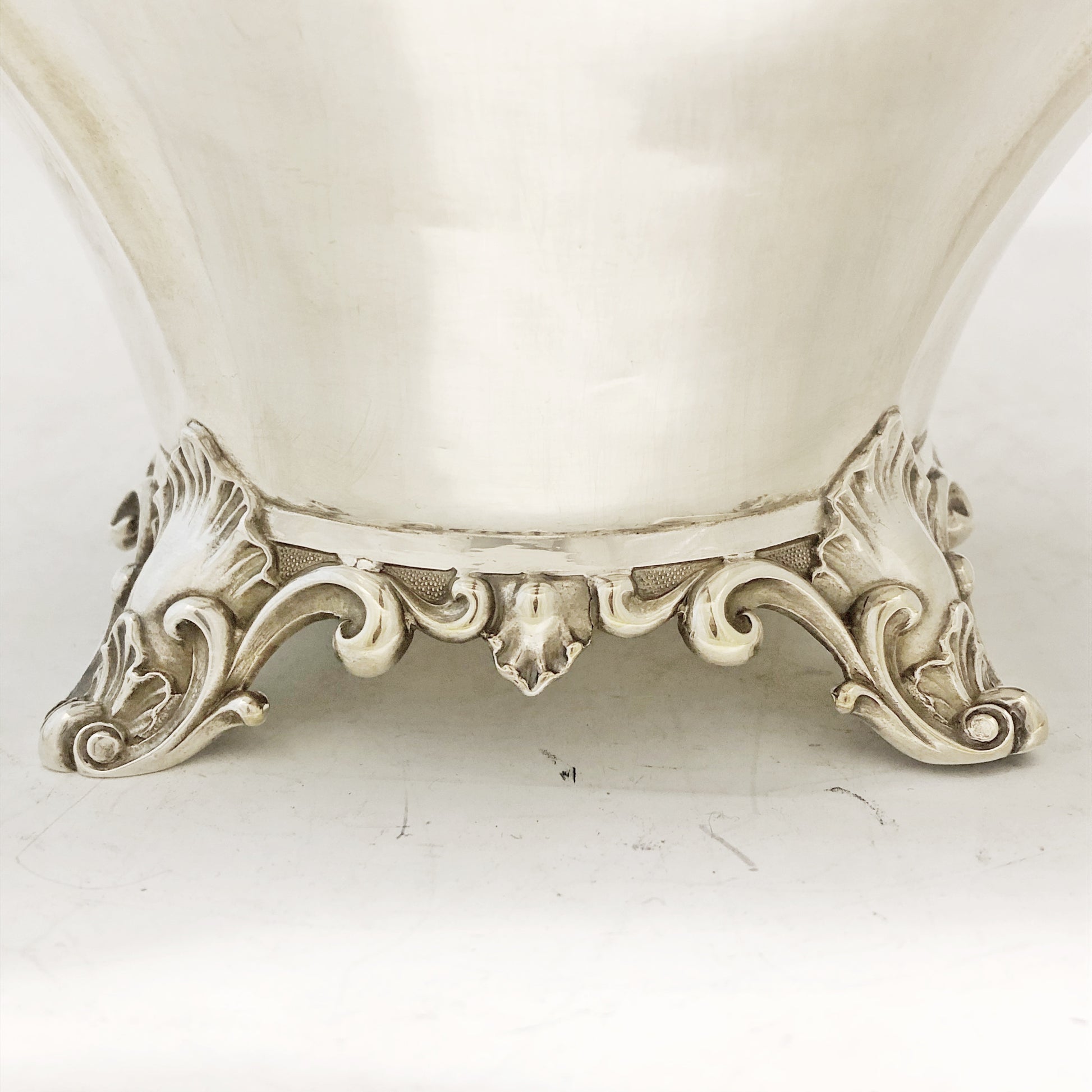Antike viktorianische Kaffeekanne mit geripptem Korpus und einem Griff in Form eines Akanthusblatts mit elfenbeinfarbenem Wärmetrenner. Der Schwanenhalsausguss ist an Hals und Ausguss mit Blattdekor verziert. Der Klappdeckel besitzt einen blütenförmigen Griff. Die Kanne steht auf einem ziselierten, vierbeinigen Sockel aus Gusseisen. Gefertigt aus Silber und signiert von Charles Reily & George Storer, London, 1843.