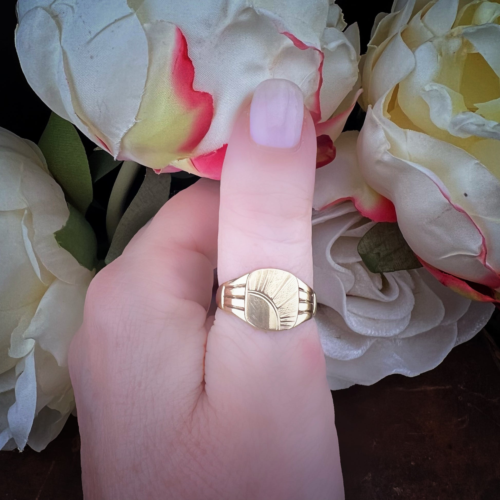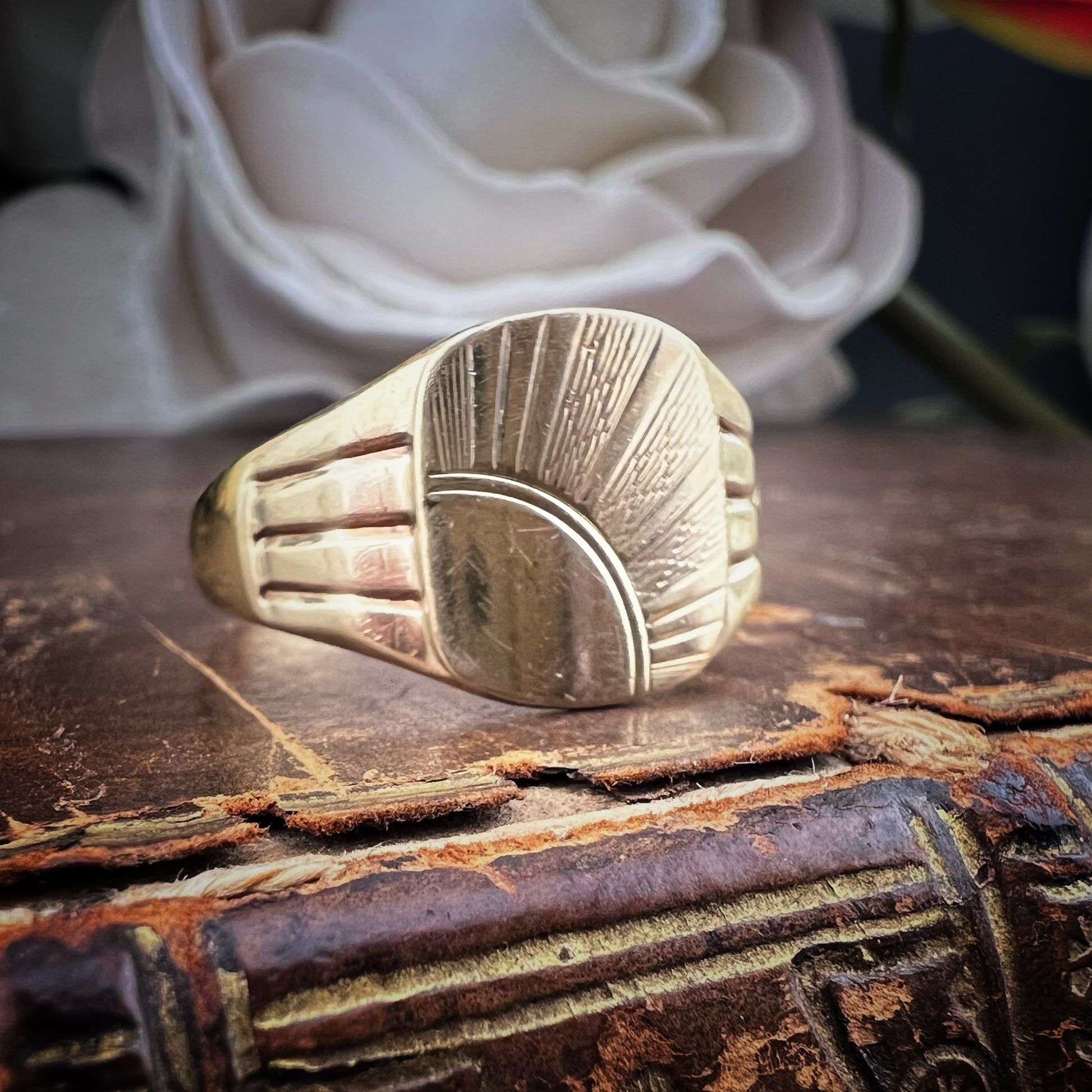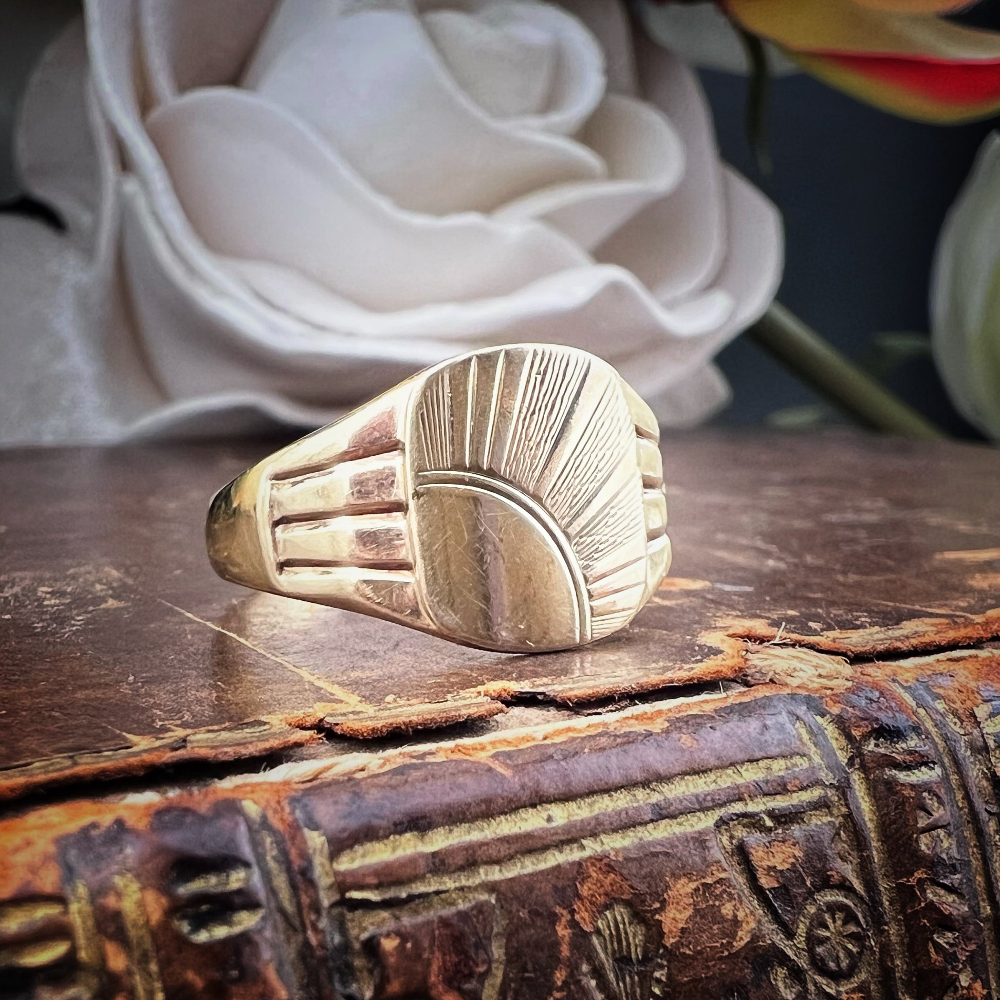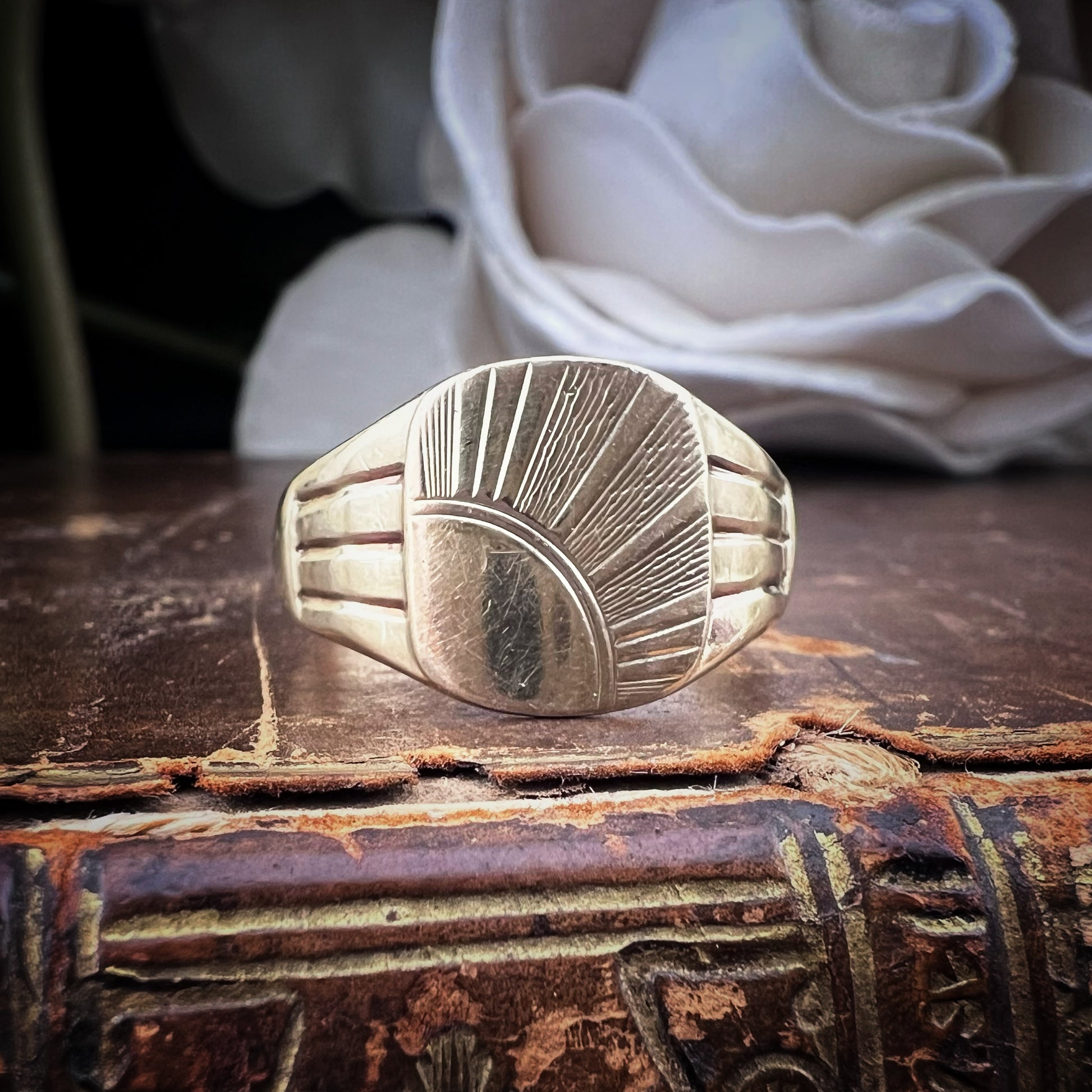 Ein zeitloser, aussagekräftiger Siegelring, verziert mit einem handgravierten Design mit einem strahlenden Sonnenmotiv – eine mögliche Hommage an die aufgehende Sonne, ein Symbol der Wiedergeburt und inneren Stärke.