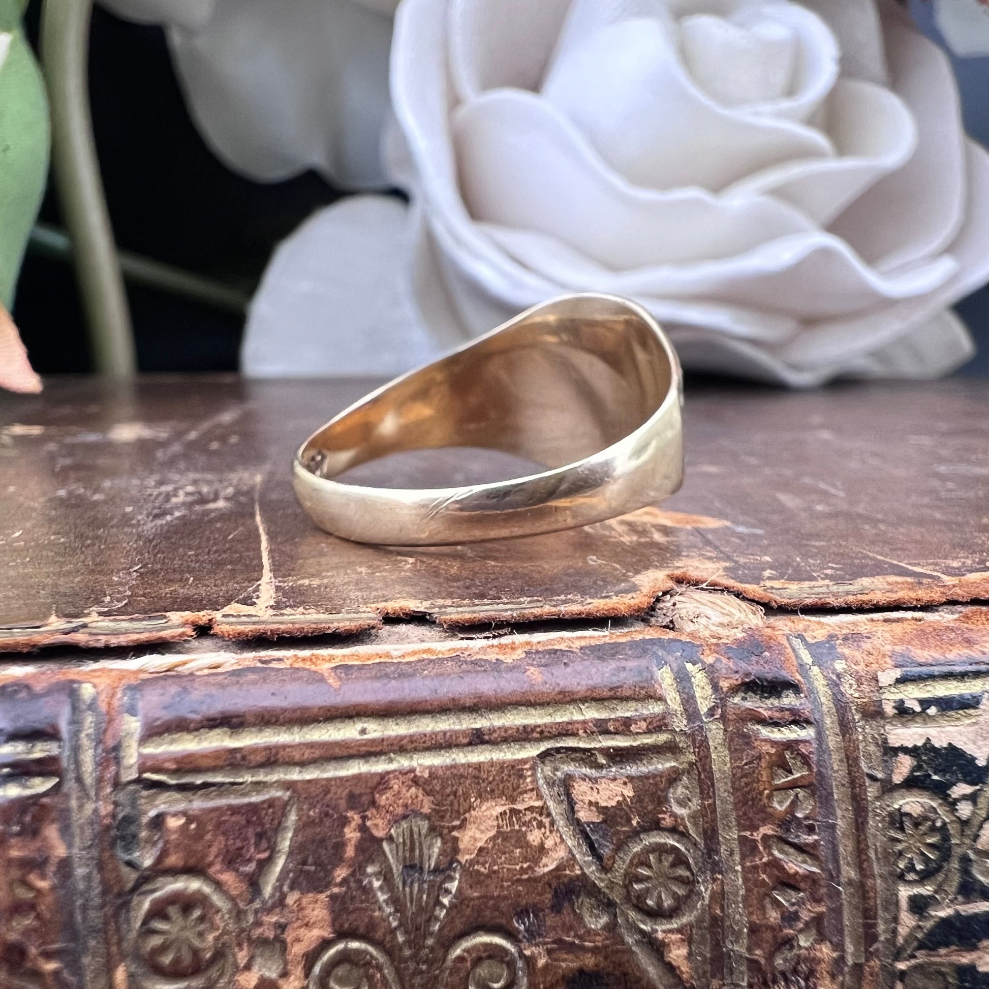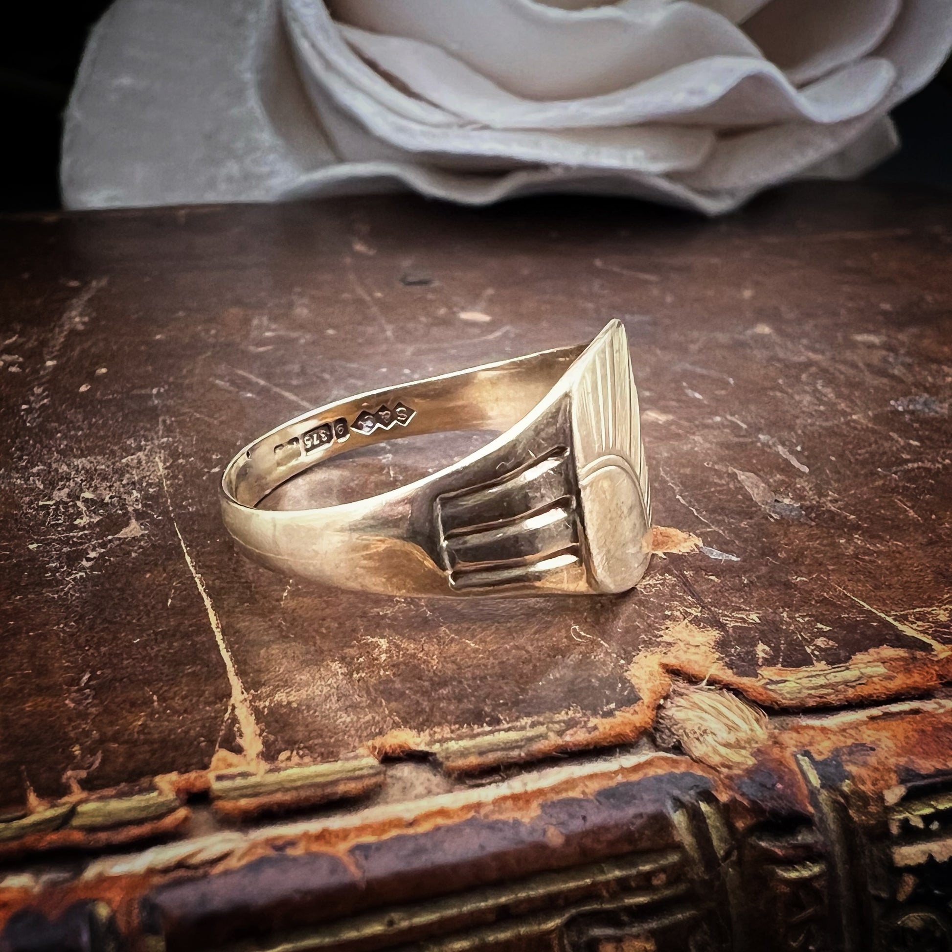 Dieser Ring aus 9-karätigem Gelbgold stammt aus England und stammt aus den 1970er Jahren. Er befindet sich in ausgezeichnetem Zustand. Die Handwerkskunst macht jedes Detail einzigartig, insbesondere die große, leuchtende zentrale Verzierung, die sich ideal zum Tragen am kleinen Finger oder als Statement-Piece eignet.