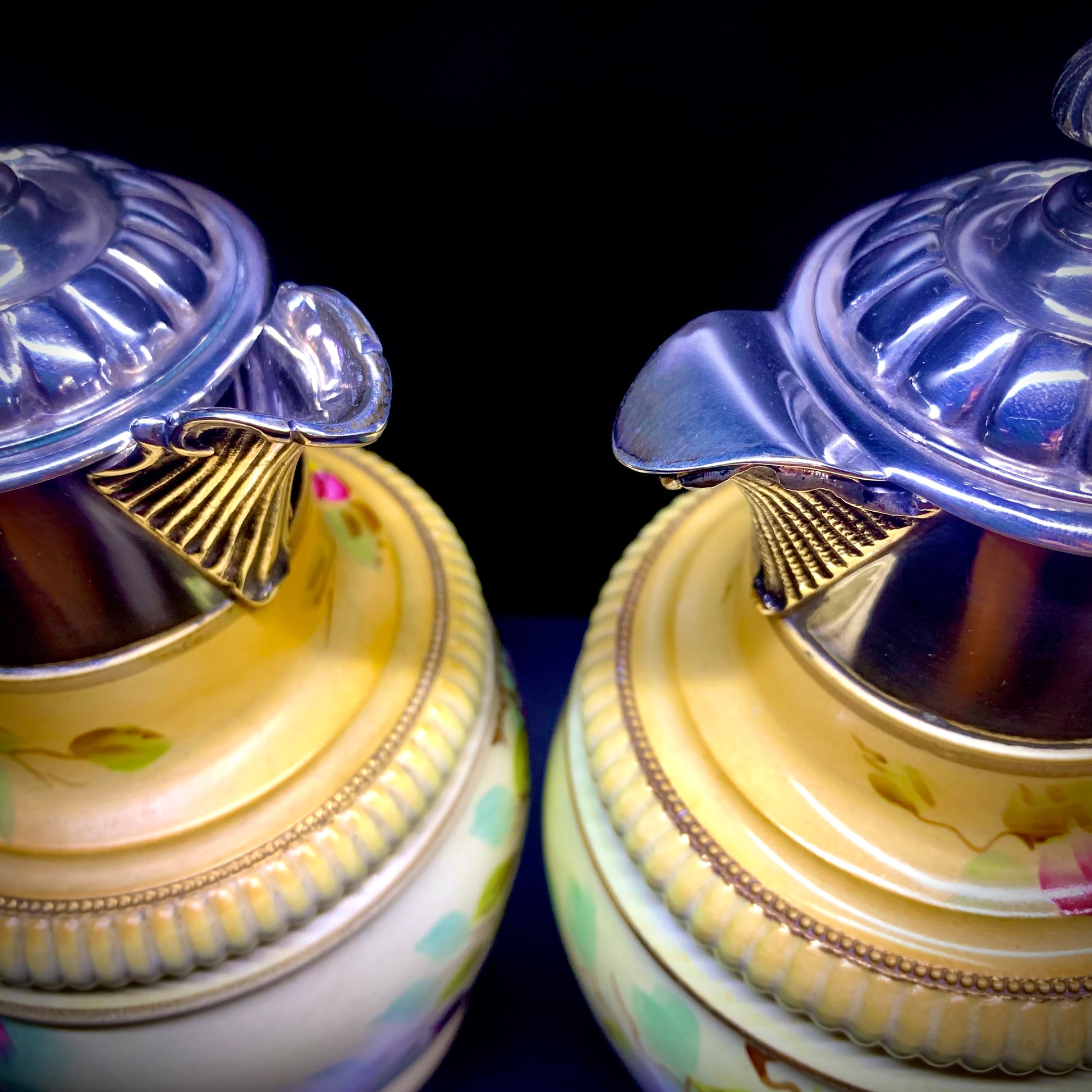 Antikes Paar handbemalter polychromer Keramikausgüsse, montiert auf einer Sheffield-Platte, im Wachsausschmelzverfahren hergestellt und von Hand gemeißelt.