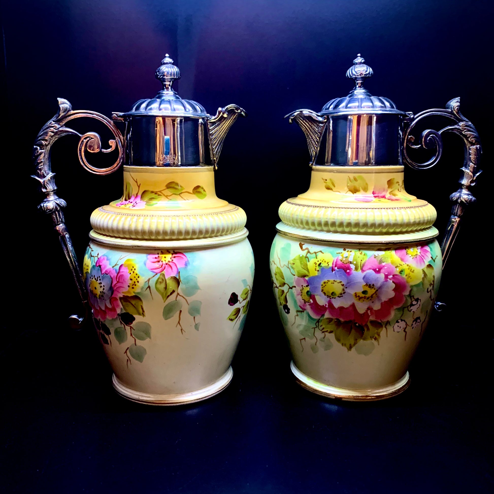 Ein Paar polychrome Keramikausgießer und ein Sheffield-Teller. Hergestellt von James Deakin in England gegen Ende des 19. Jahrhunderts.