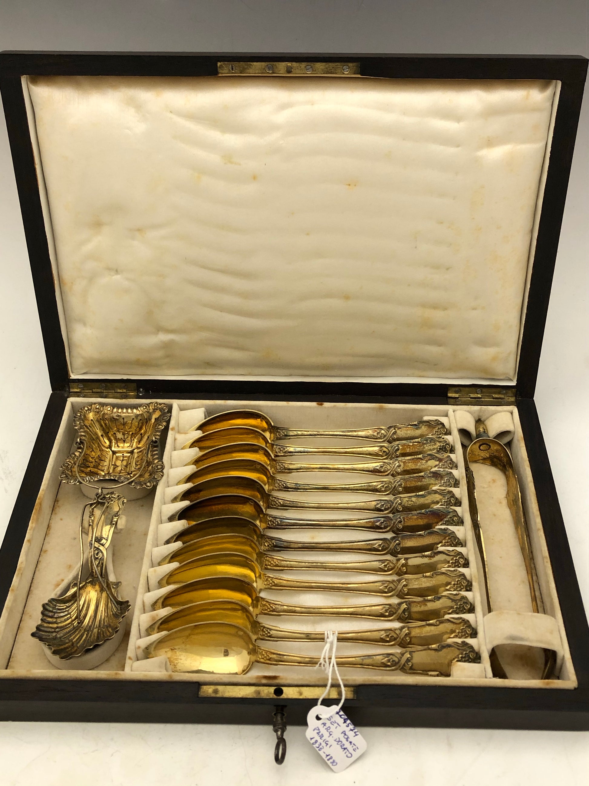 Ein seltenes Teelöffel-Set aus vergoldetem Silber mit Zuckerzange, Teesieb und Messlöffel in der Originalverpackung. Paris, 1838–1880.