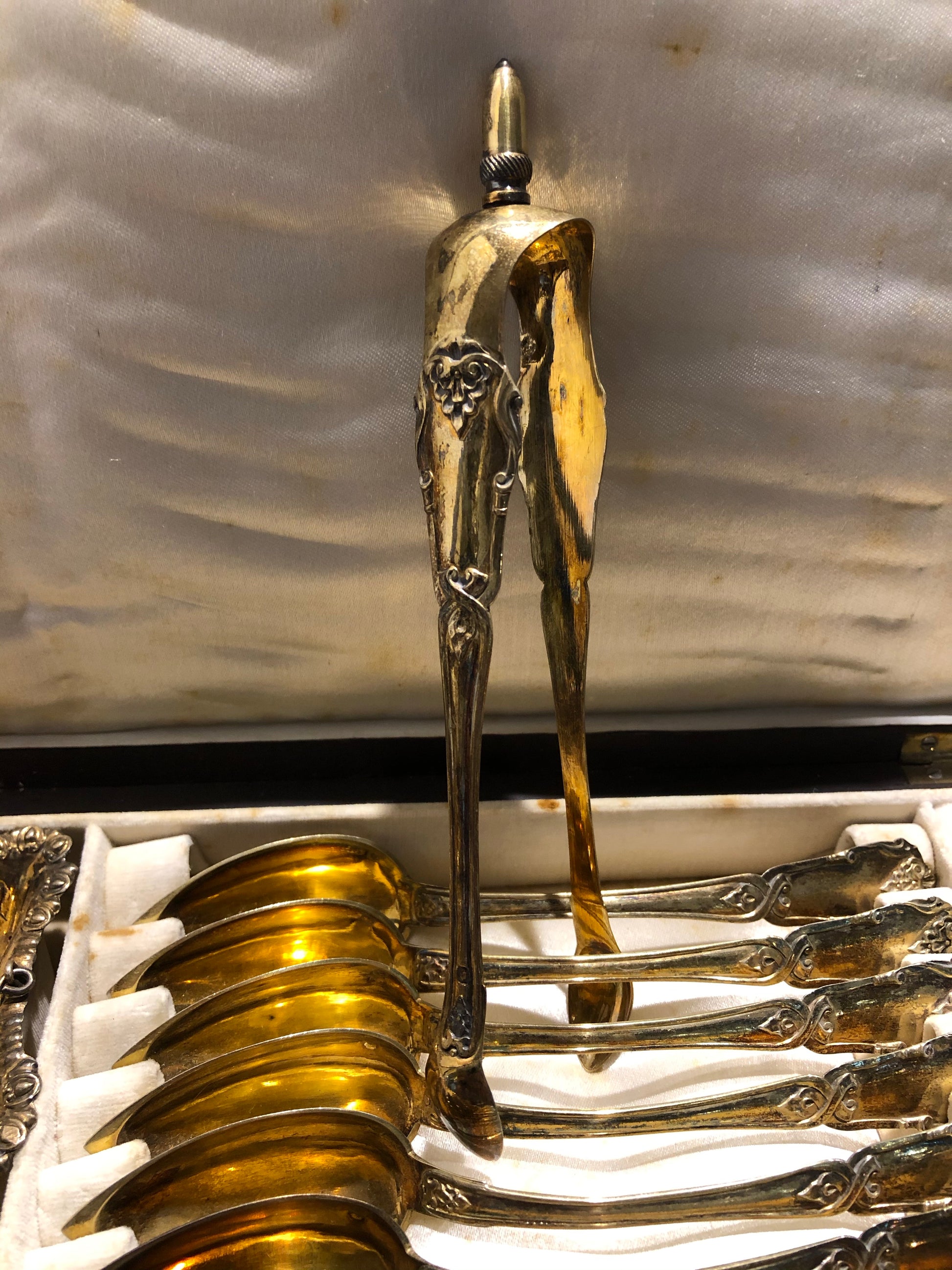 Seltenes Teelöffel-Set (15 cm) aus vergoldetem Silber, komplett mit Zubehör, Pinzette, Teekannensieb und Messbecher.