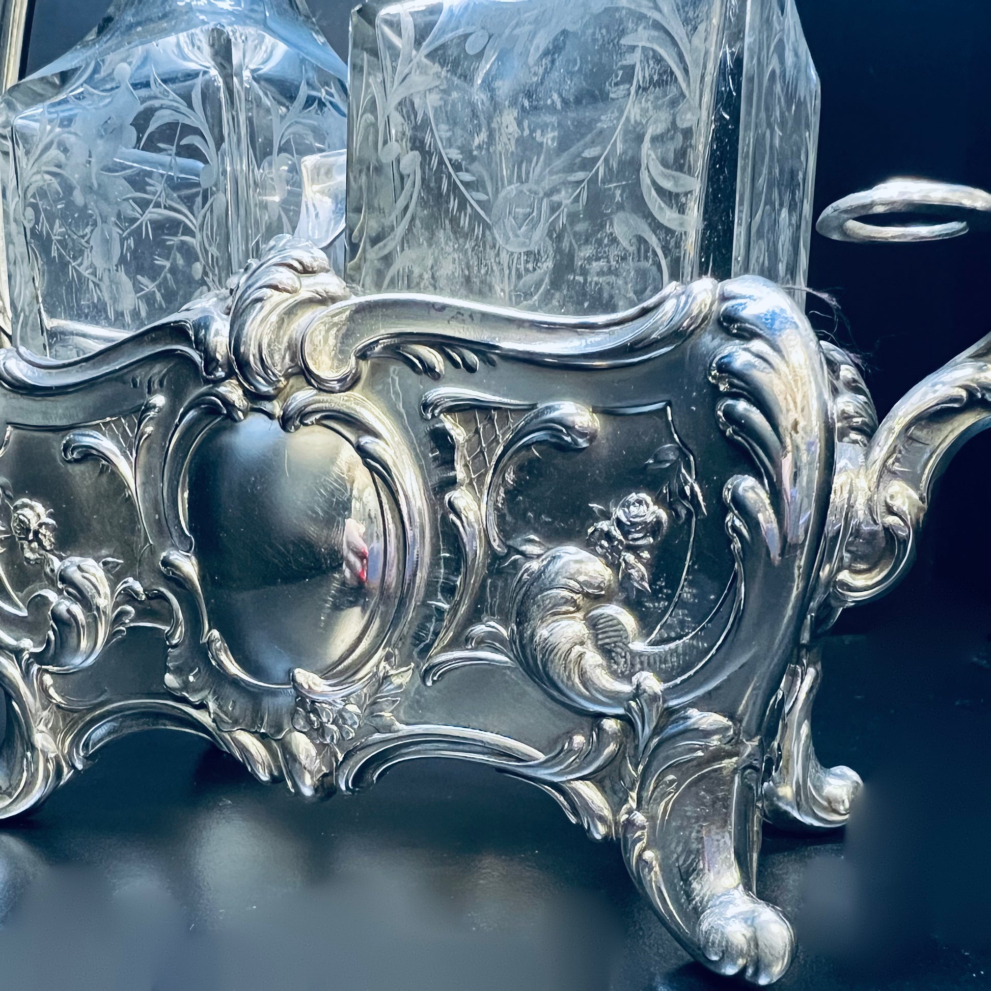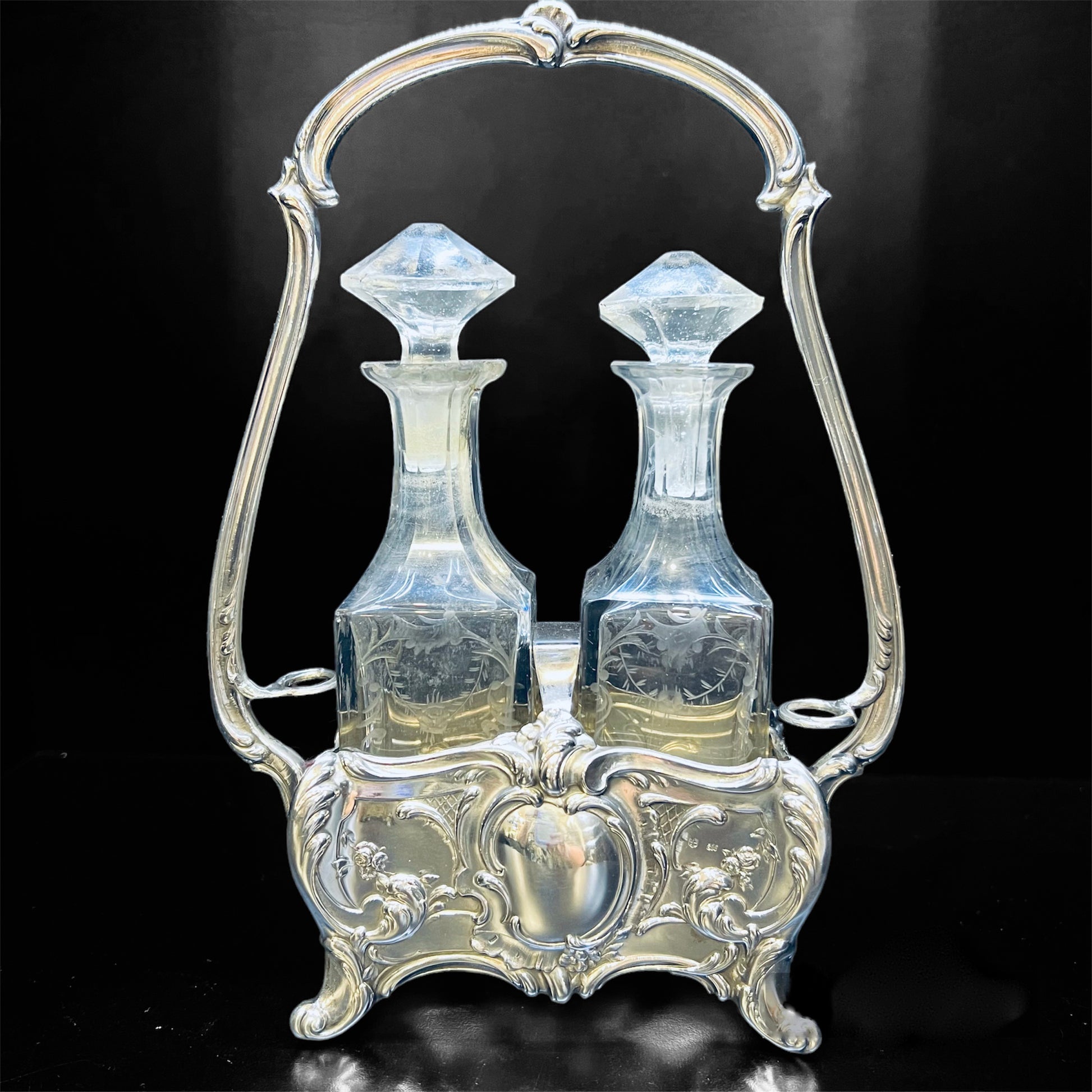 Eine wunderschöne Ölkanne, ein perfektes Beispiel der Jugendstilbewegung. Dieser 800/1000 Silberkorb enthält die beiden originalen quadratischen Ölkannen mit kunstvollem Schliff. Der Henkel ist ein dekoratives Element, das nicht nur zum Tragen dient, sondern auch die gesamte Komposition einrahmt.