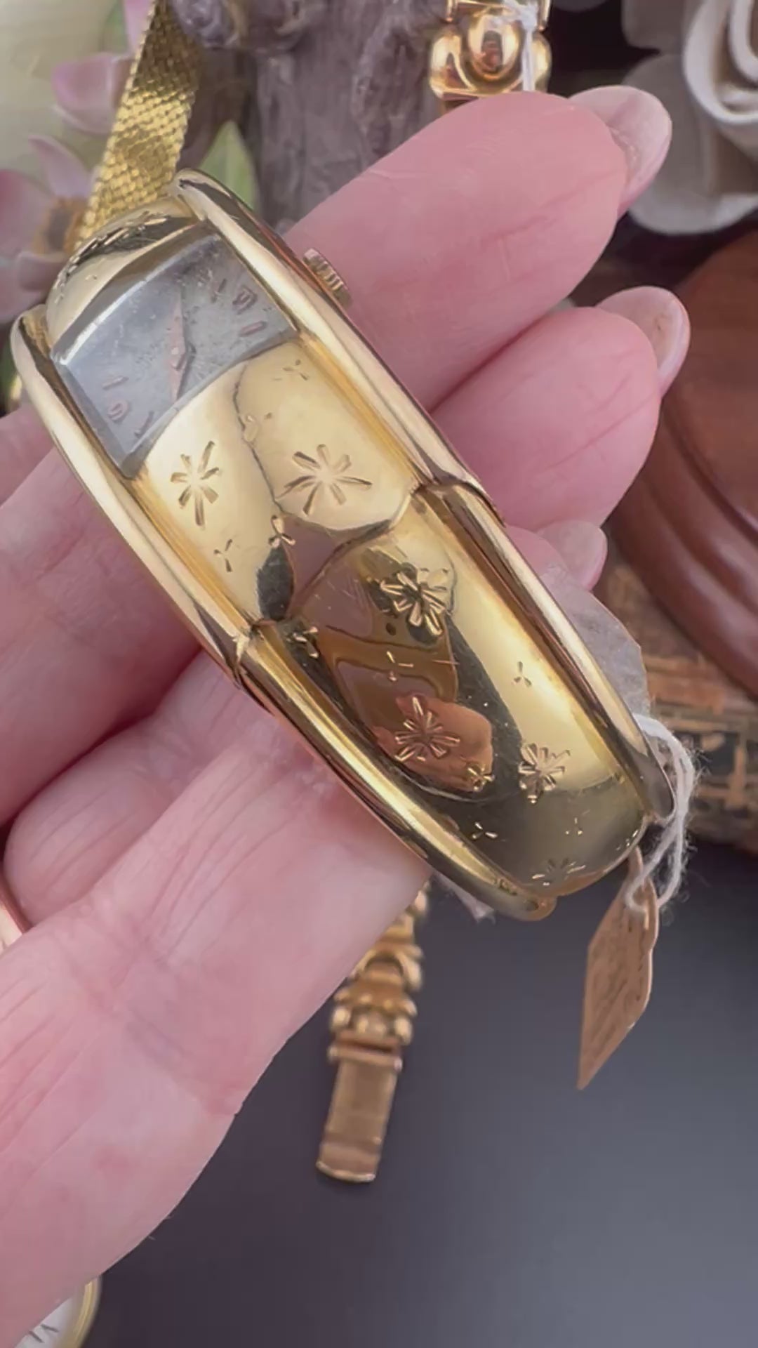 Das Armband verfügt über eine Aussparung für das quadratische Zifferblatt. Das Wyler Vetta-Logo ist sichtbar.