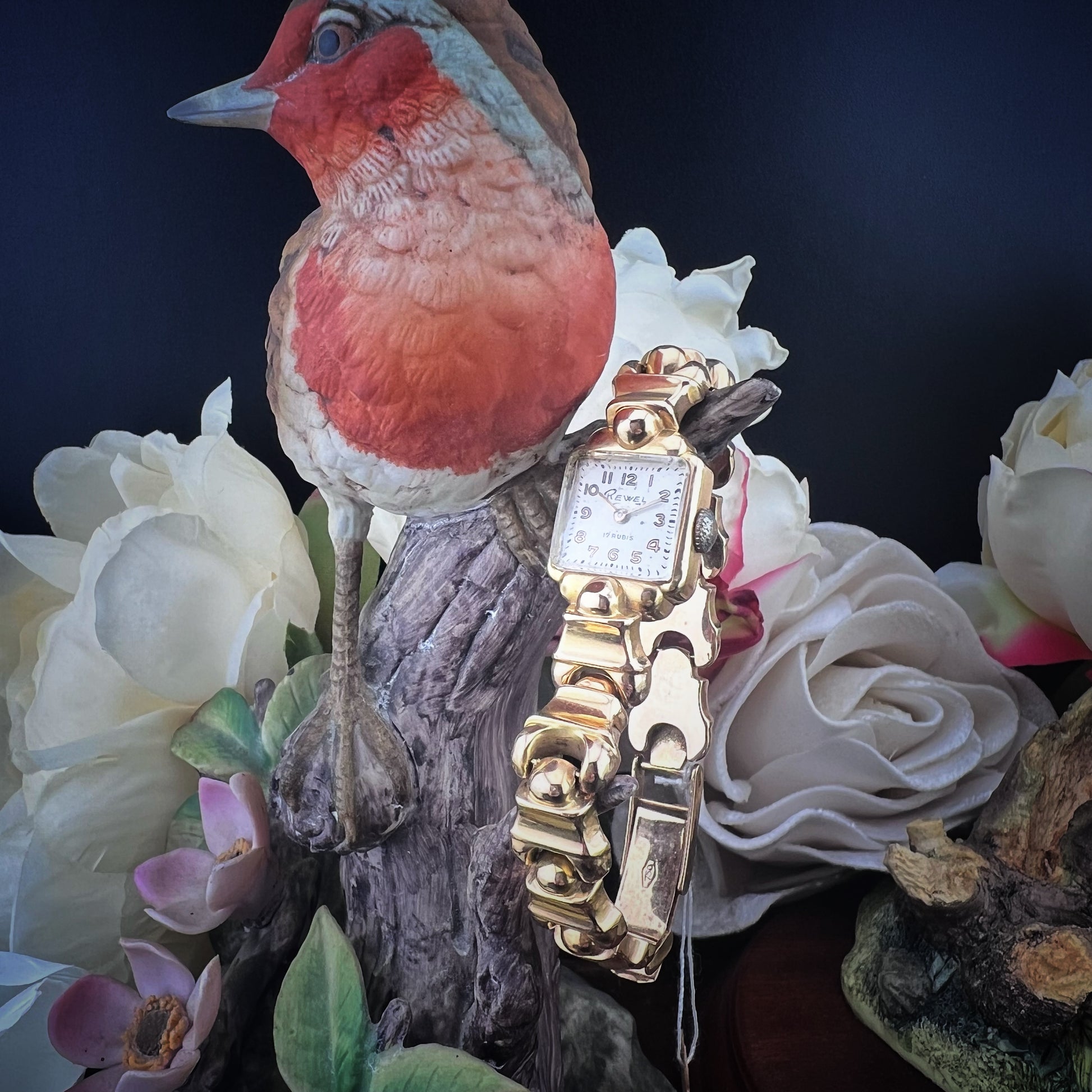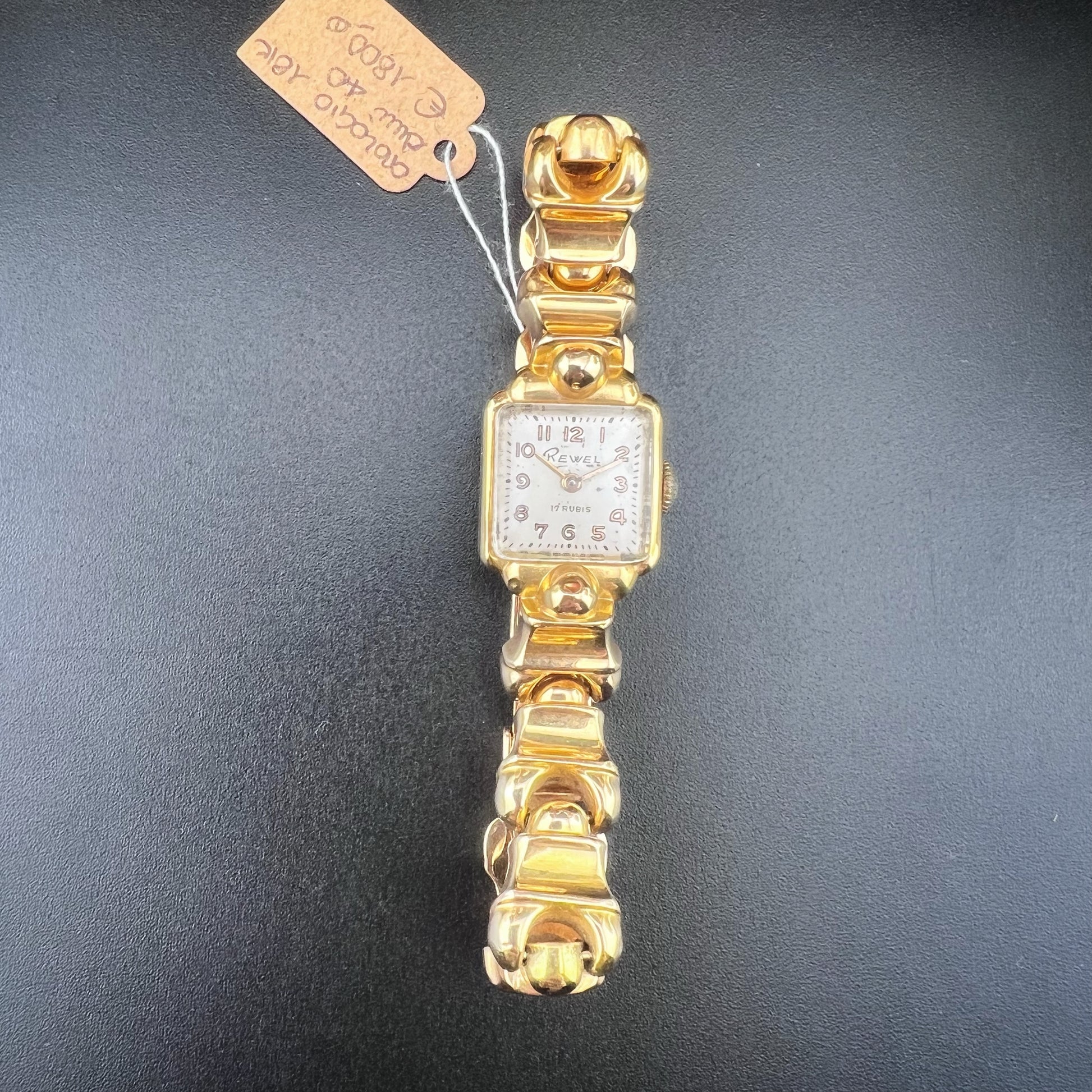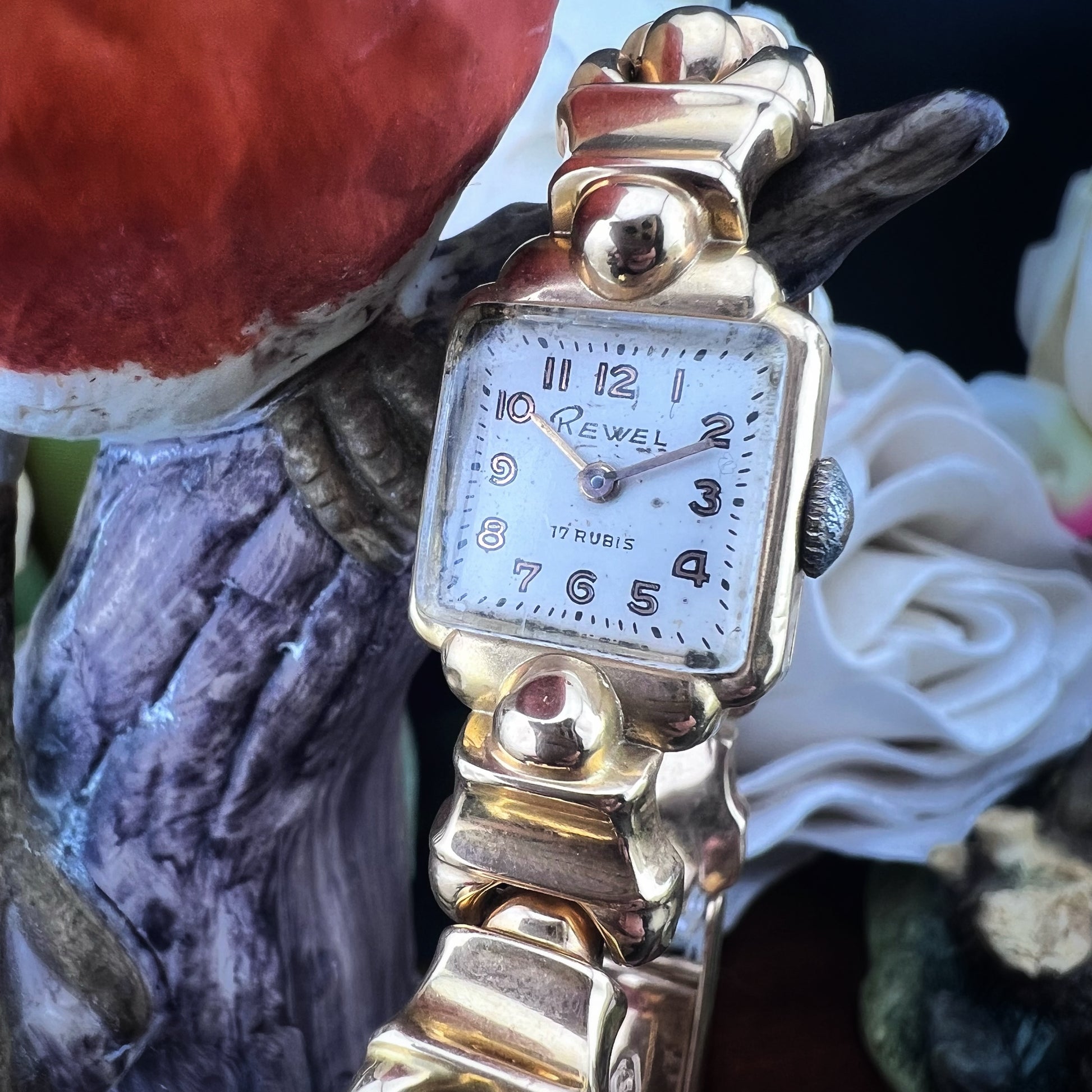 Das quadratische Zifferblatt trägt die REWEL-Signatur und die 17-Juwelen-Spezifikation.