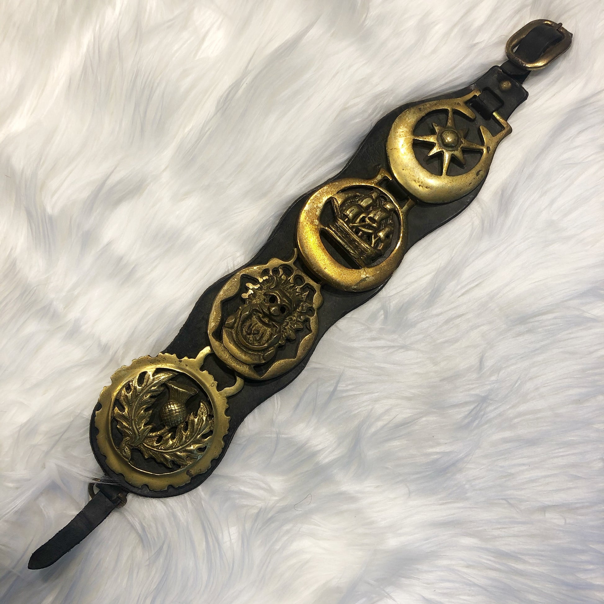 Paradegeschirr aus Messing mit originaler Arbeitspferdschnalle.