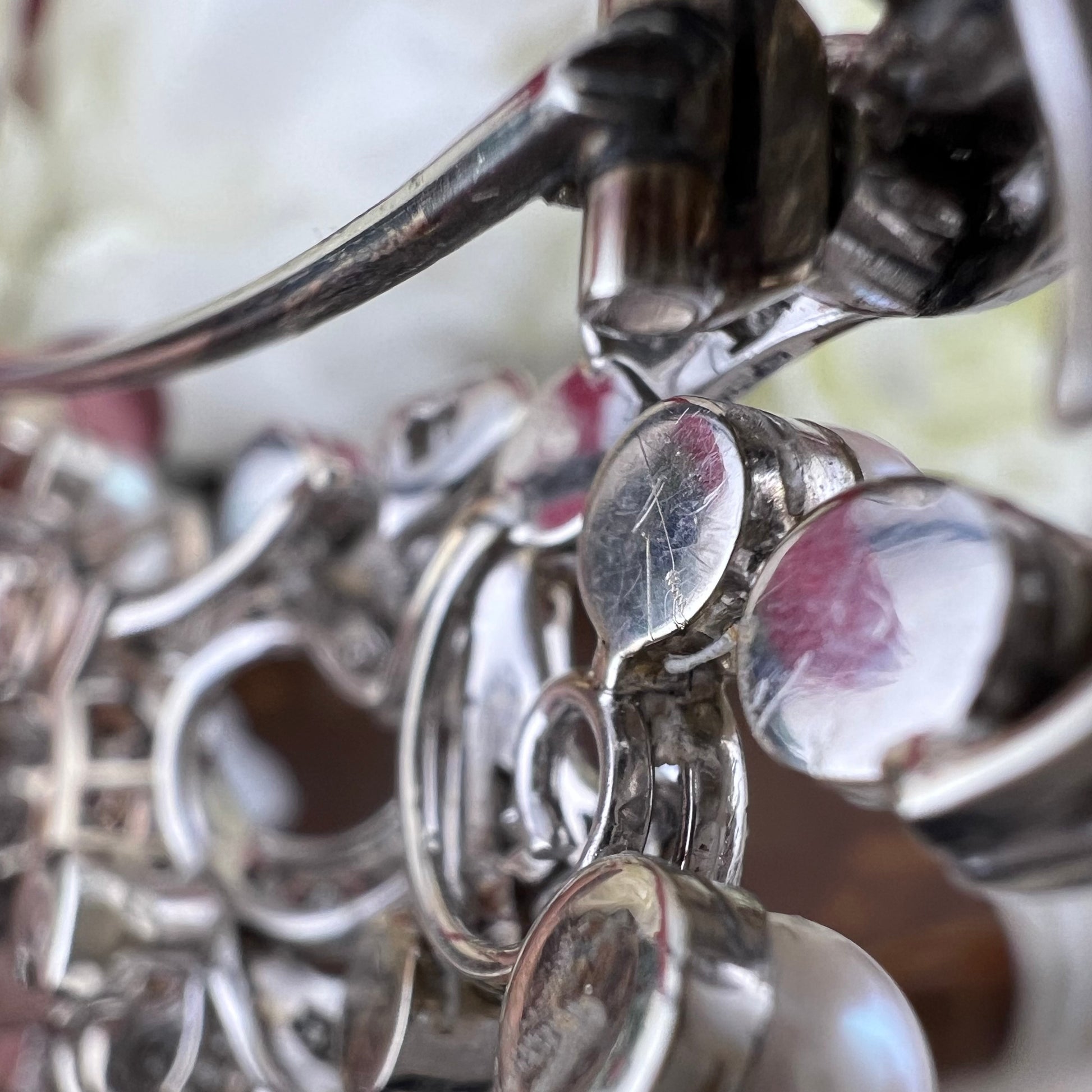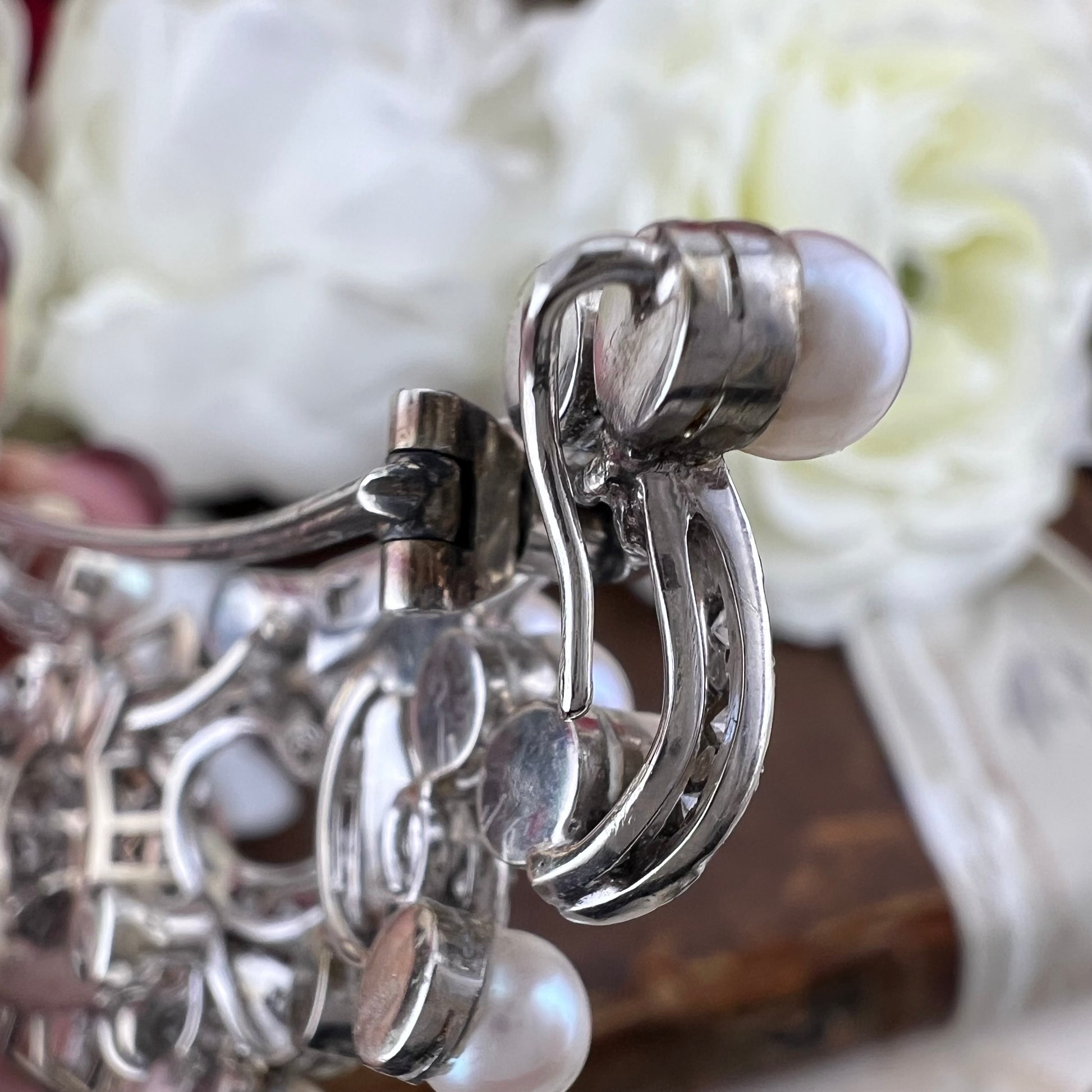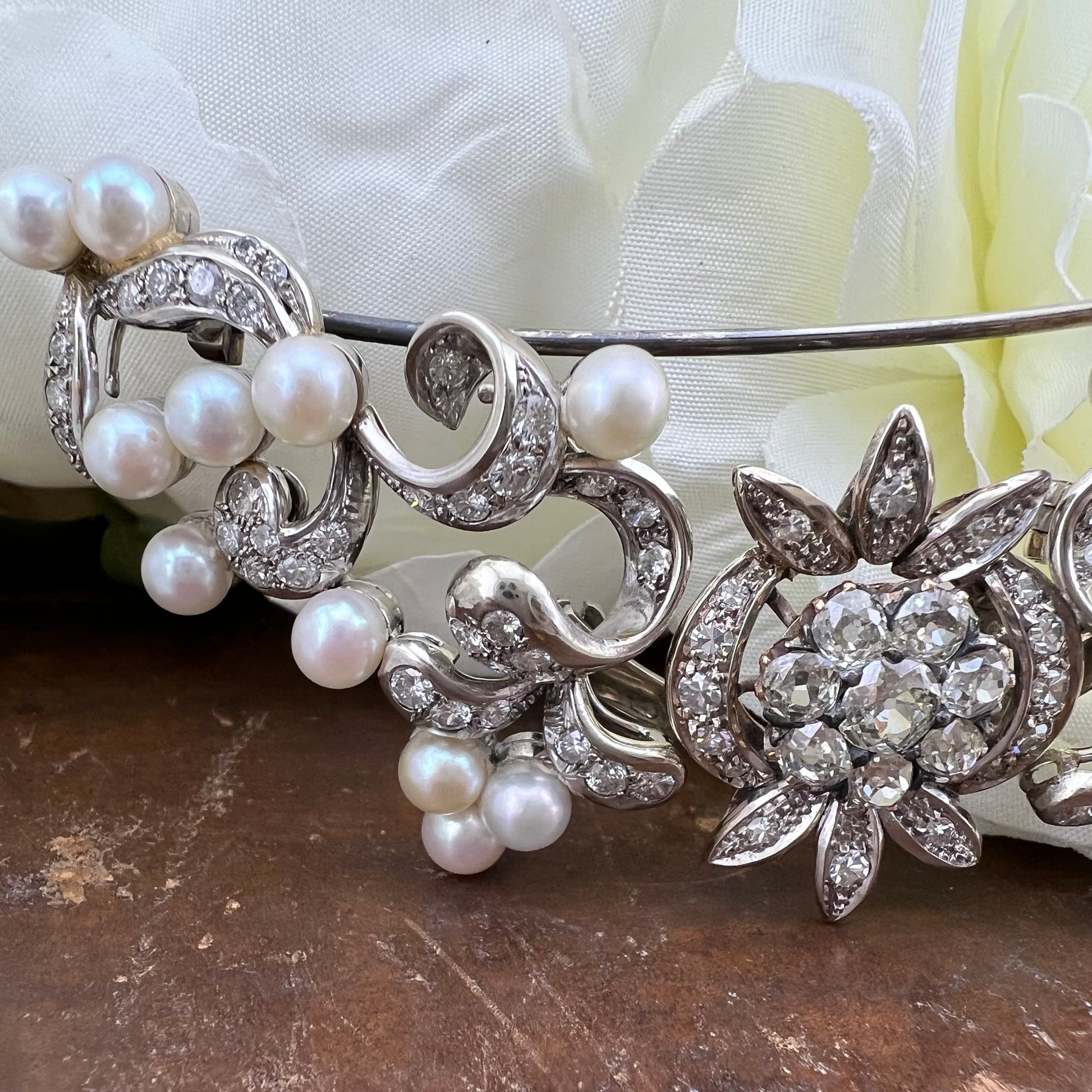 La composizione è dominata da un motivo floreale sinuoso, con volute armoniose che incorniciano un importante rosone centrale. Al centro, diamanti naturali taglio antico “old mine” sprigionano una luce morbida e profonda, esaltata dalla presenza di perle naturali Akoya, selezionate per la loro luminosità e delicate sfumature bianco-argentee e bianco-crema.