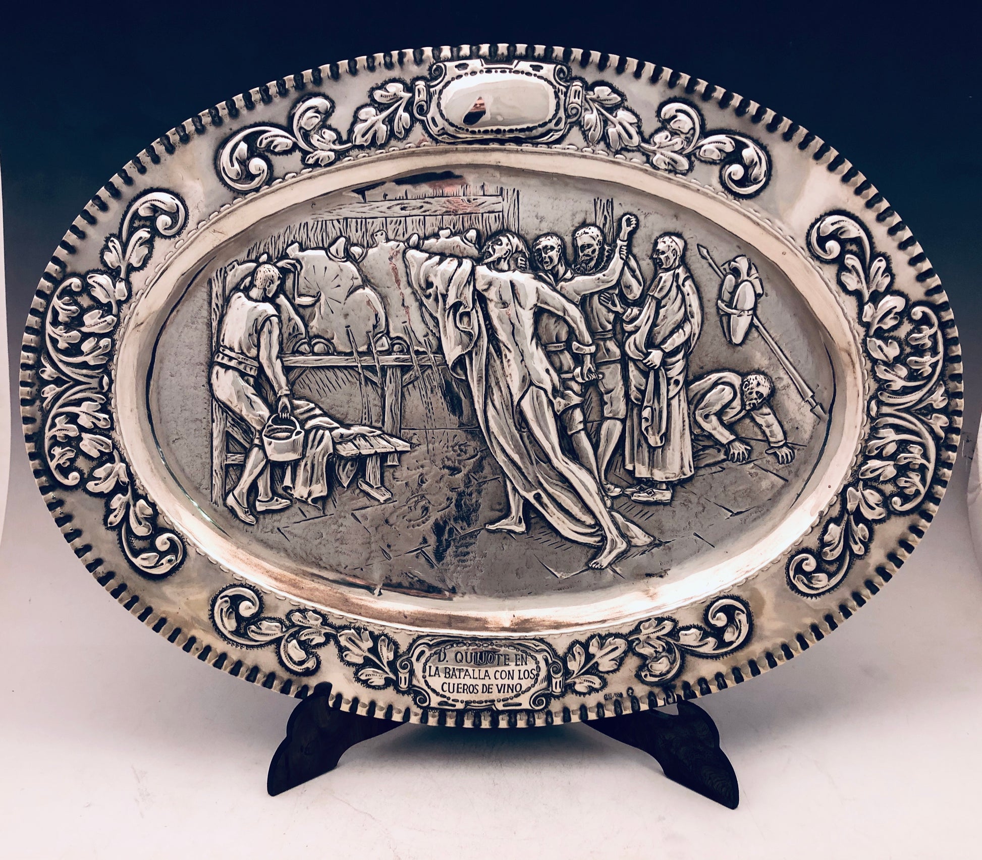 Ein silberner Zeremonienteller mit der Abbildung „Don Quijote spießt die Krüge auf“, Spanien, Anfang des 20. Jahrhunderts.
