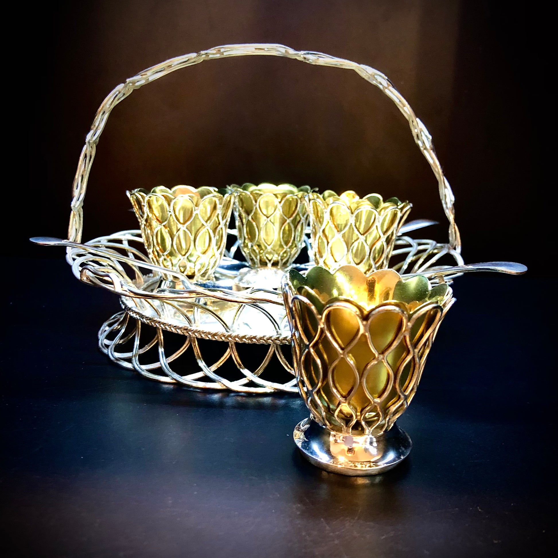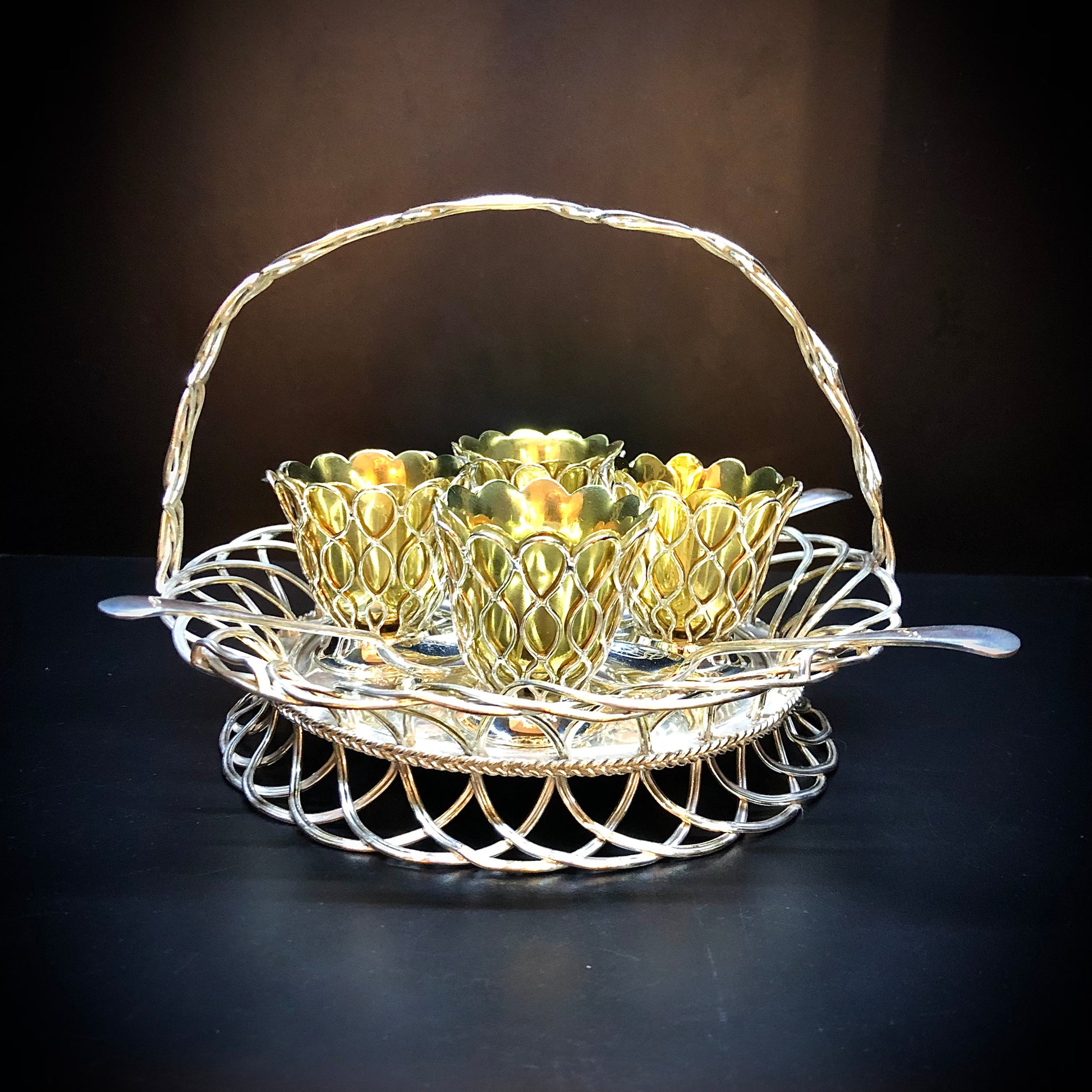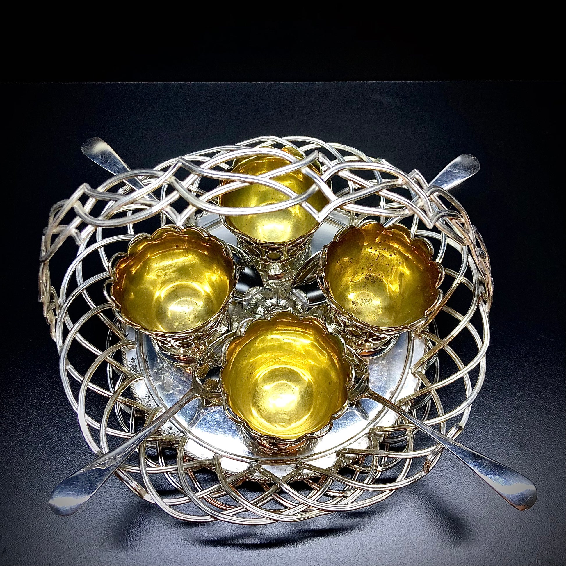 Ein seltenes Modell eines Korbes für vier Eier. Der Henkel ist wie der Boden und die Flügel geflochten. Die Näpfe sind vergoldet und mit dem Gehäuse verschraubt, das die gleichen dekorativen Motive aufweist. Vier Vertiefungen um die zentrale Blume herum halten die Löffelspitzen. Der Markt ist voll von Objekten mit gleicher Funktion, aber minderer Verarbeitungsqualität und Modellen. Dieses reizvolle Exemplar trägt die Elkington- Marken mit einem Jahresbuchstaben, der dem Jahr 1853 entspricht. Es ist daher aufgrund seines Designs und der prestigeträchtigen Signatur auf dem Höhepunkt seiner Kreativität (1853) selten.