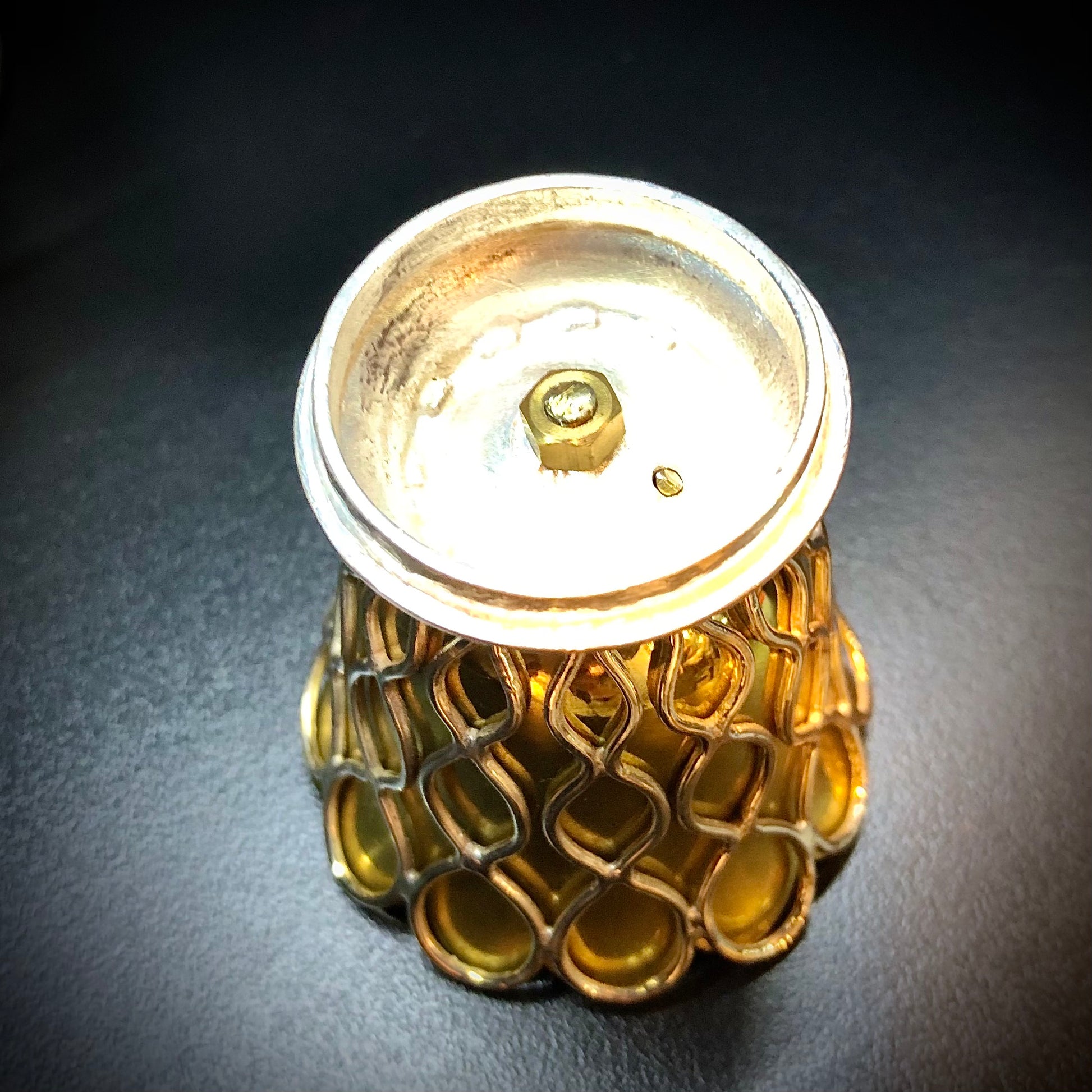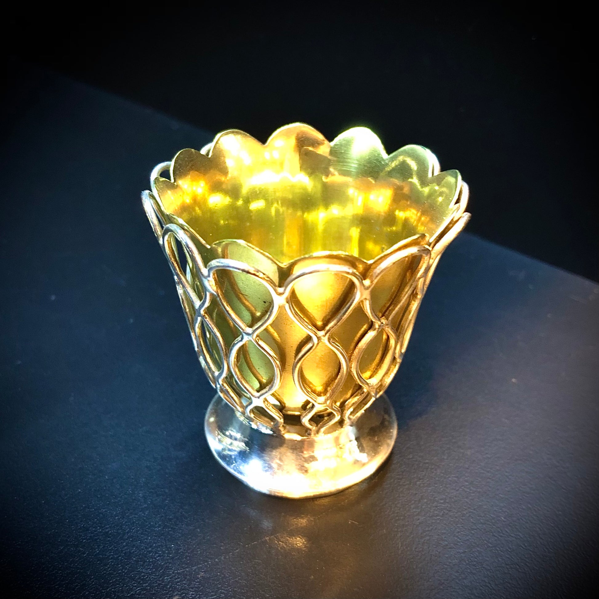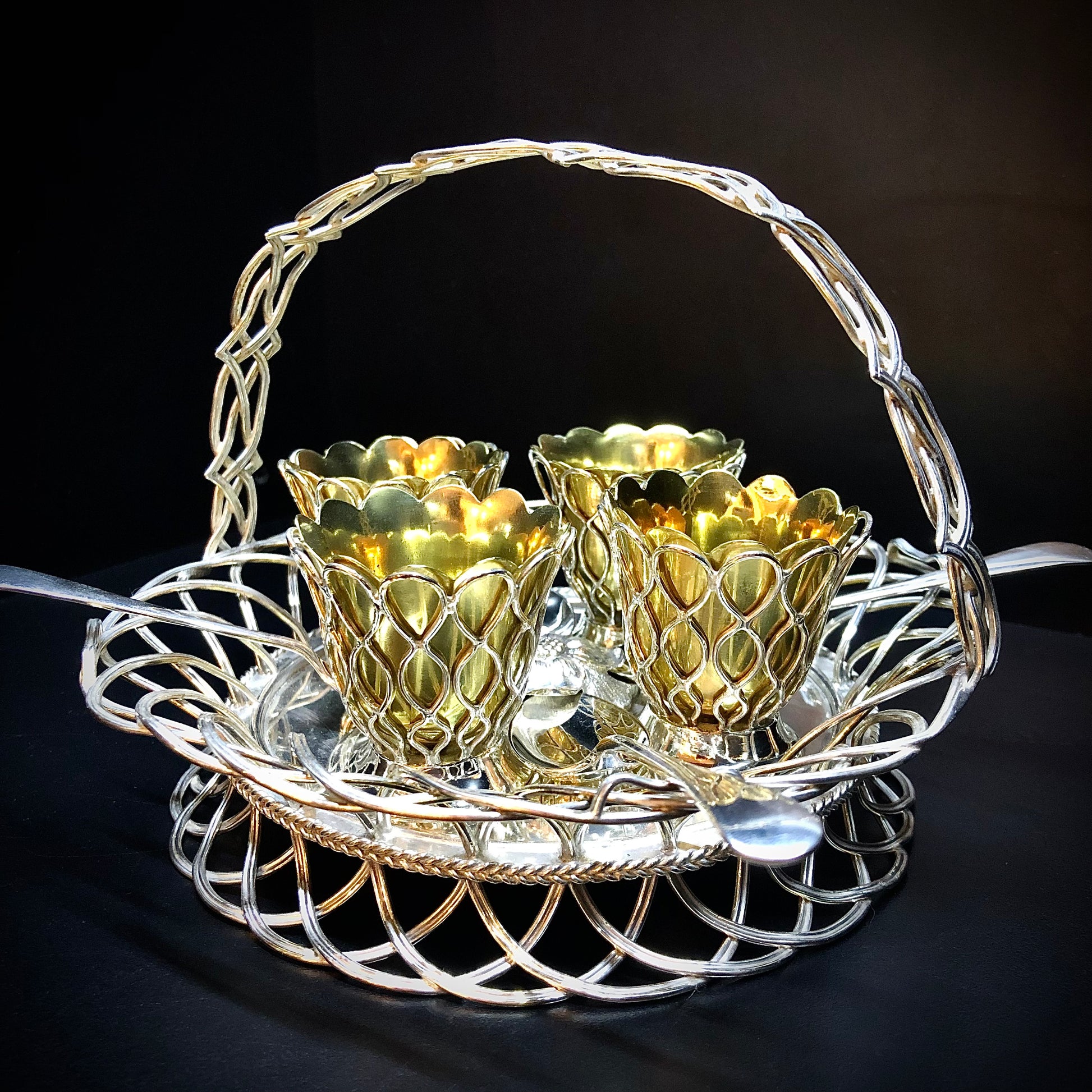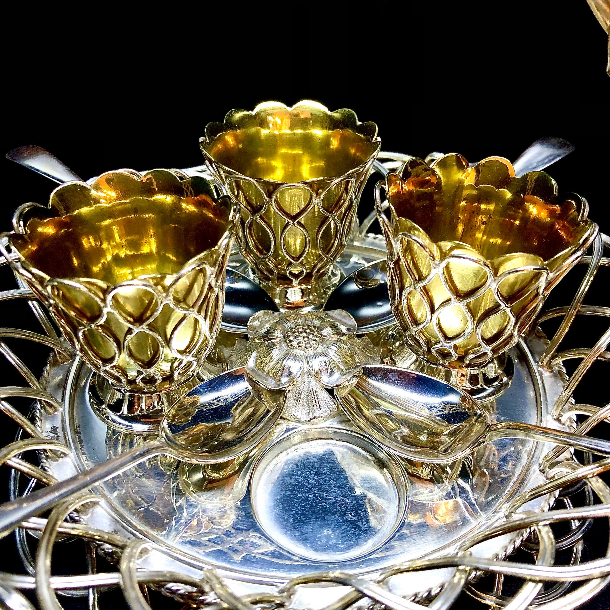 Ein seltenes Modell eines Korbes für vier Eier. Der Henkel ist wie der Boden und die Flügel geflochten. Die Näpfe sind vergoldet und mit dem Gehäuse verschraubt, das die gleichen dekorativen Motive aufweist. Vier Vertiefungen um die zentrale Blume herum halten die Löffelspitzen. Der Markt ist voll von Objekten mit gleicher Funktion, aber minderer Verarbeitungsqualität und Modellen. Dieses reizvolle Exemplar trägt die Elkington- Marken mit einem Jahresbuchstaben, der dem Jahr 1853 entspricht. Es ist daher aufgrund seines Designs und der prestigeträchtigen Signatur auf dem Höhepunkt seiner Kreativität (1853) selten.