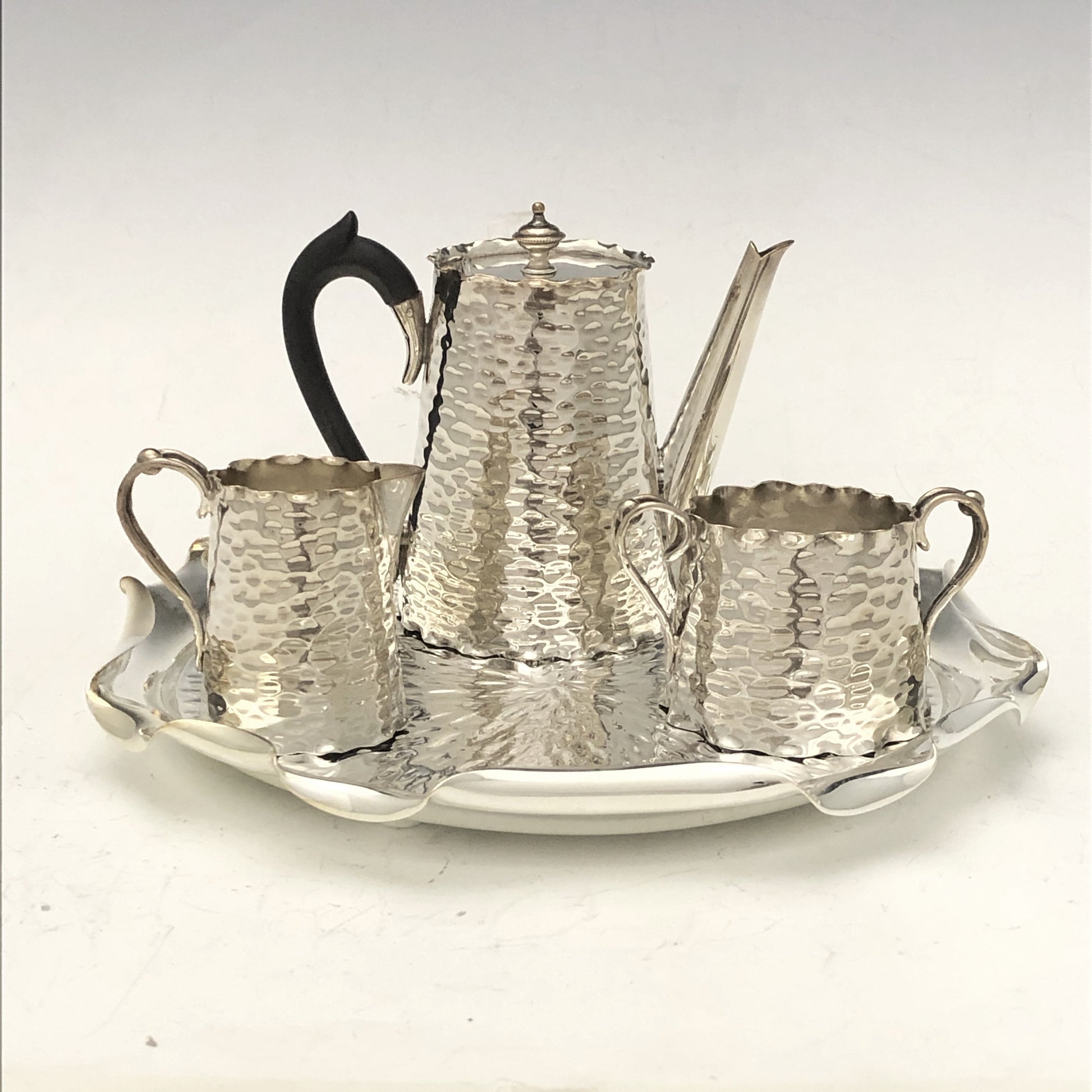 Kaffeeservice „Egoiste“, Modell „ Martelé “, mit Originaltablett. Sheffield-Teller, England, Anfang des 20. Jahrhunderts.