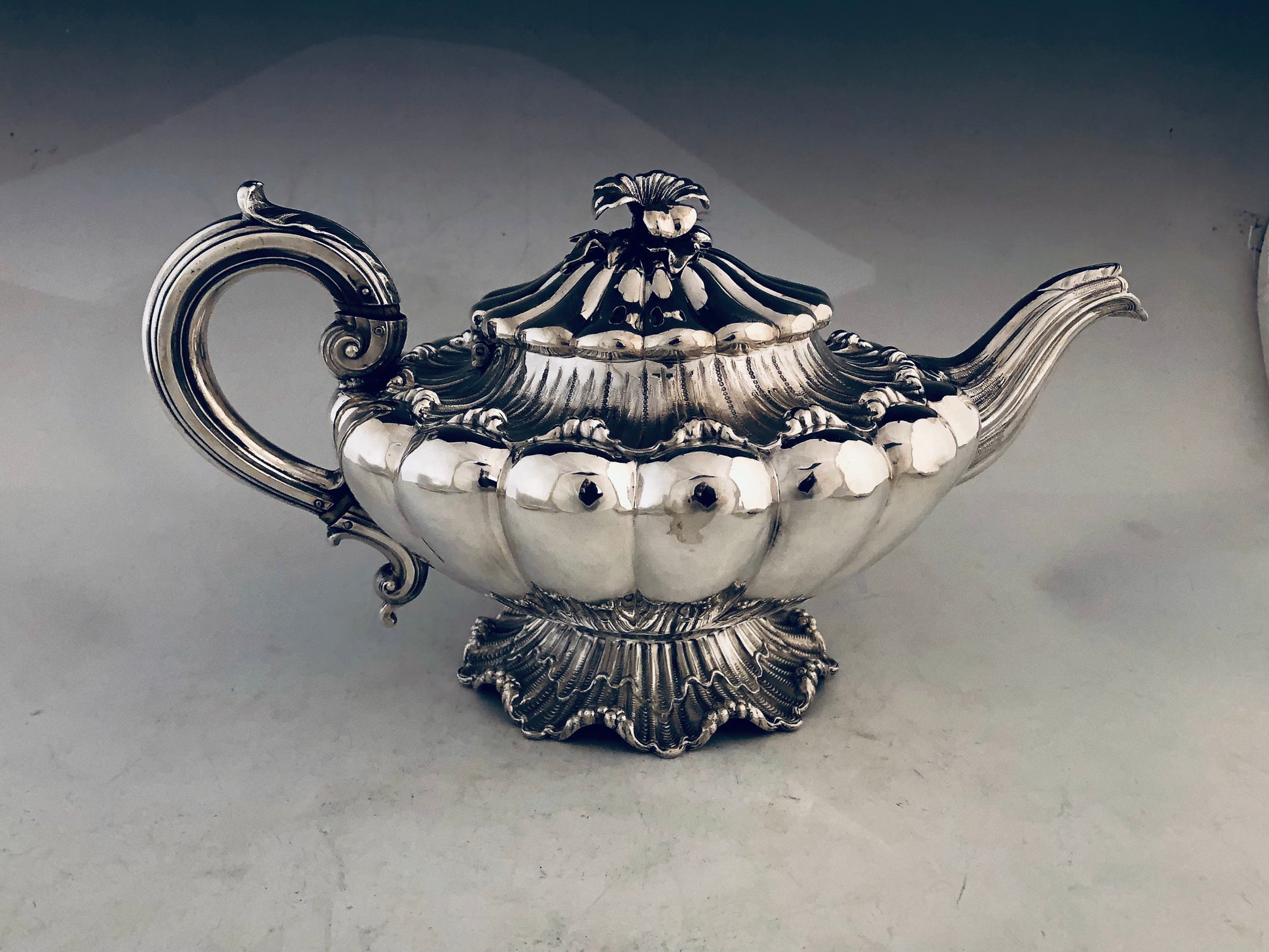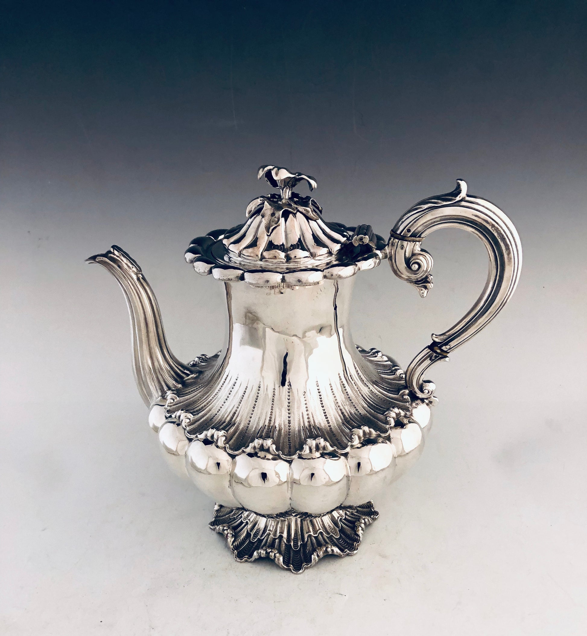 Ein silbernes Tee- und Kaffeeservice mit einem sehr seltenen, umrandeten Unterteil, gefertigt aus gemeißeltem Guss. Komplett mit Sahnekännchen und Zuckerdose mit innenliegenden Hörnern. Edward, Edward Jr., John & William Barnard, London, 1830.