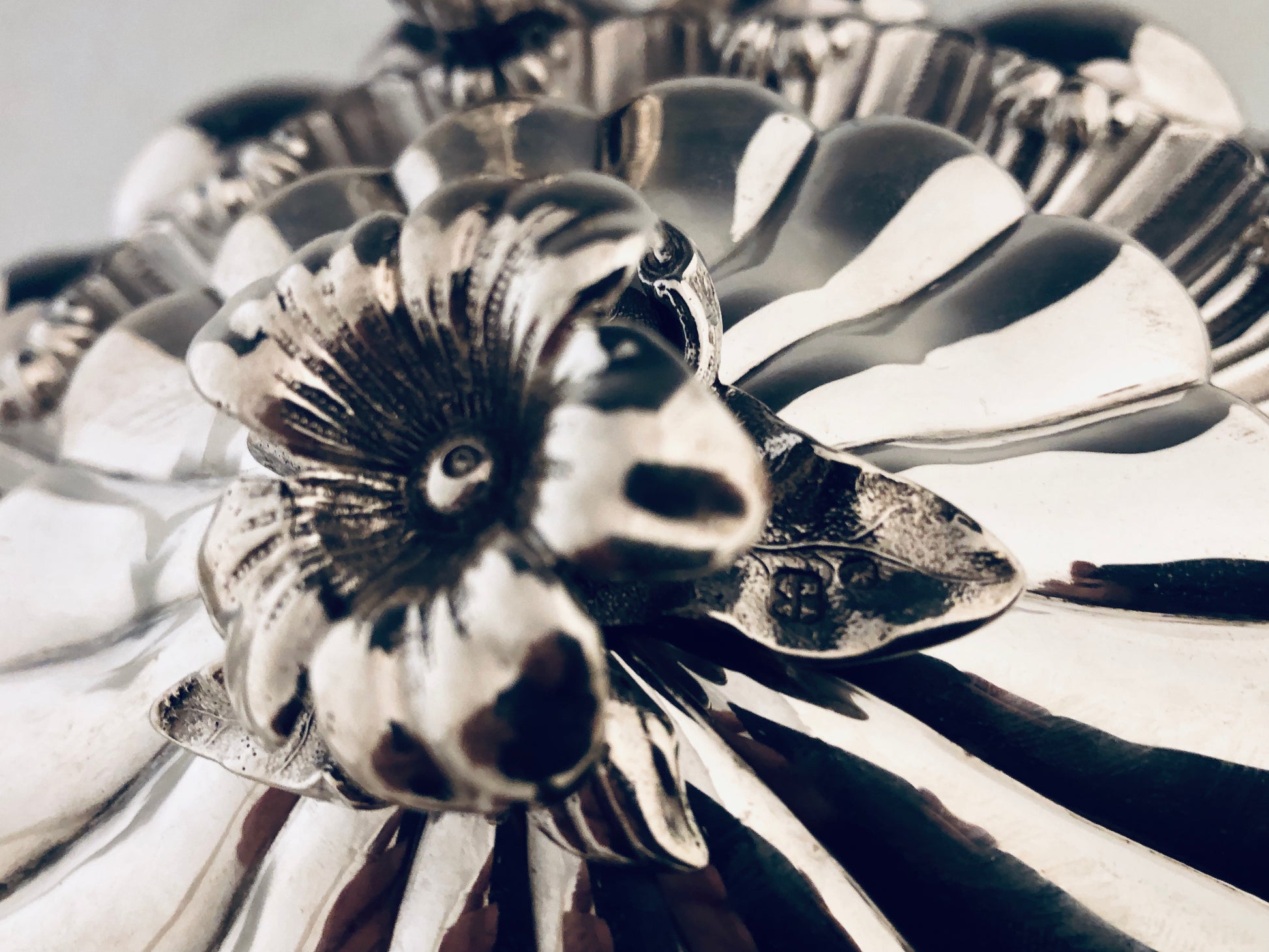 Äußerst seltenes Modell eines Tee- und Kaffeeservice mit Zuckerdose und Milchkännchen mit gepressten Kürbiskörpern und wunderbar gezacktem Oberteil.
