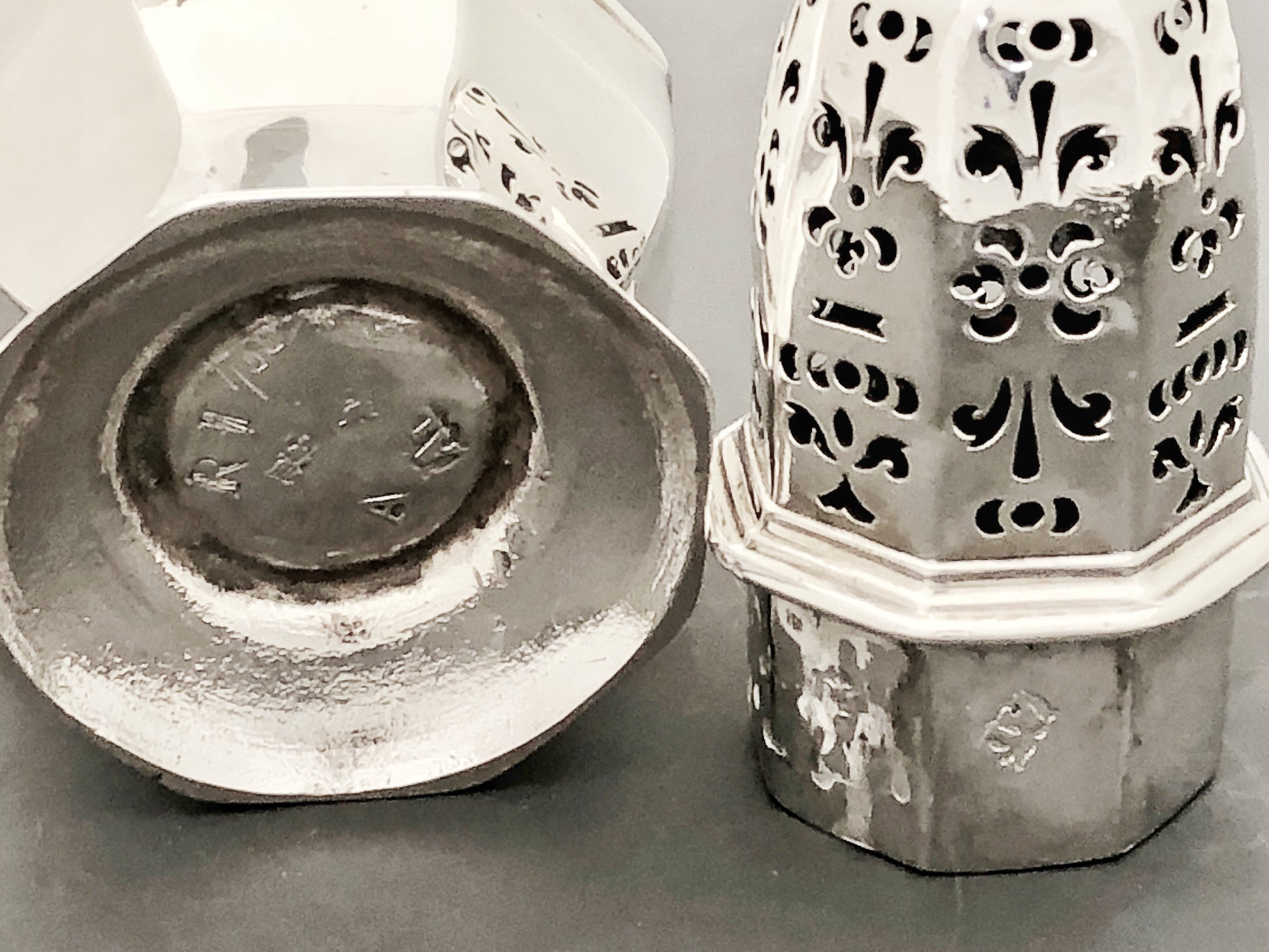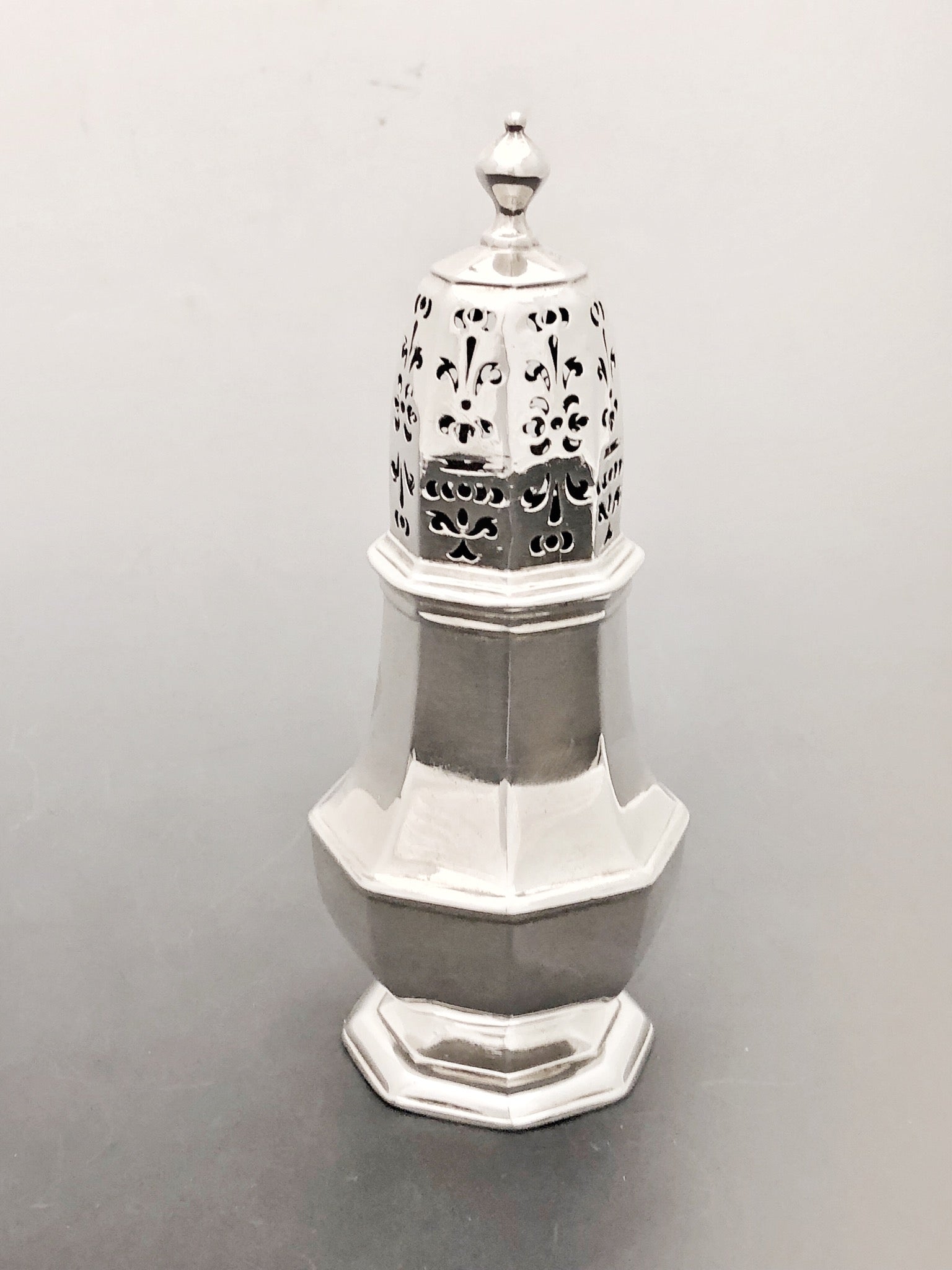 Ein äußerst seltener Zuckerstreuer aus der Zeit Georgs I., achteckig in der Form mit einem handdurchbrochenen, ineinandergreifenden Deckel. Hergestellt aus Silber in London im Jahr 1716.